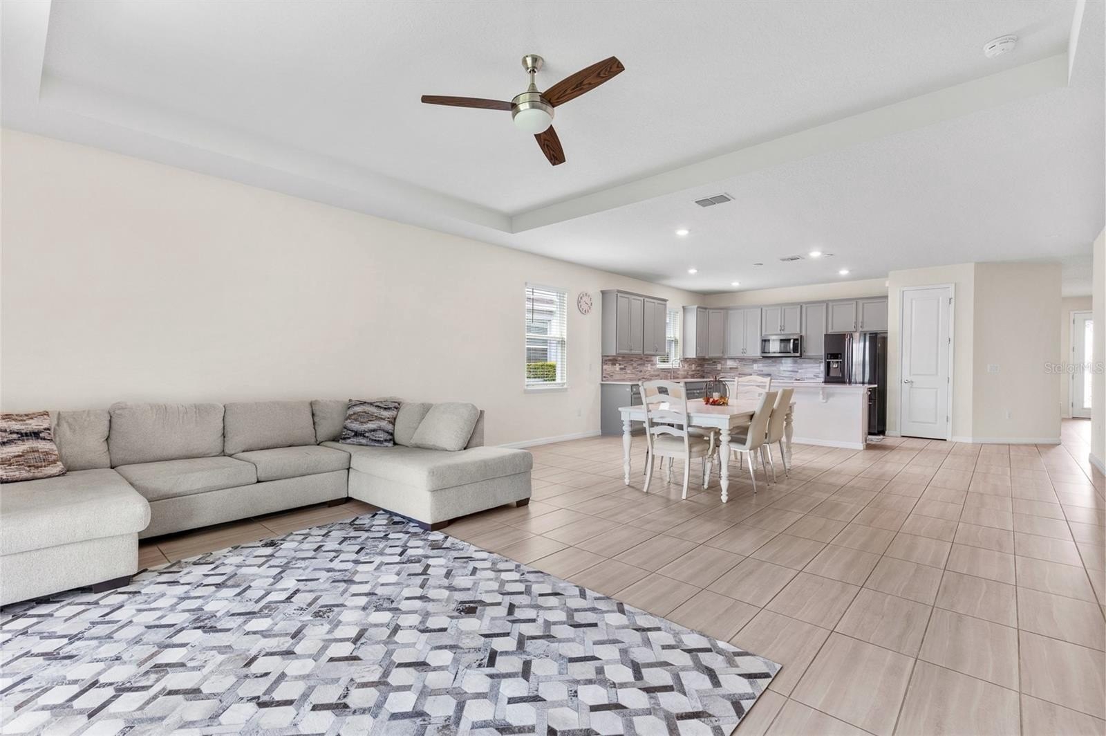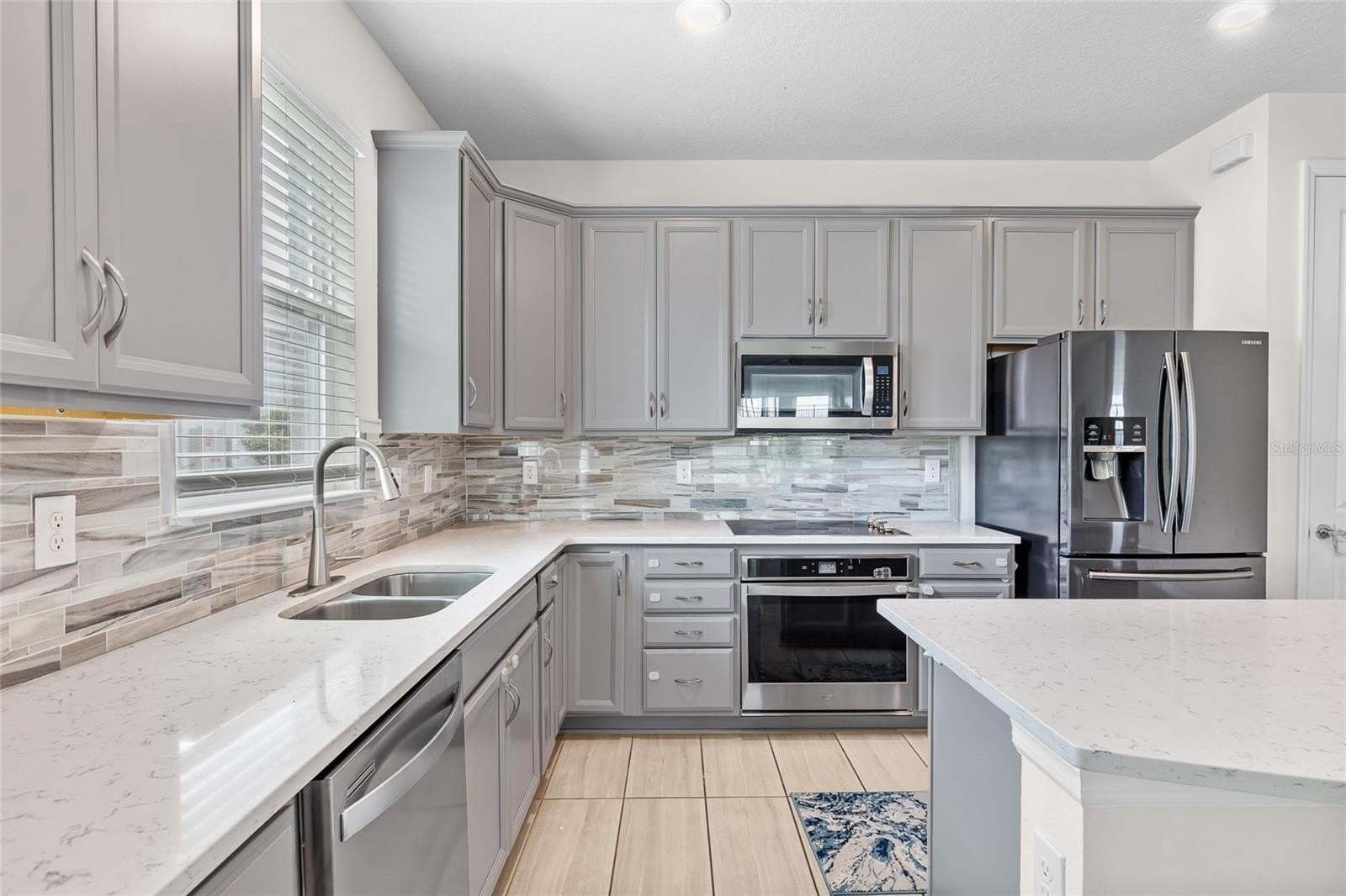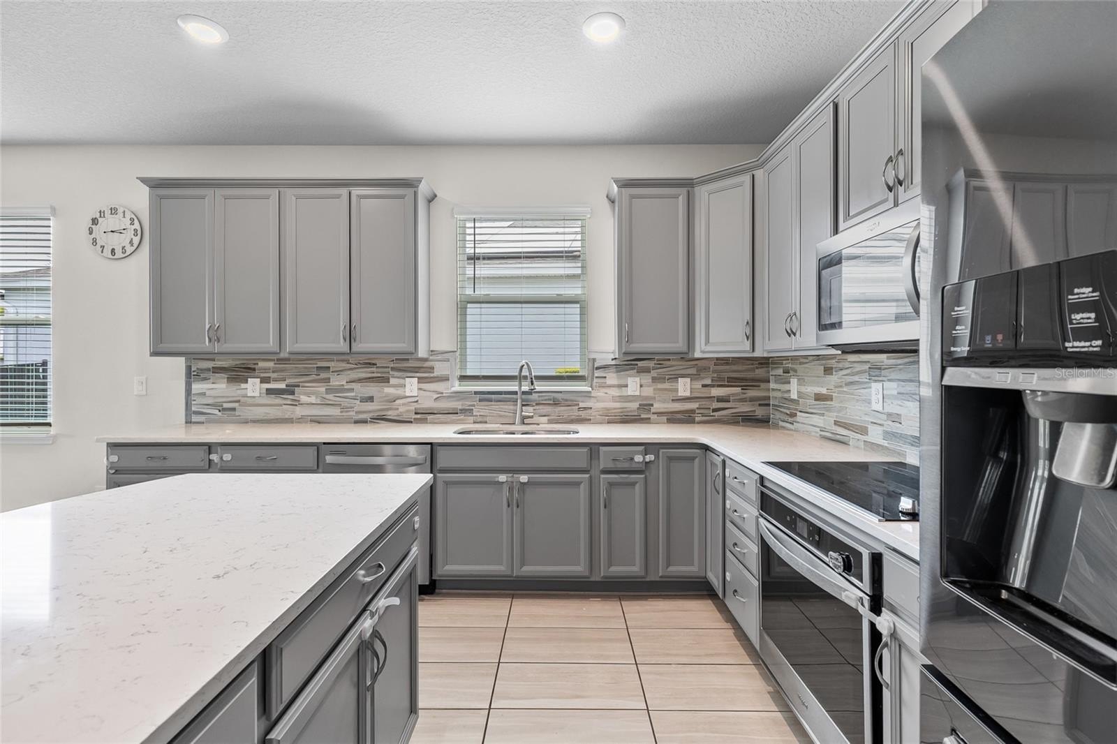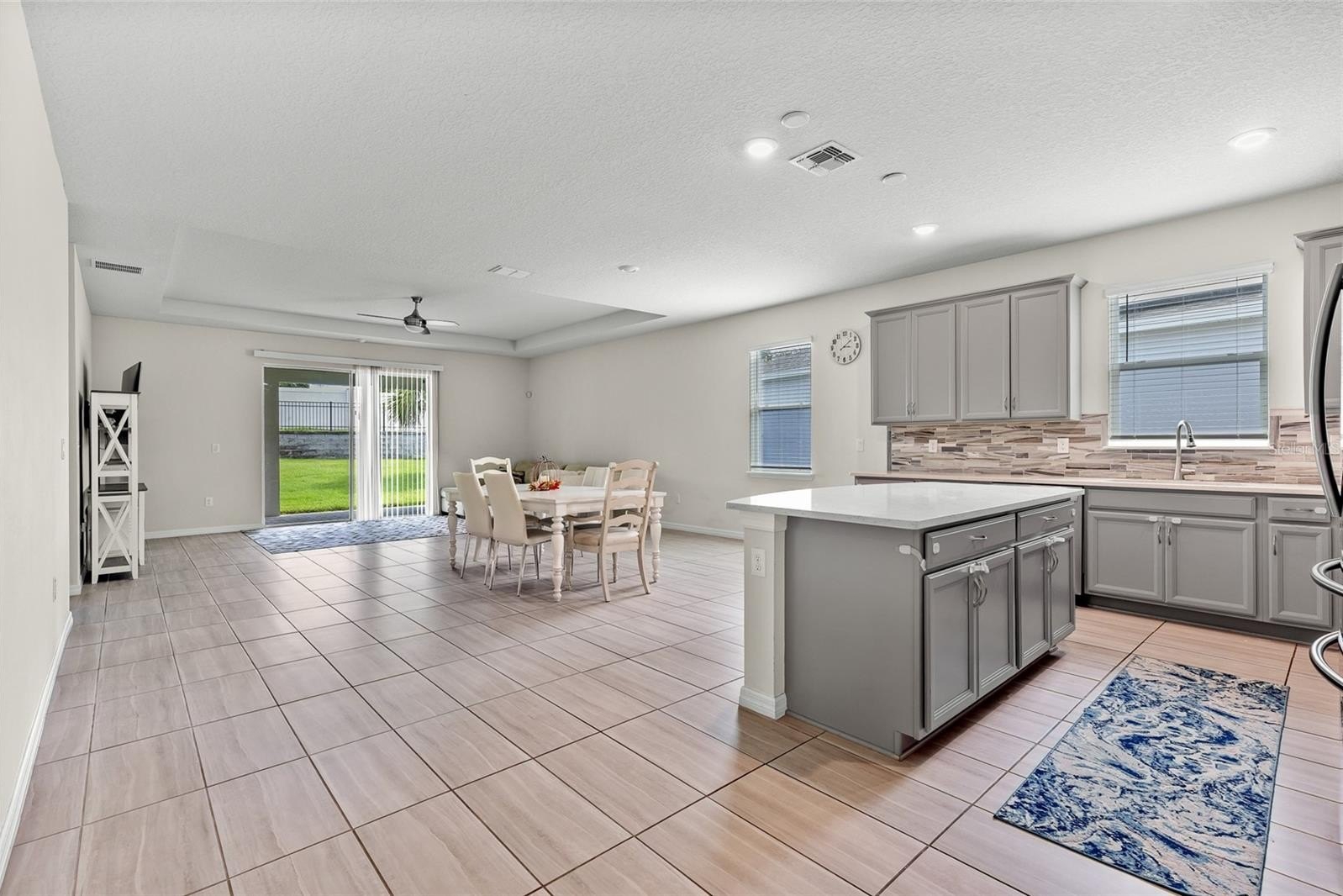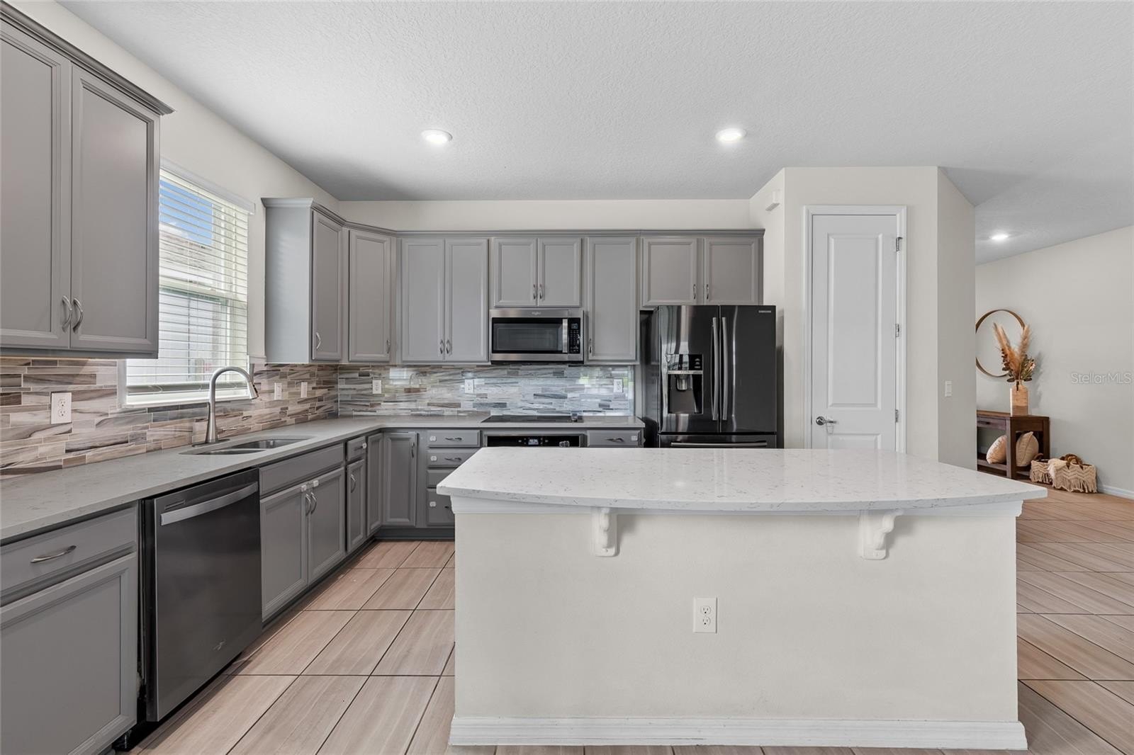 At the heart of the home, the kitchen stands out with sleek quartz countertops, stainless steel appliances, a stylish tile backsplash, and a spacious walk-in pantry. The oversized island is both functional and inviting, making it easy to serve meals, host game nights, or simply enjoy casual conversations while cooking. The adjoining dining and living areas are filled with natural light, providing an open, welcoming space for gatherings big or small.