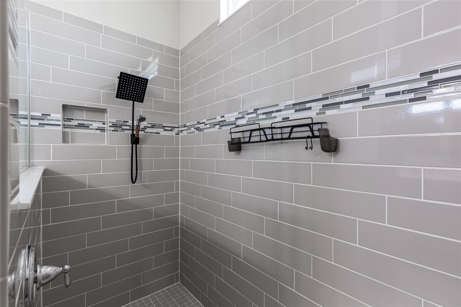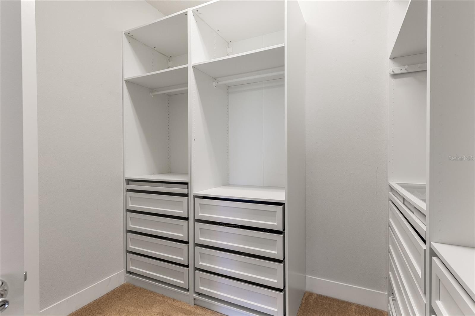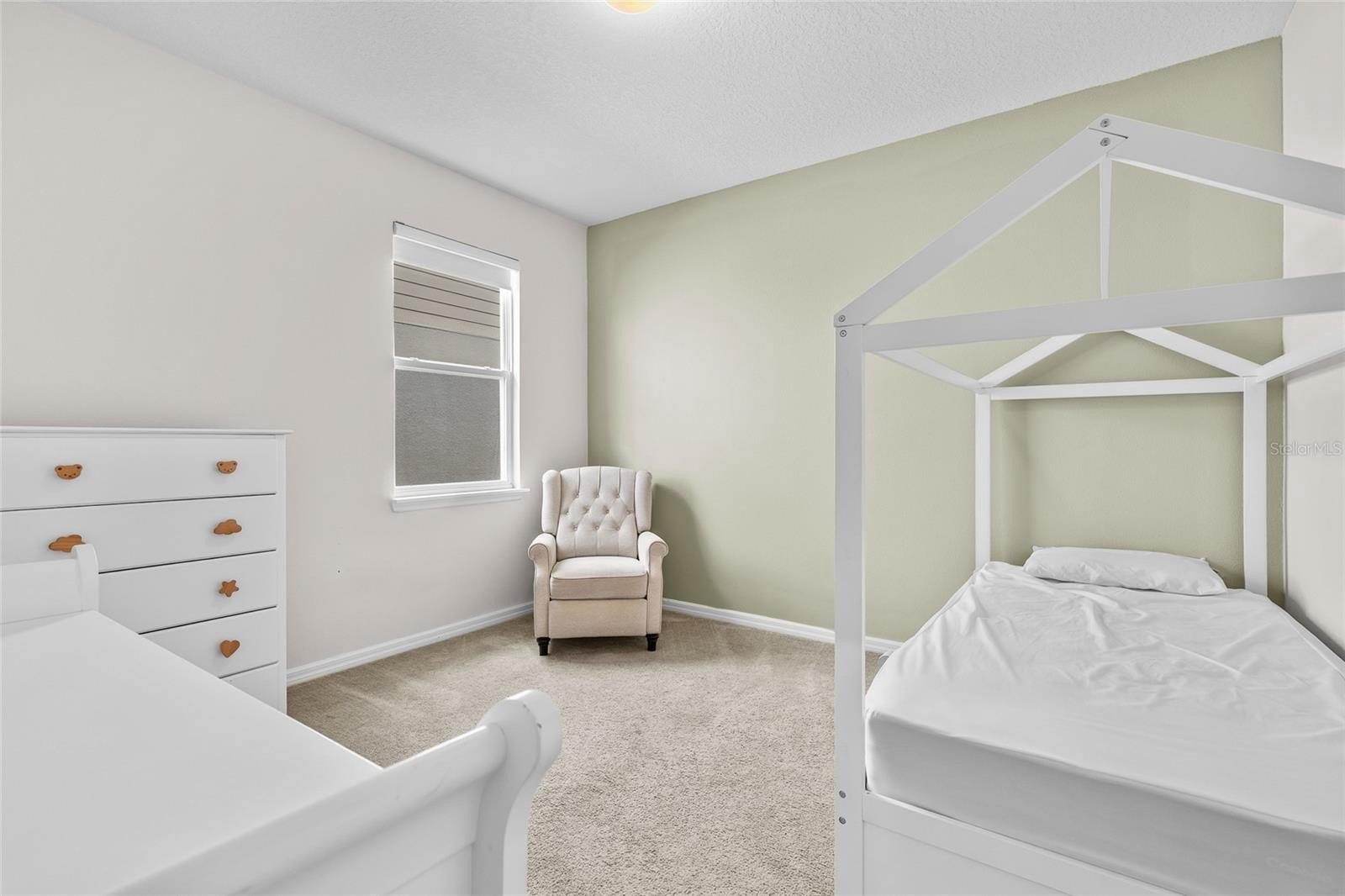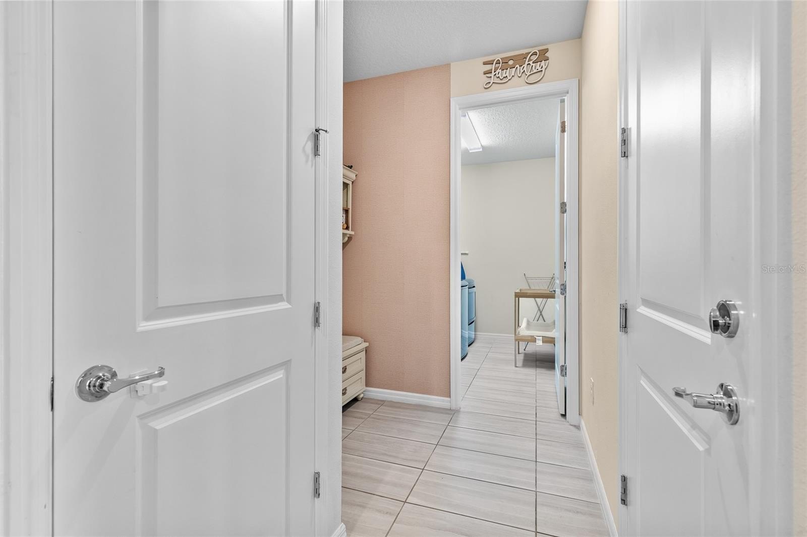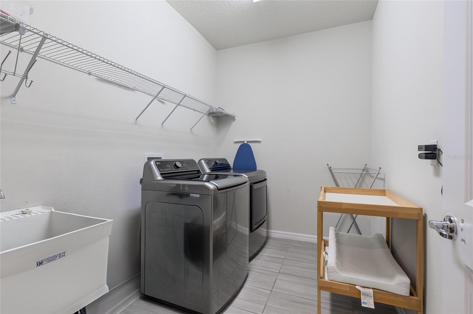 The primary suite offers a private retreat with soft carpet underfoot, a generous walk-in closet, and a spa-inspired bathroom featuring dual quartz vanities and a walk-in shower. Two additional bedrooms and a full bathroom with modern finishes provide comfort and flexibility for family or guests. A thoughtfully designed laundry room with built-in shelving adds extra convenience and storage.