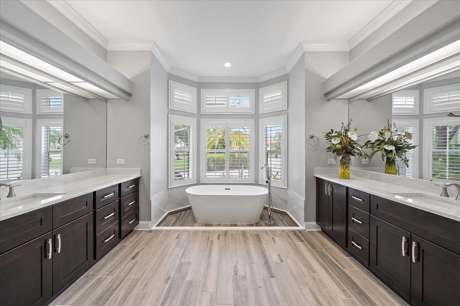 Step outside and fall in love with your outdoor oasis: a sparkling heated pool, spa, outdoor kitchen, covered hangout areas, even an outdoor shower and pool bath. It’s like having your own private resort in the backyard!