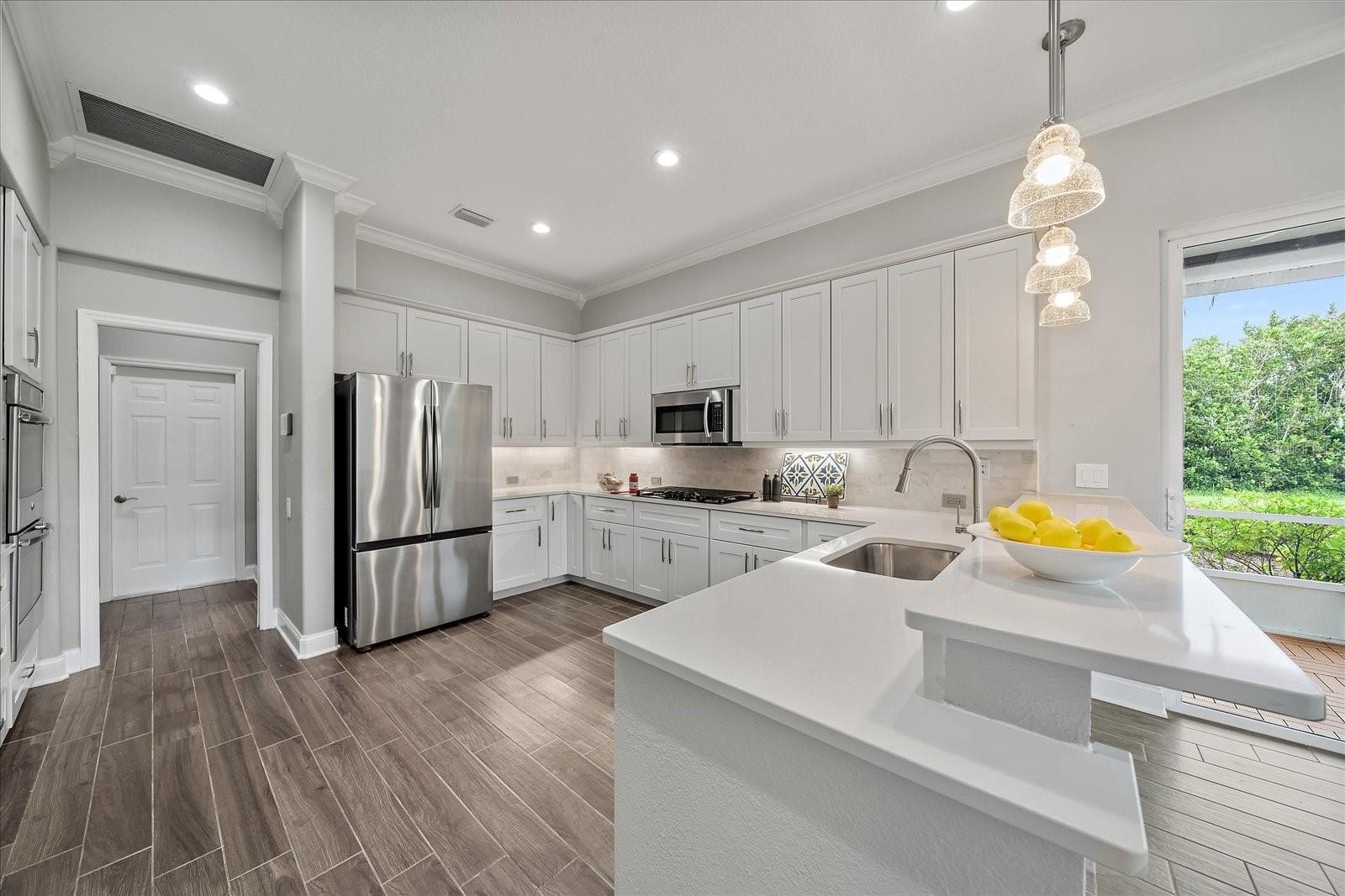 Other extras you’ll love: soaring ceilings with arches and custom millwork, a dramatic staircase, plantation shutters, crown molding, a HUGE 3-car garage with storage, and lush landscaping all around.