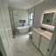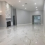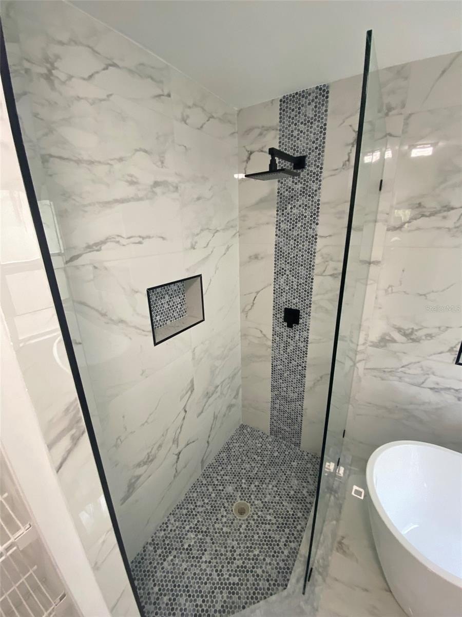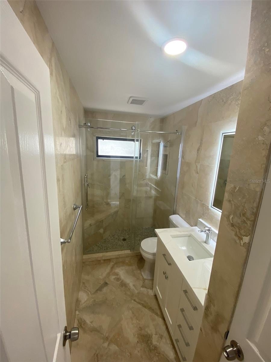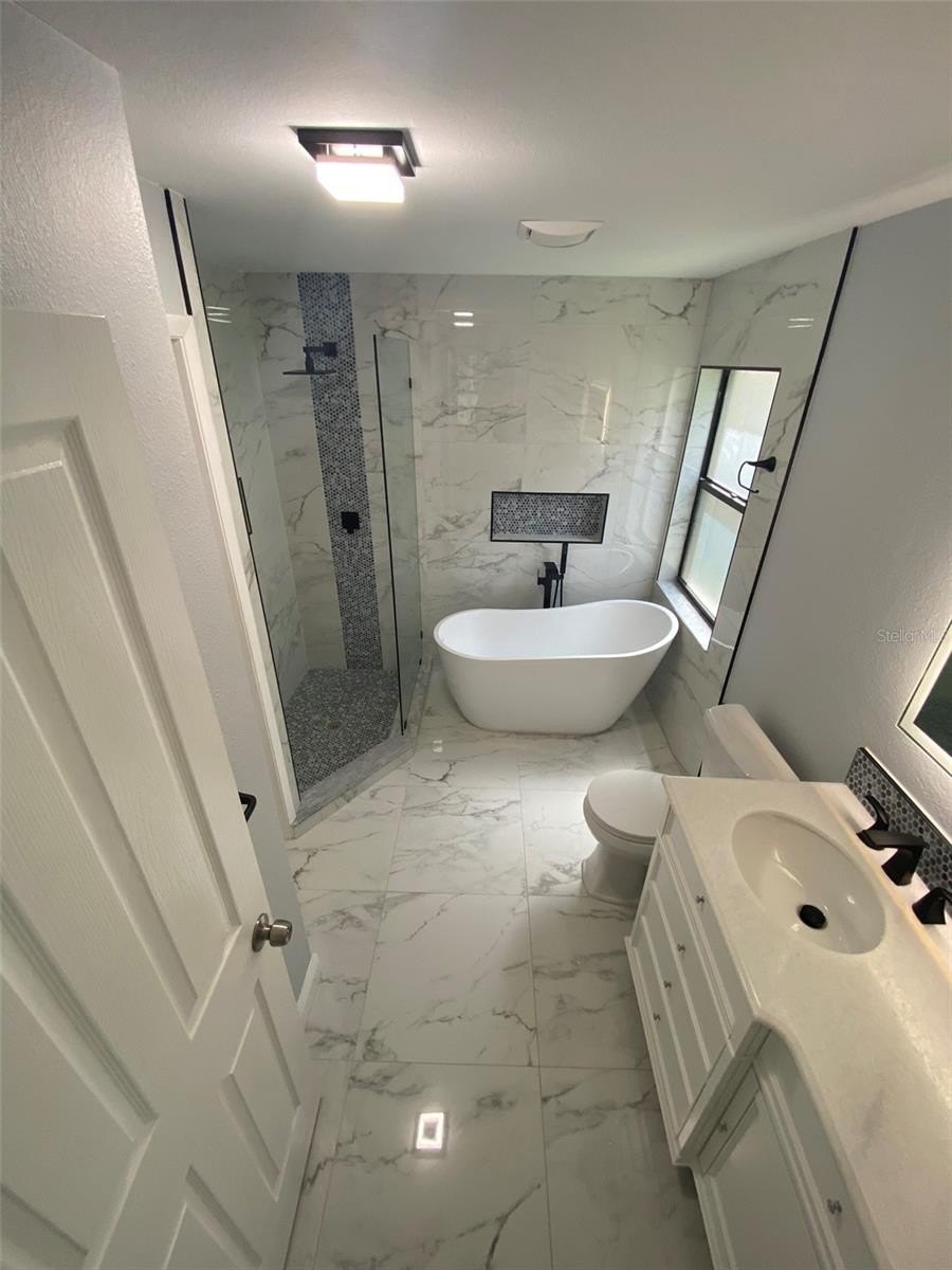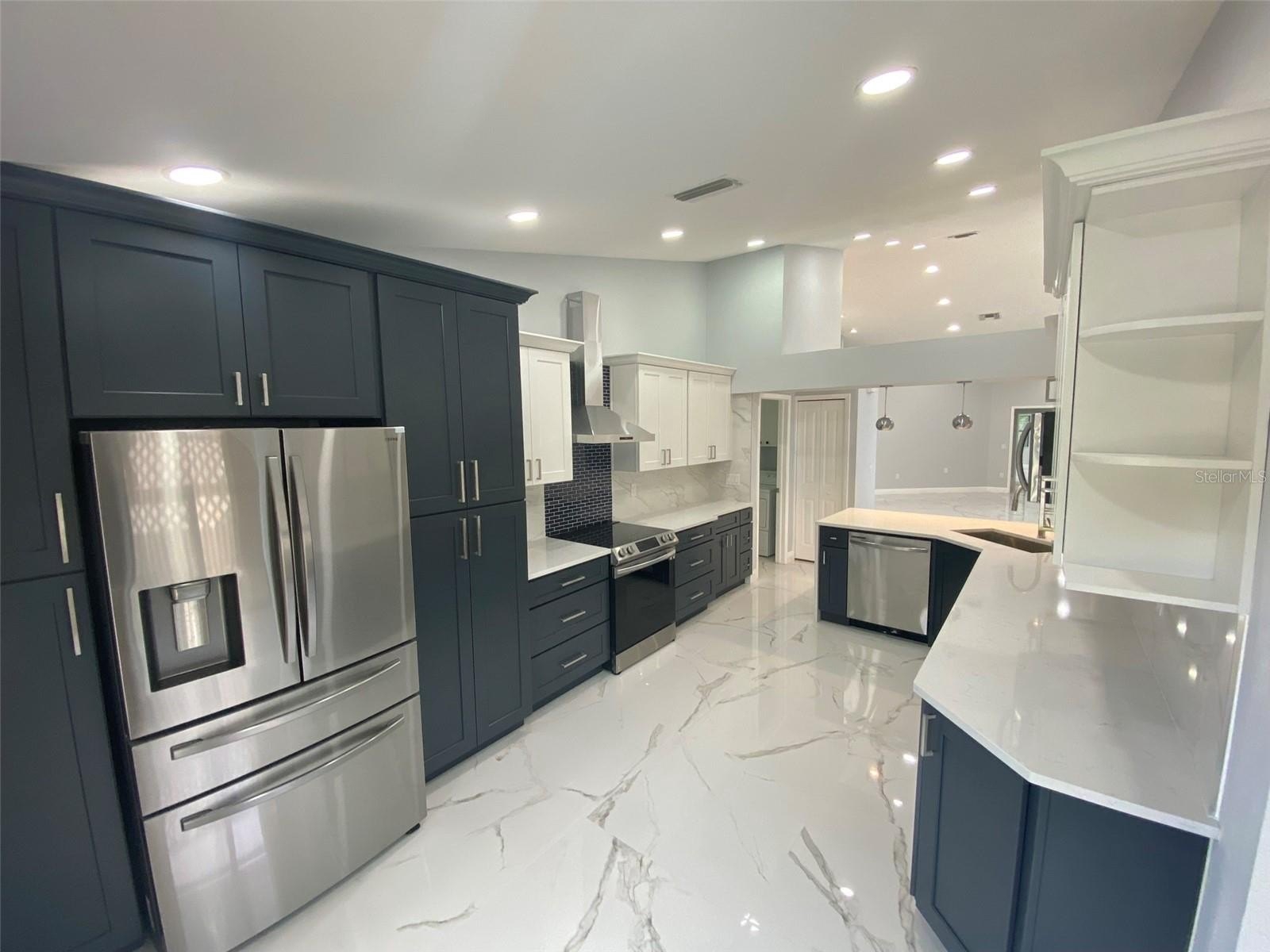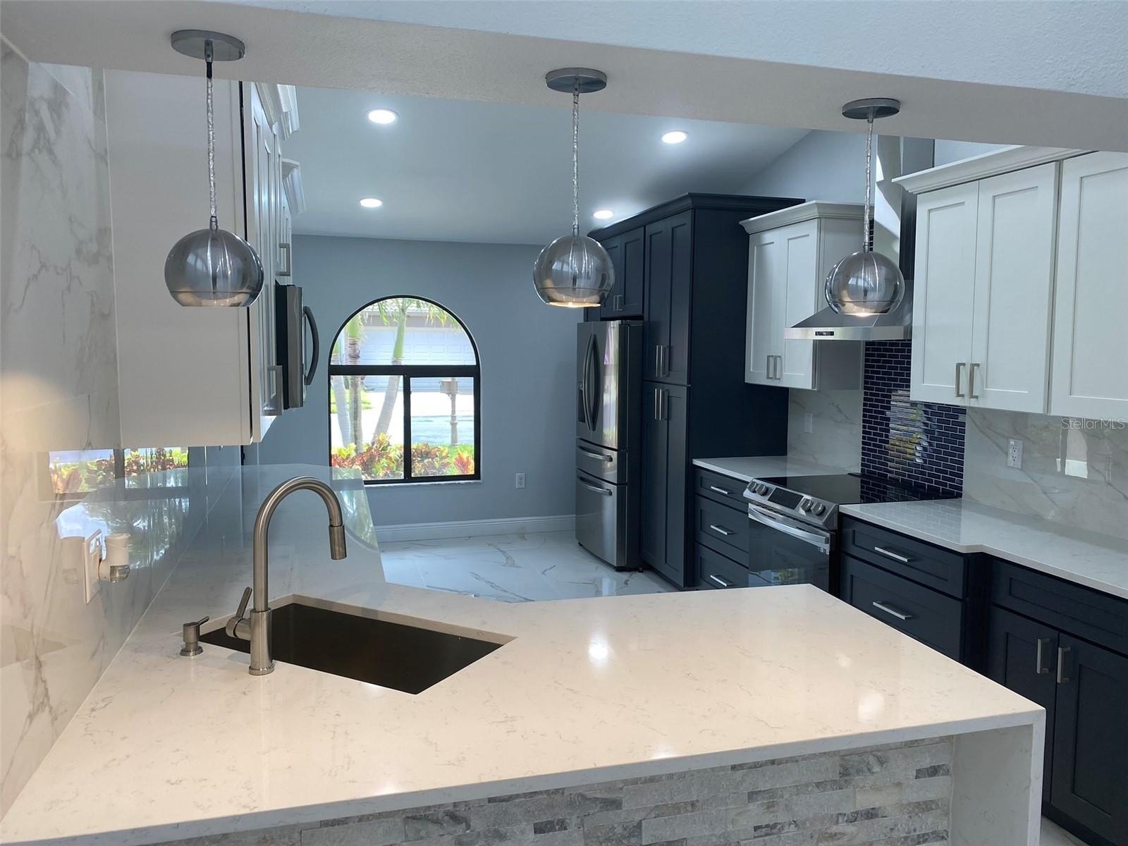 The remodeled kitchen is a standout, showcasing quartz countertops, soft-close wood cabinets, stainless steel appliances, a sleek range hood, and a designer porcelain backsplash. The primary suite overlooks the tranquil pond and includes a large walk-in closet, a luxurious soaking tub, and a unique shower with a temperature-sensitive color-changing faucet.