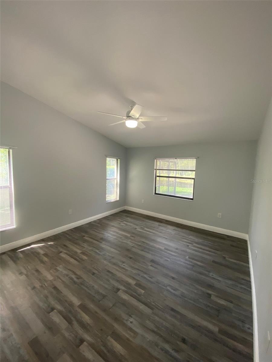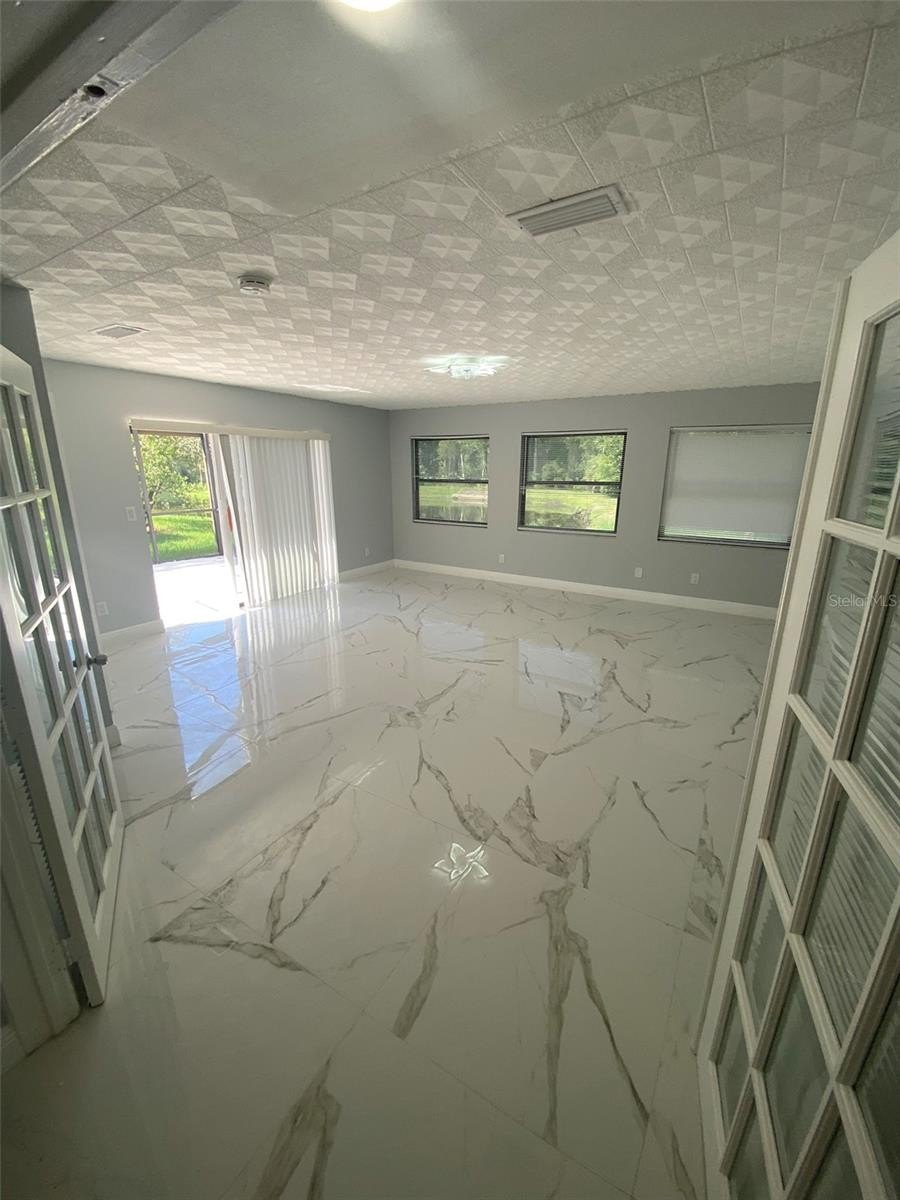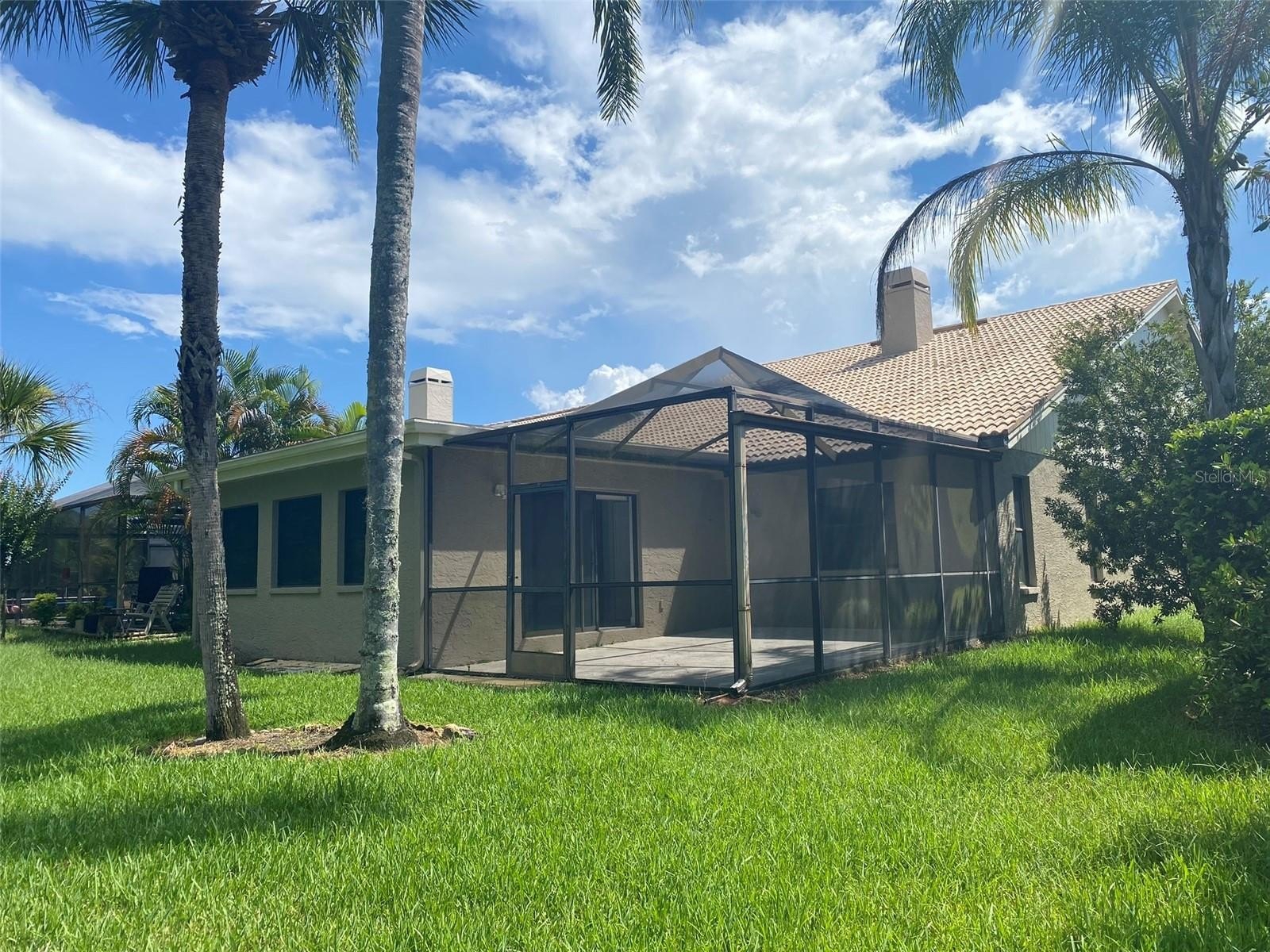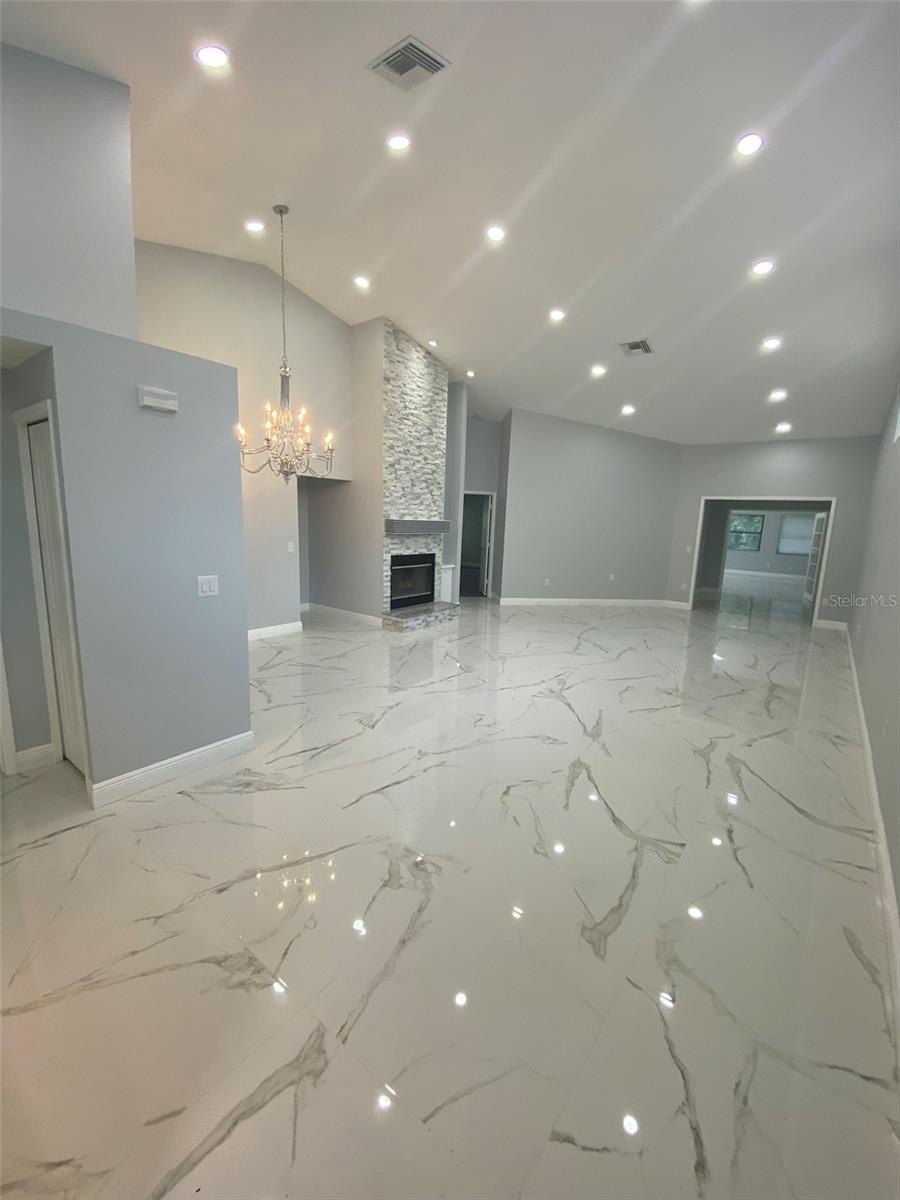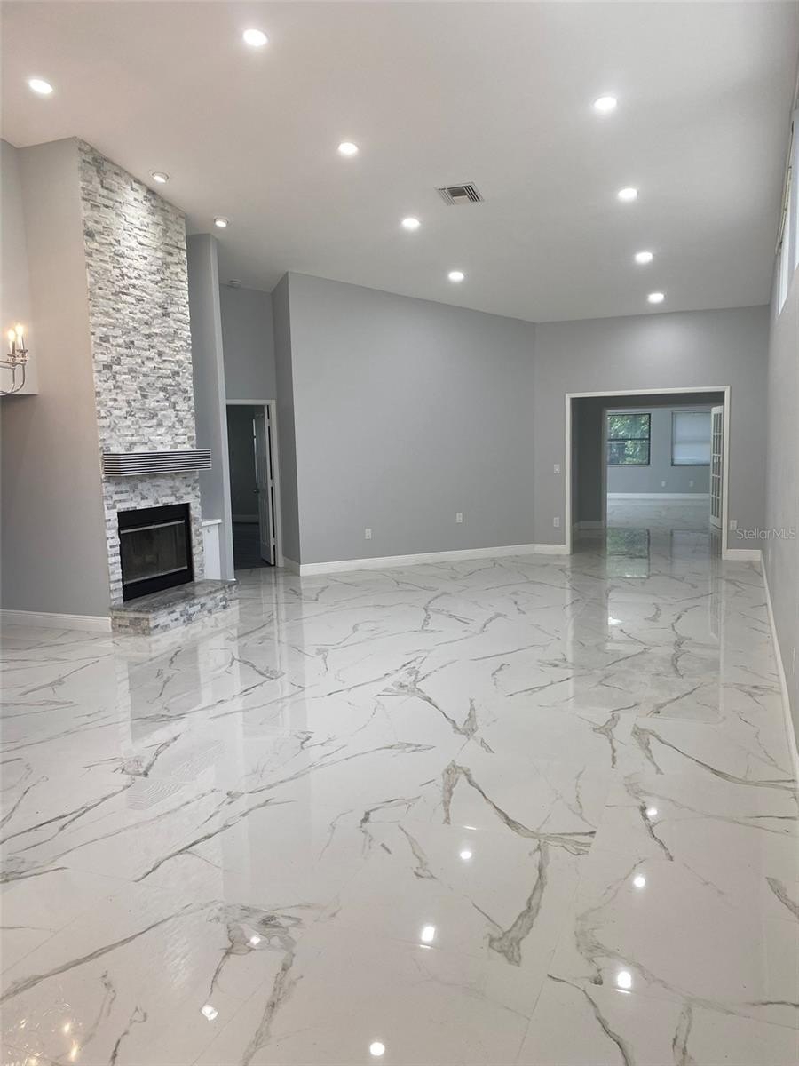 Welcome to this beautifully updated 3-bedroom, 2-bath home with a versatile 4th bonus room, perfectly situated on a peaceful lot with serene pond and woodland views. This move-in-ready home features high ceilings, elegant porcelain tile flooring, fresh interior paint, new blinds, and modern ceiling fans throughout. The spacious living area is highlighted by a custom stone fireplace and built-in shelves with LED lighting, creating a warm and inviting atmosphere.