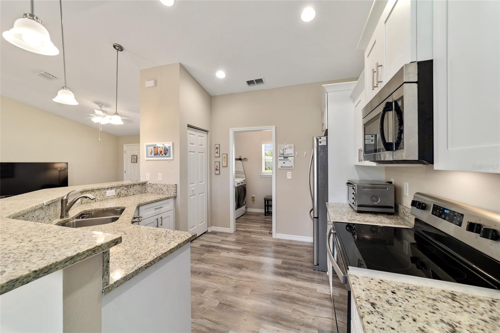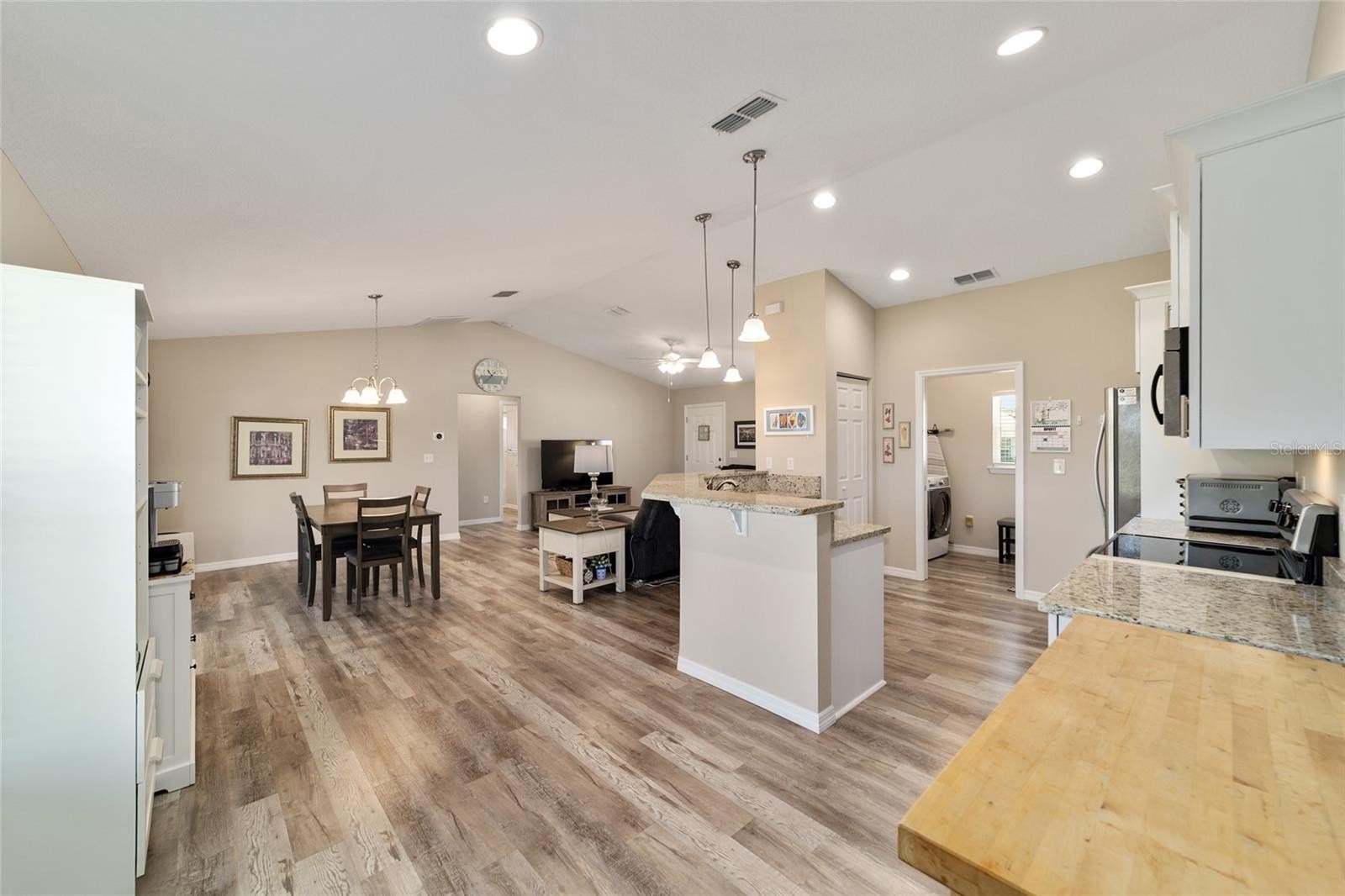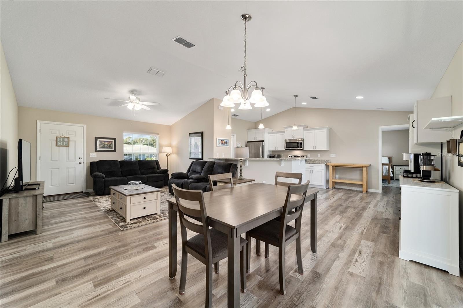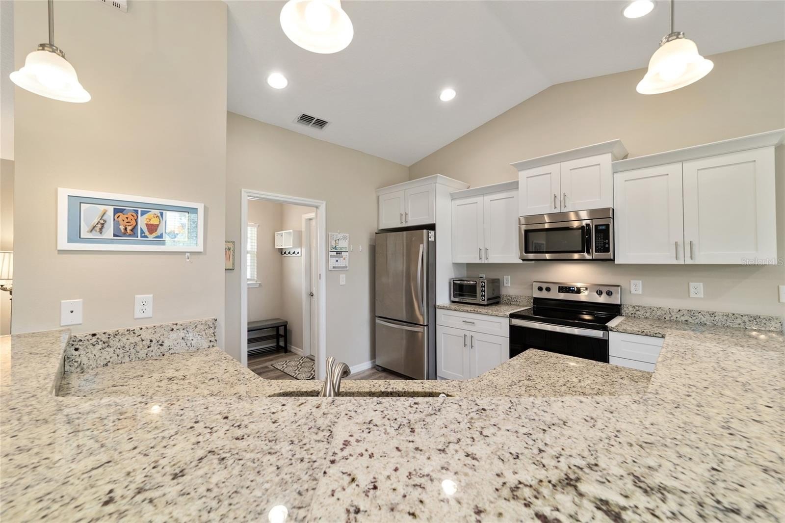 Vaulted ceilings and luxury vinyl plank flooring create a bright and cohesive look throughout. The spacious living room flows seamlessly into the dining area and gourmet kitchen, perfect for entertaining or everyday living. The kitchen features soft-close cabinetry, stainless steel appliances and sleek granite countertops. A thoughtful split floor plan ensures privacy: the primary suite, accommodating a king-sized bed, includes a walk-in closet and ensuite bathroom. Two additional bedrooms share a well-appointed bathroom with a granite countertop vanity