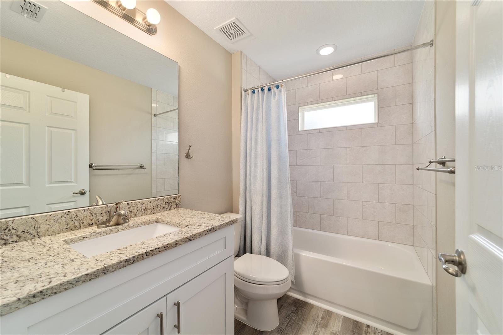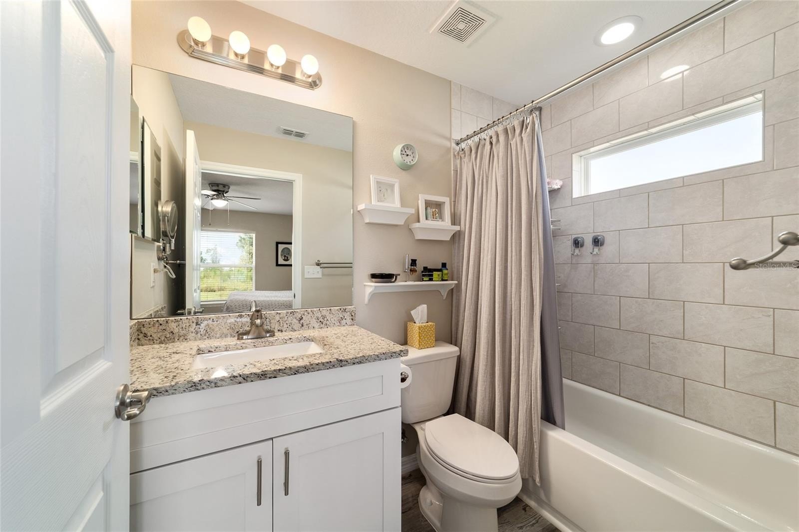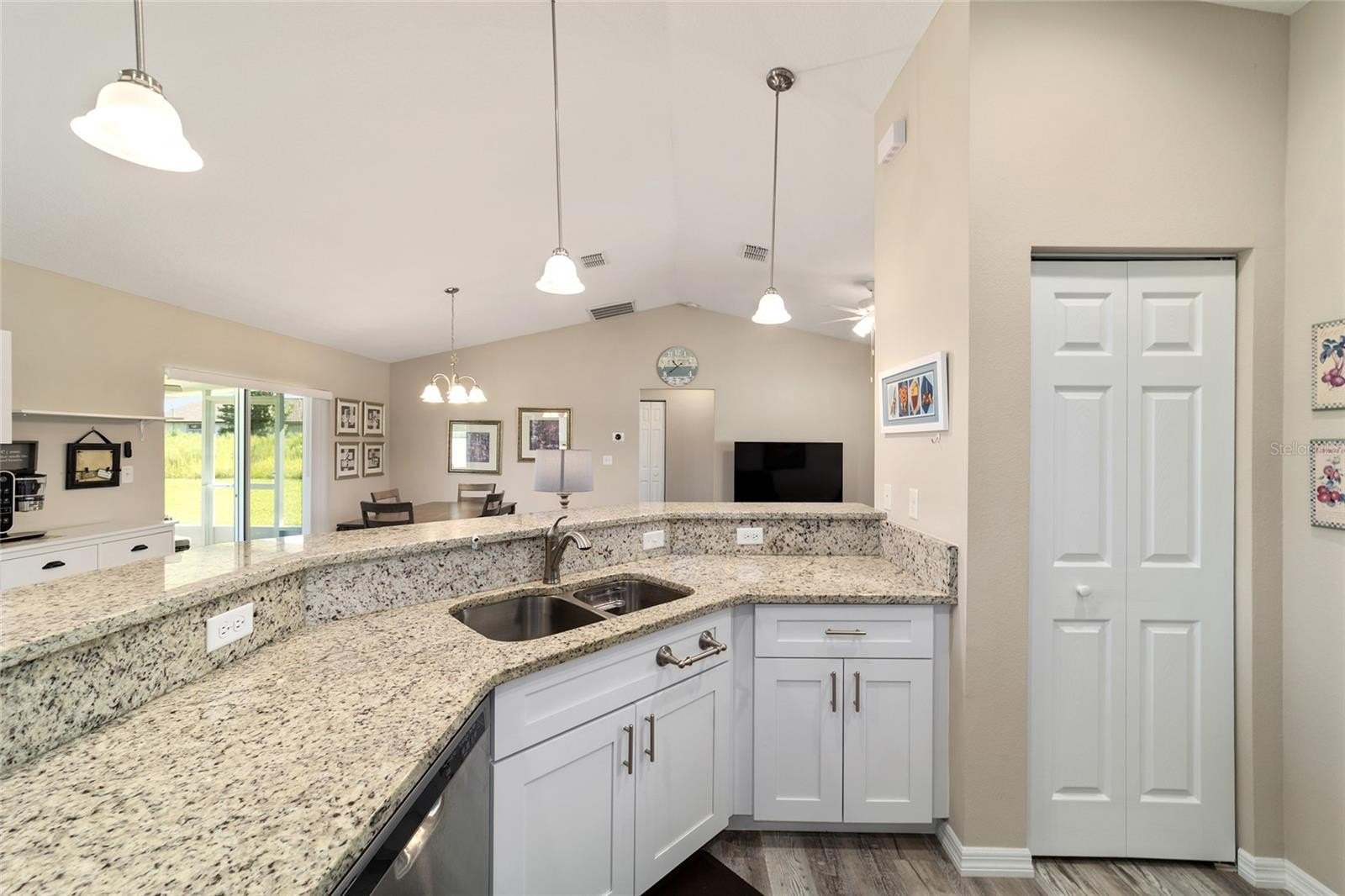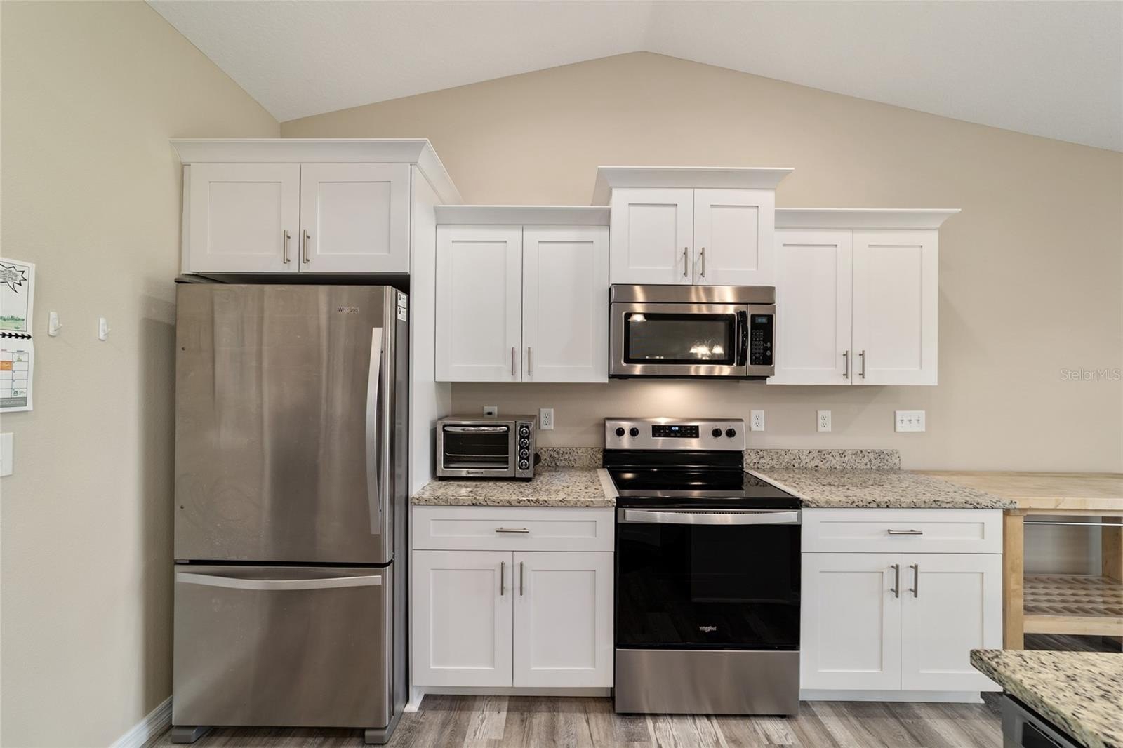 Vaulted ceilings and luxury vinyl plank flooring create a bright and cohesive look throughout. The spacious living room flows seamlessly into the dining area and gourmet kitchen, perfect for entertaining or everyday living. The kitchen features soft-close cabinetry, stainless steel appliances and sleek granite countertops. A thoughtful split floor plan ensures privacy: the primary suite, accommodating a king-sized bed, includes a walk-in closet and ensuite bathroom. Two additional bedrooms share a well-appointed bathroom with a granite countertop vanity