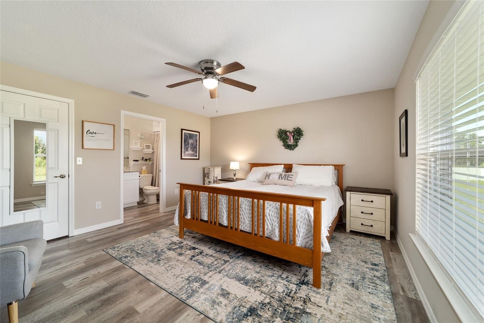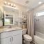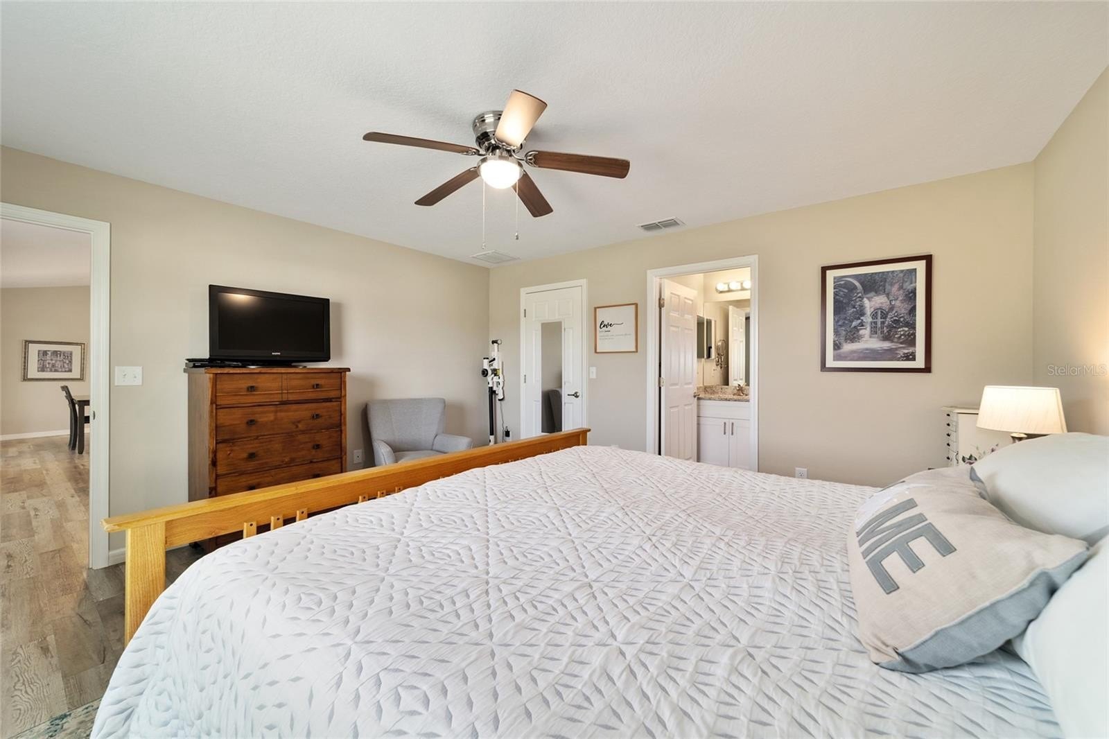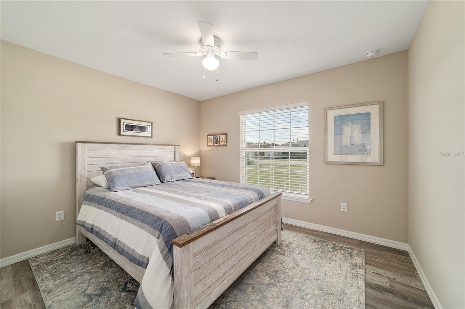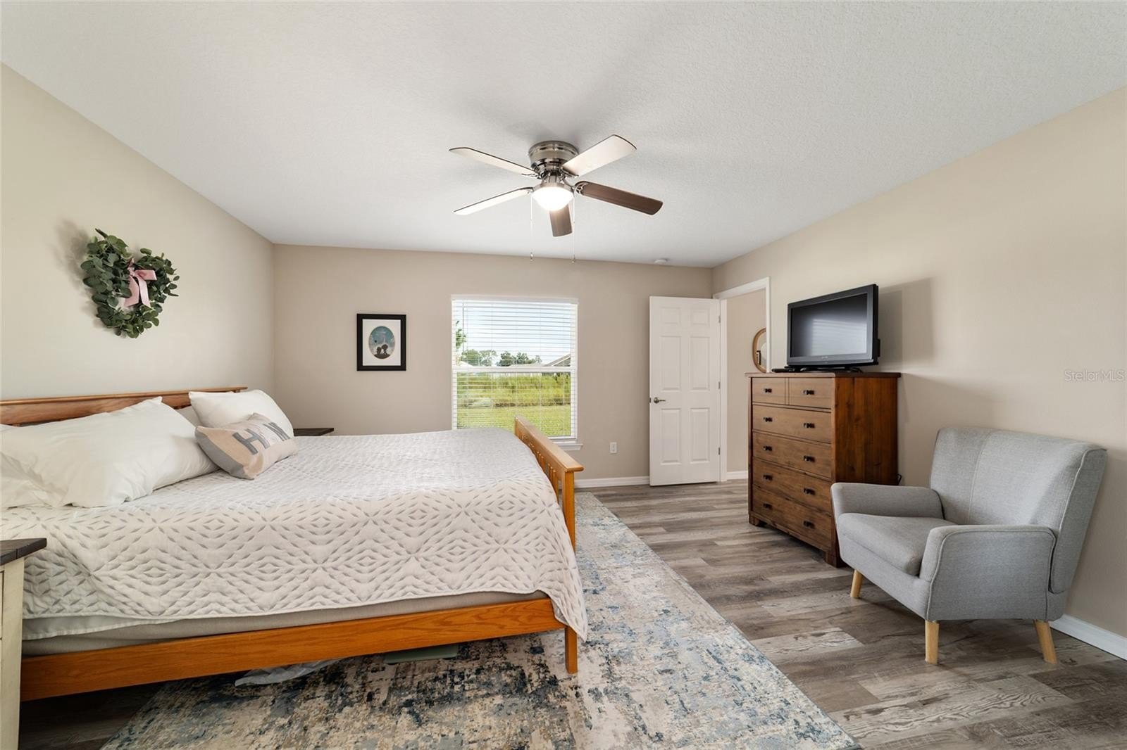 Vaulted ceilings and luxury vinyl plank flooring create a bright and cohesive look throughout. The spacious living room flows seamlessly into the dining area and gourmet kitchen, perfect for entertaining or everyday living. The kitchen features soft-close cabinetry, stainless steel appliances and sleek granite countertops. A thoughtful split floor plan ensures privacy: the primary suite, accommodating a king-sized bed, includes a walk-in closet and ensuite bathroom. Two additional bedrooms share a well-appointed bathroom with a granite countertop vanity