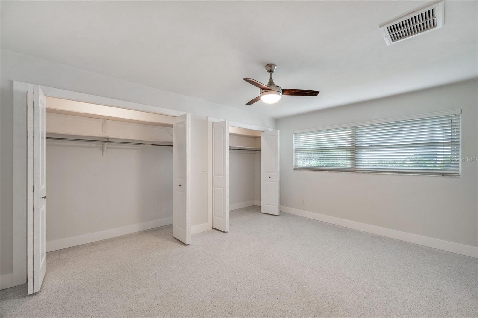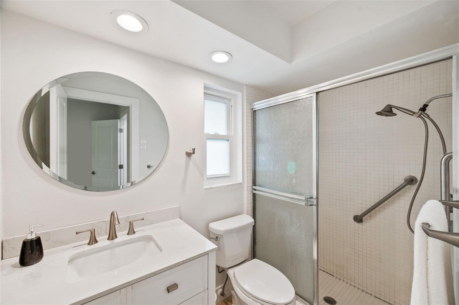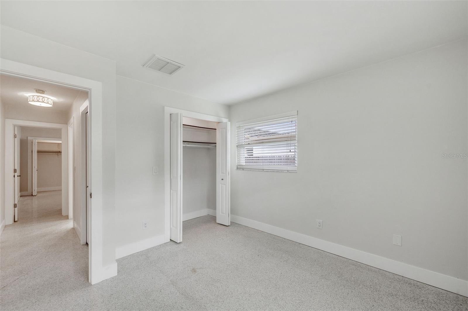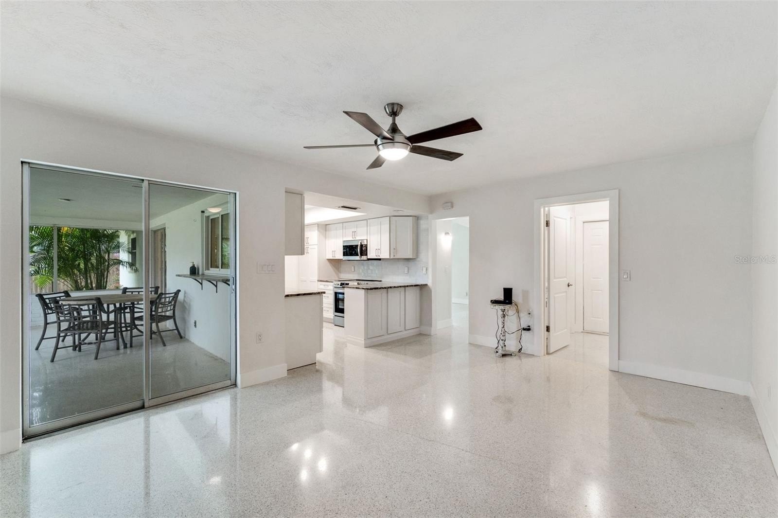 Inside, you’ll find a thoughtfully designed split-bedroom floor plan with an open flow between living spaces. The updated kitchen features new stainless steel appliances, modern cabinetry, and custom pull out shelving for convenient storage. Both a cozy living room and a spacious family room provide versatile areas for gathering, while original terrazzo floors add durability and character. The large primary suite is set apart for privacy, with the secondary bedrooms located on the opposite side of the home. The second bathroom has new updated fixtures, cabinets, toilet and shower tile.