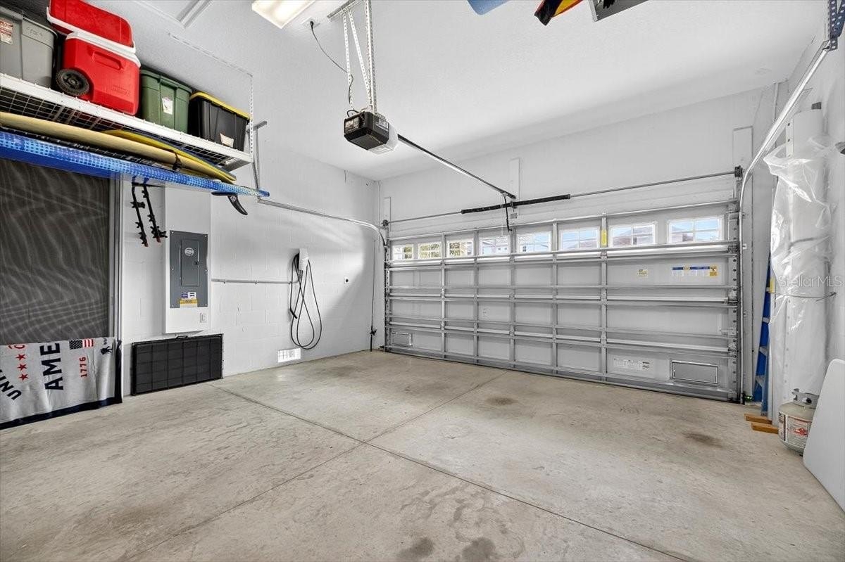2-car garage with built-in overhead storage racks,