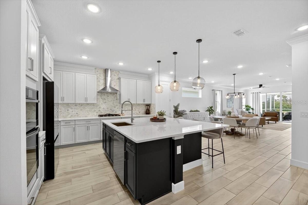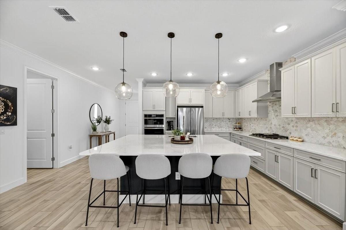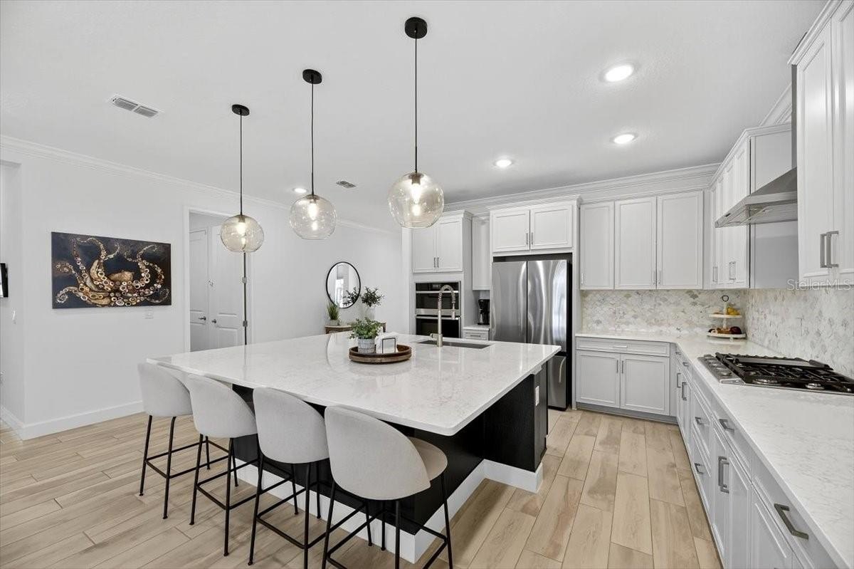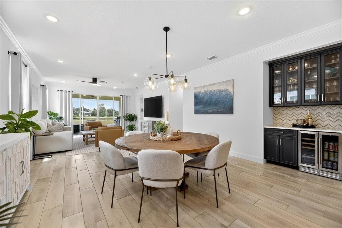 Step inside to a bright open-concept living, dining, and kitchen area perfect for entertaining. The chef’s kitchen features a huge center island, gas cooktop, granite countertops, custom wood cabinetry, tile backsplash, and a pantry. A custom-built DRY BAR WITH BEVERAGE FRIDGE adds a touch of luxury for hosting family and friends.