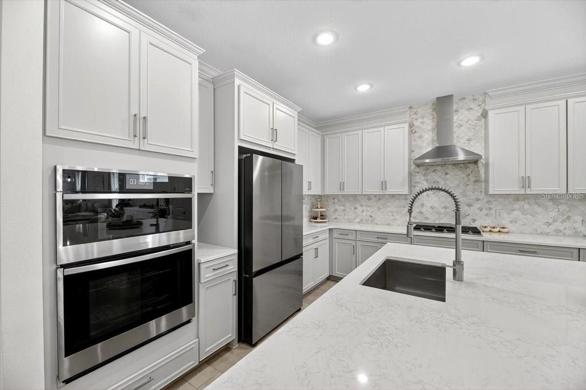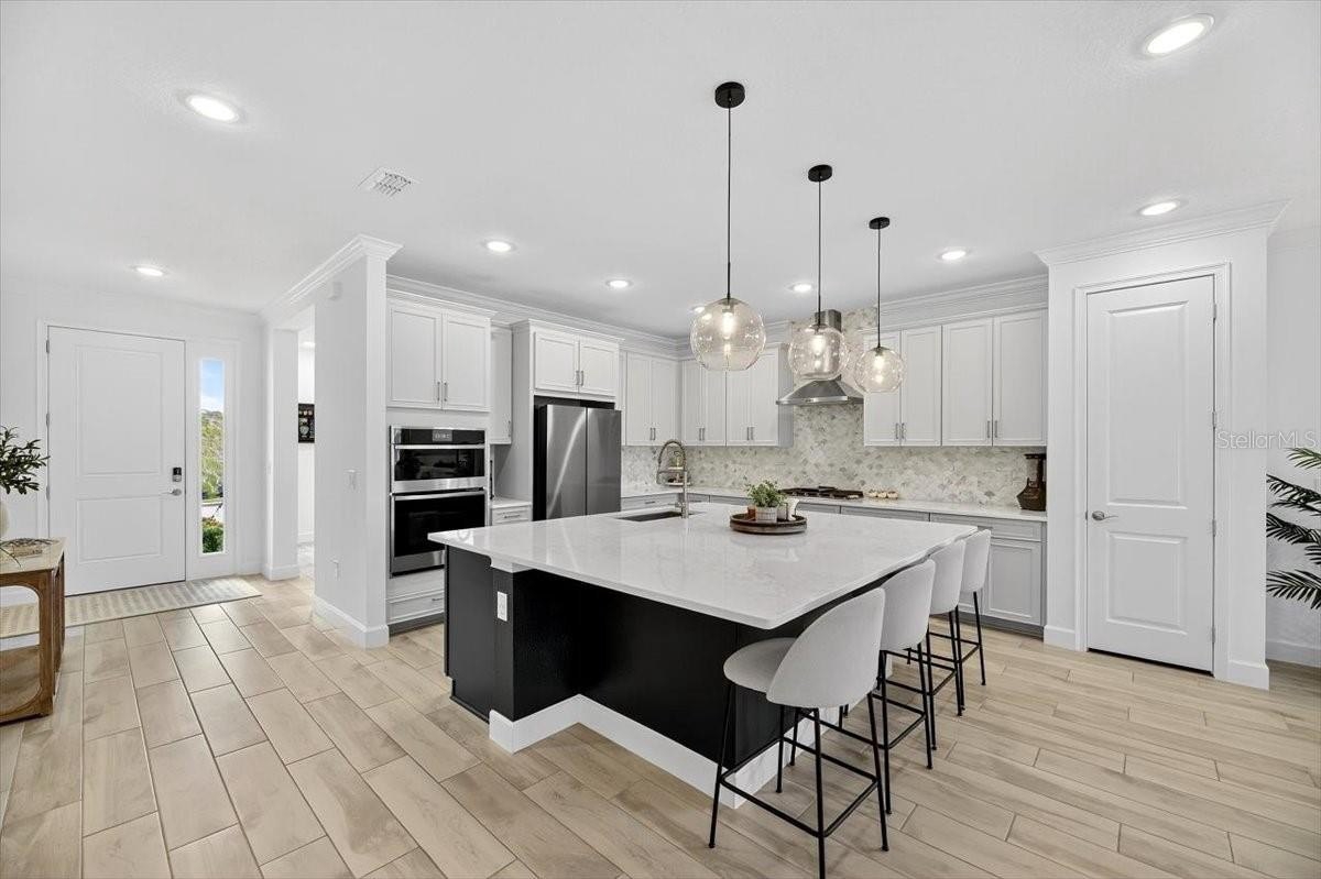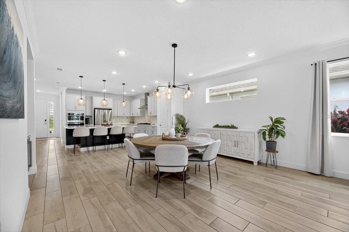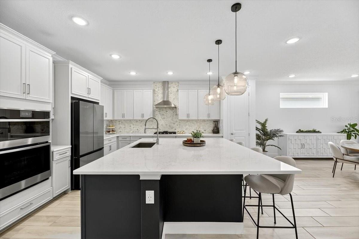 Step inside to a bright open-concept living, dining, and kitchen area perfect for entertaining. The chef’s kitchen features a huge center island, gas cooktop, granite countertops, custom wood cabinetry, tile backsplash, and a pantry. A custom-built DRY BAR WITH BEVERAGE FRIDGE adds a touch of luxury for hosting family and friends.