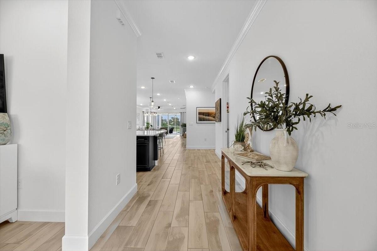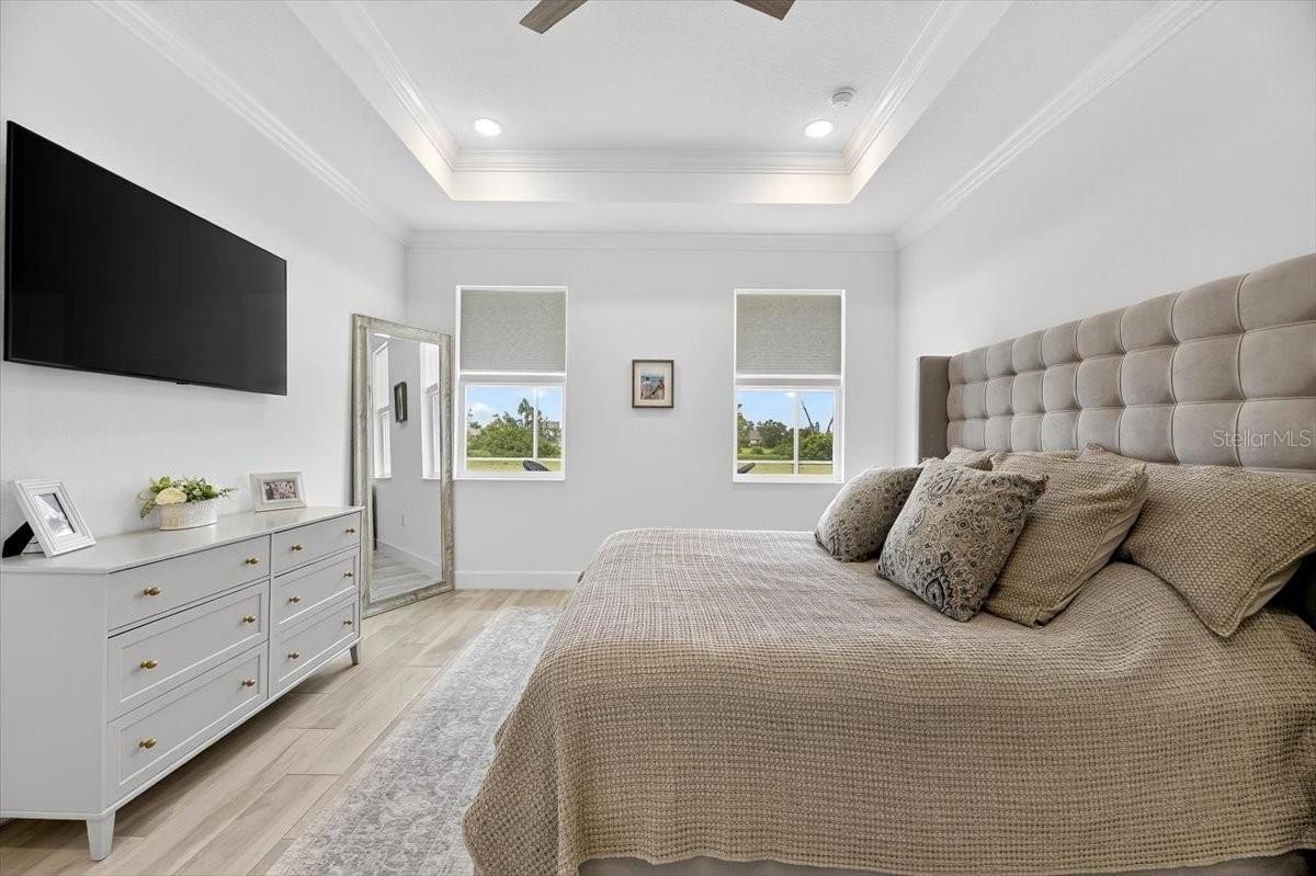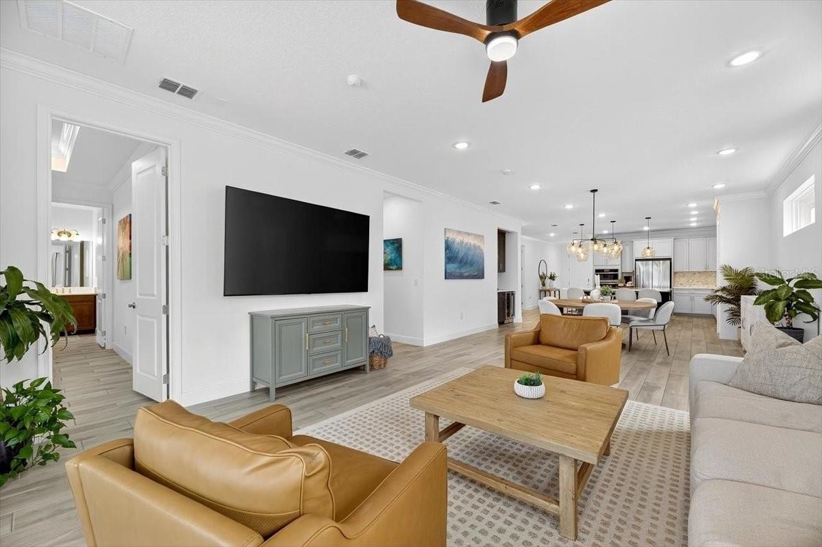 crown molding throughout, ceiling fans and custom lighting,