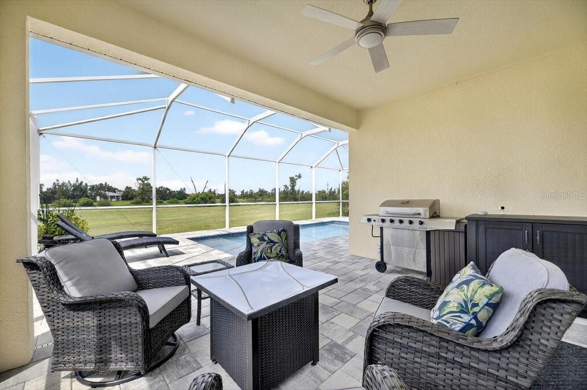 Enjoy seamless indoor-outdoor living with large sliding doors that open to a covered lanai and screened SALTWATER POOL WITH HEATER AND CHILLER, overlooking a golf course, creating the perfect year-round retreat.