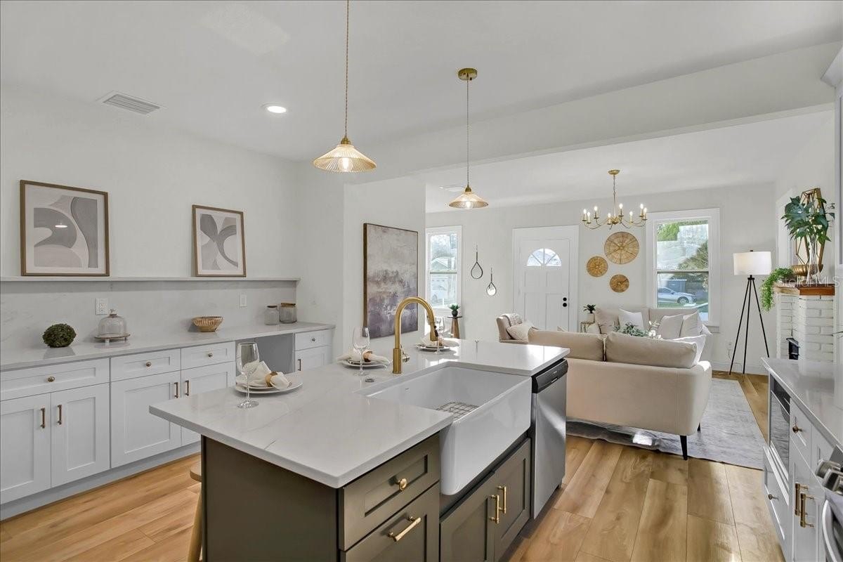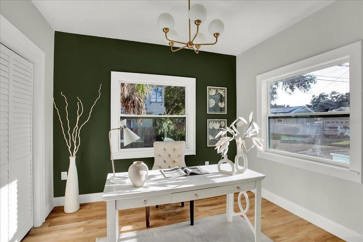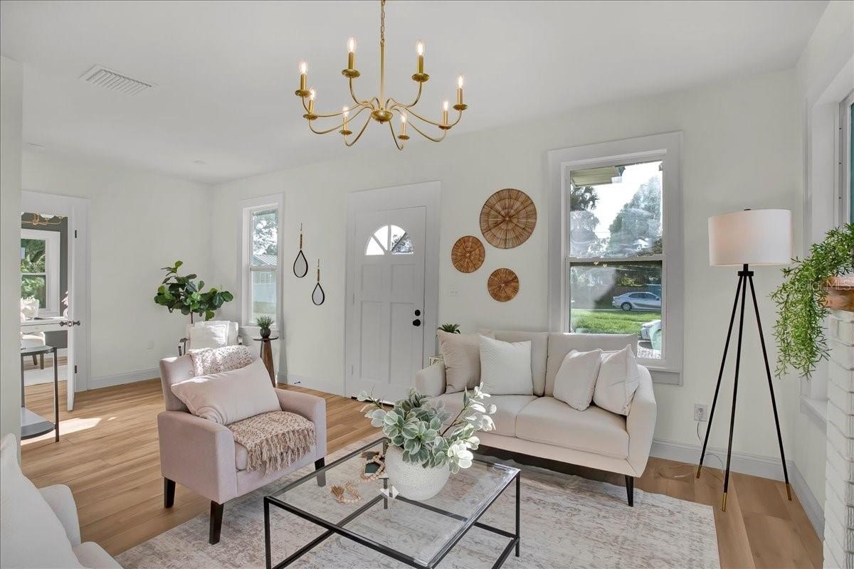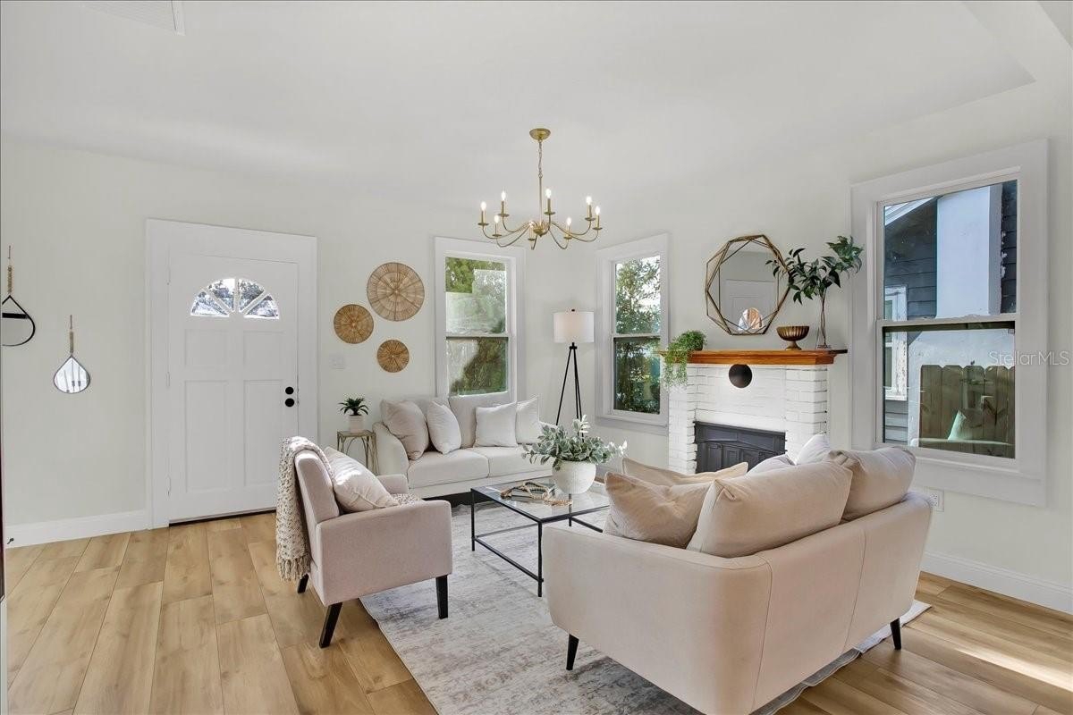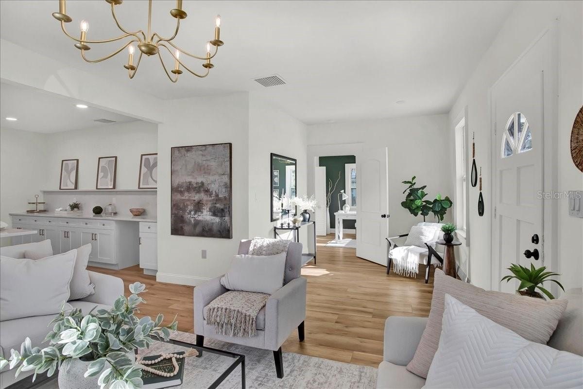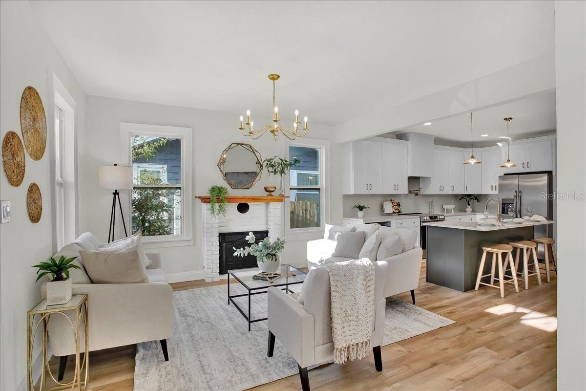 Step inside this stunning 3-bedroom, 2-bath, 1,487 sq ft home and experience the perfect blend of modern updates, timeless charm, and a thoughtfully designed layout. You’re greeted by the spacious living room with soaring ceilings and a cozy fireplace, setting the tone for both comfort and style. To the right, a bright office (or third bedroom) offers the perfect space for working from home or creative pursuits. Continue through the home and you’ll find the heart of the house: a chef’s kitchen with a massive island and an extended dry bar across the way—a dream for entertaining. Just beyond, the formal dining room provides an inviting space for gatherings with family and friends. The guest bath is conveniently located off the main living area, while the master suite and additional guest bedroom are tucked to the right past the kitchen, offering privacy and retreat. The master features a spacious layout and a luxuriously updated bathroom. Outside, enjoy a freshly updated yard with new sod, lush landscaping, new fencing, and impact-resistant windows for peace of mind. All of this comes in a prime location—high and dry (no flood zone), just 5 minutes to vibrant Downtown St. Pete and 10 minutes to the award-winning beaches of St. Pete Beach and Treasure Island.
