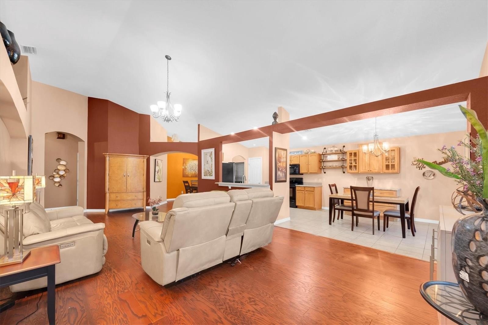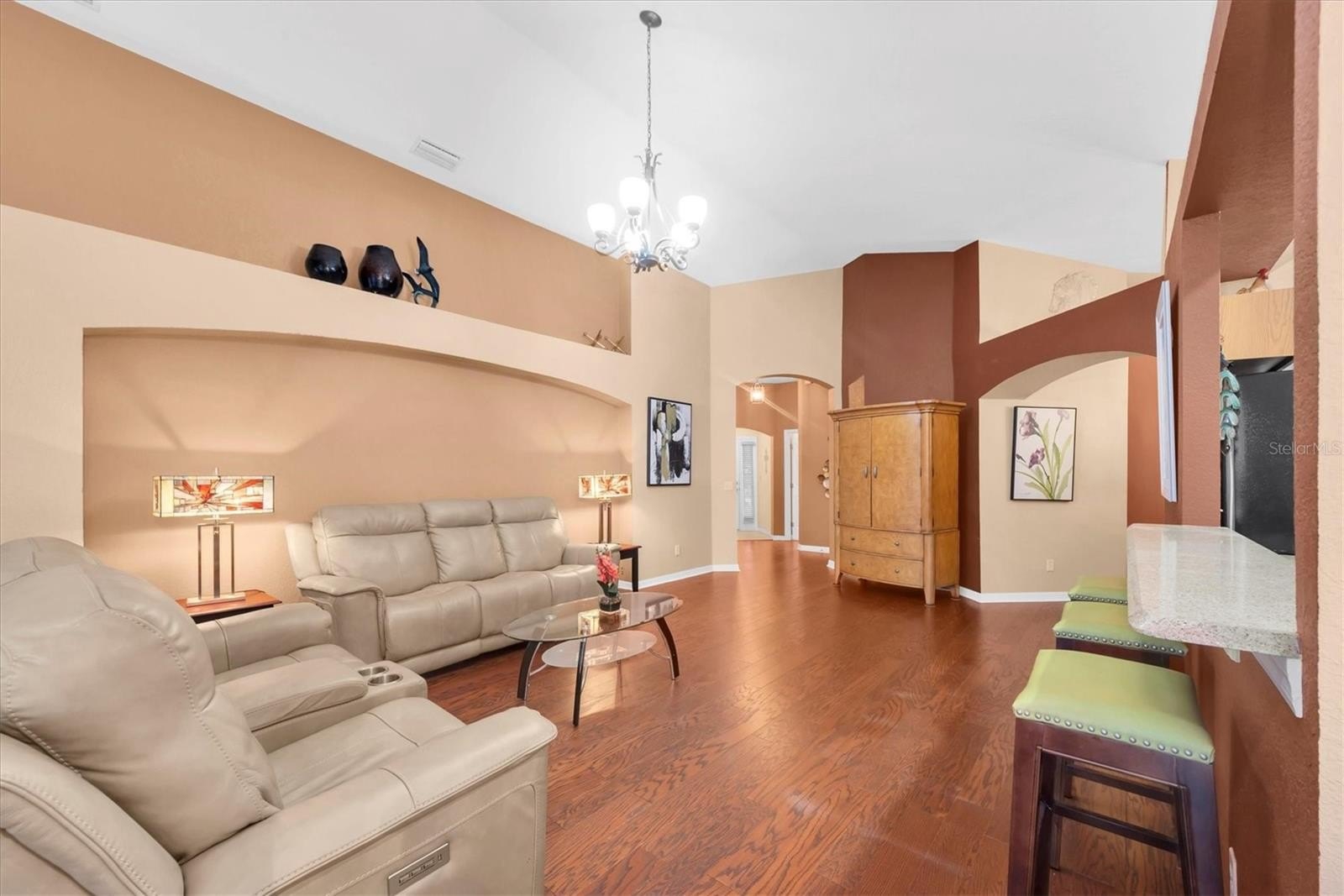 The home greets you with a screened-in covered front porch—an ideal spot to relax and unwind. Inside, the foyer framed by an elegant archway sets the tone for the rest of the home. Just off the entry, a private in-law suite features its own full bathroom, while two additional bedrooms share a conveniently located bath.