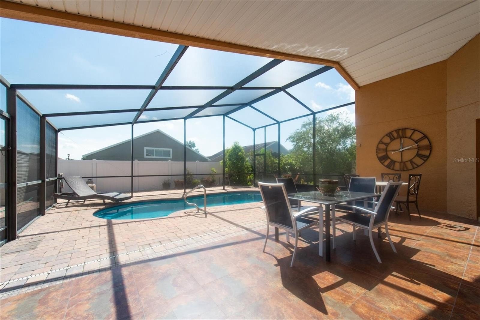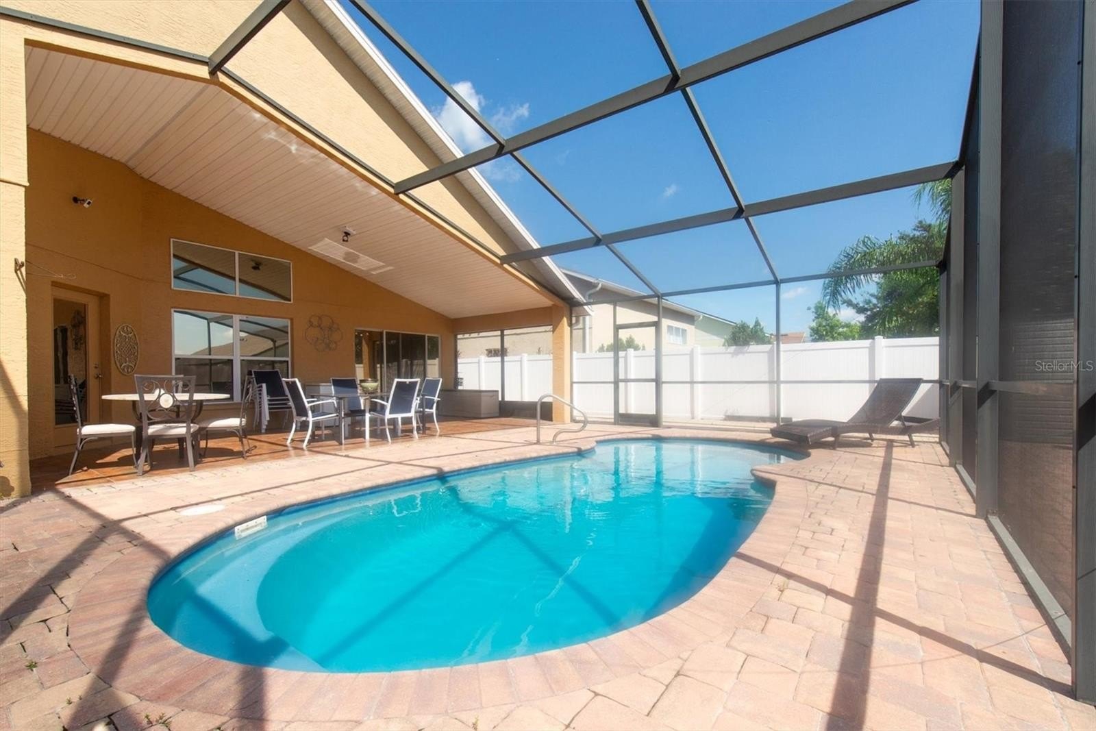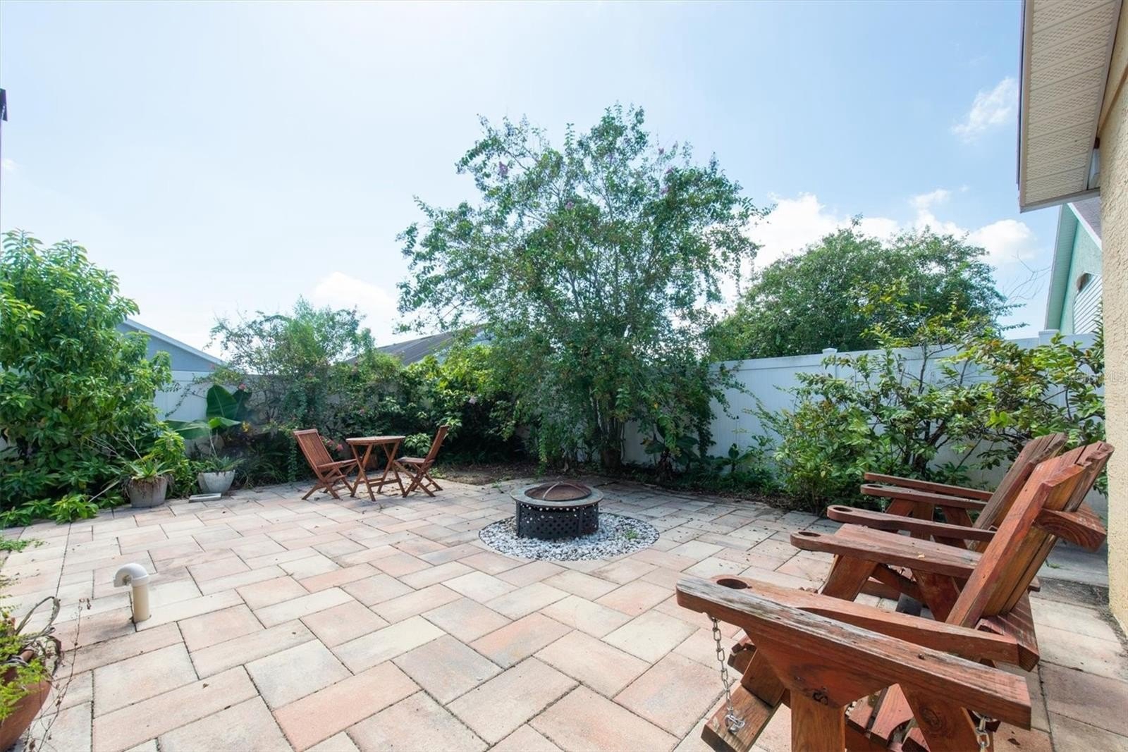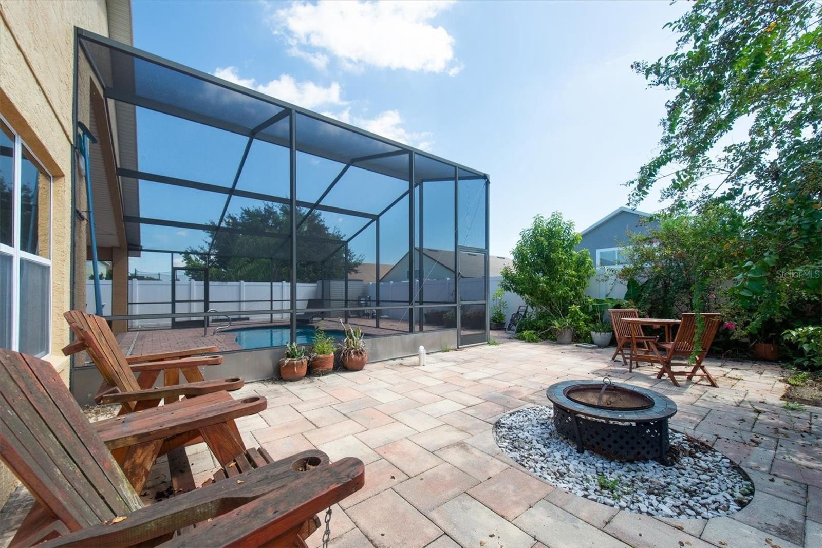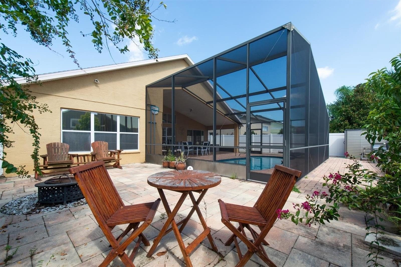 Step outside to your very own Florida oasis. The backyard has been fully paved for easy maintenance and maximum enjoyment. The screened “birdcage” enclosure surrounds the pool and lanai, while just beyond, a fire pit and lounge area create the perfect setting for entertaining.