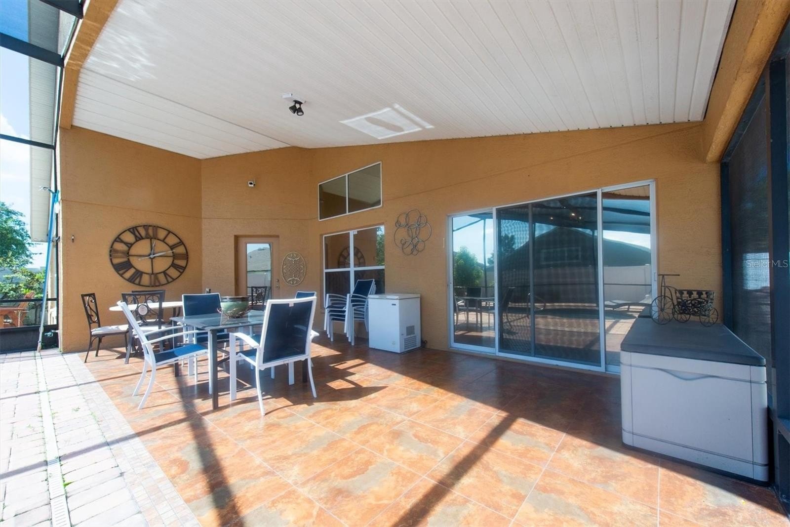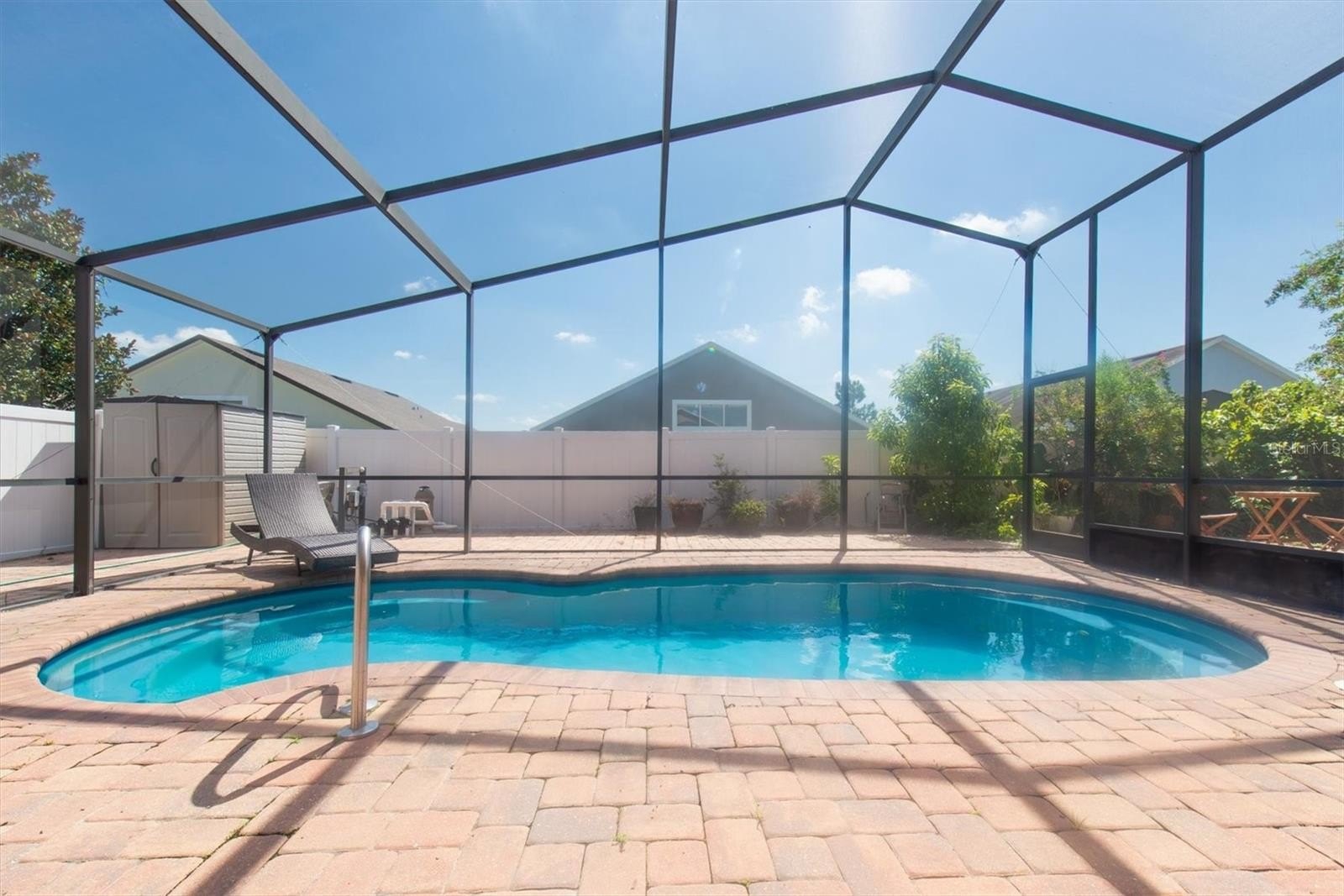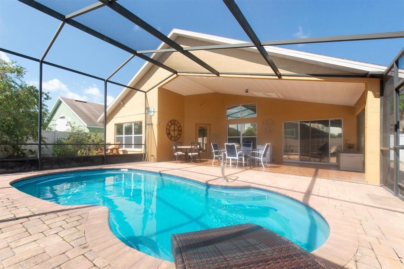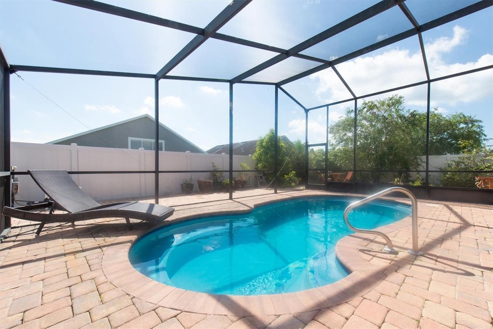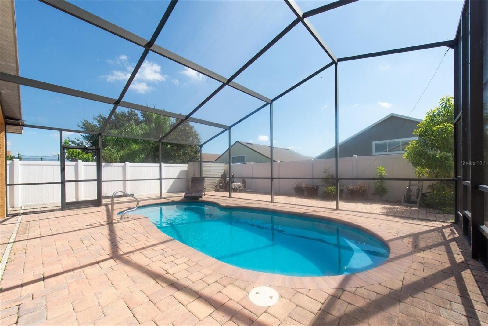 Step outside to your very own Florida oasis. The backyard has been fully paved for easy maintenance and maximum enjoyment. The screened “birdcage” enclosure surrounds the pool and lanai, while just beyond, a fire pit and lounge area create the perfect setting for entertaining.