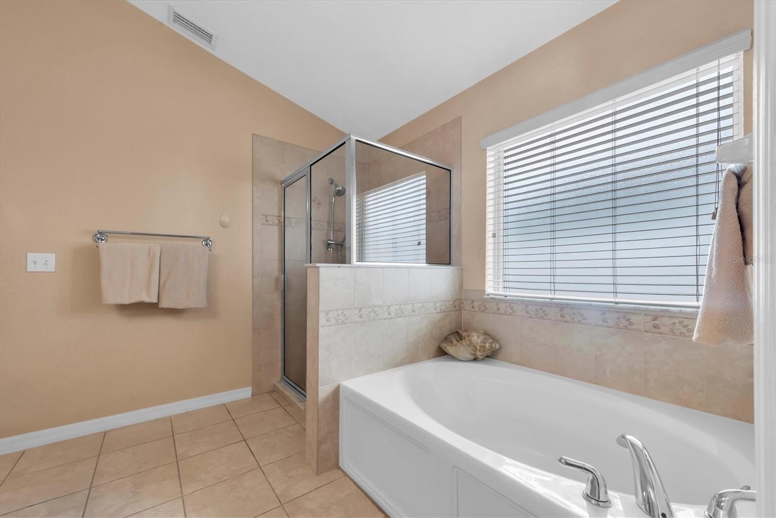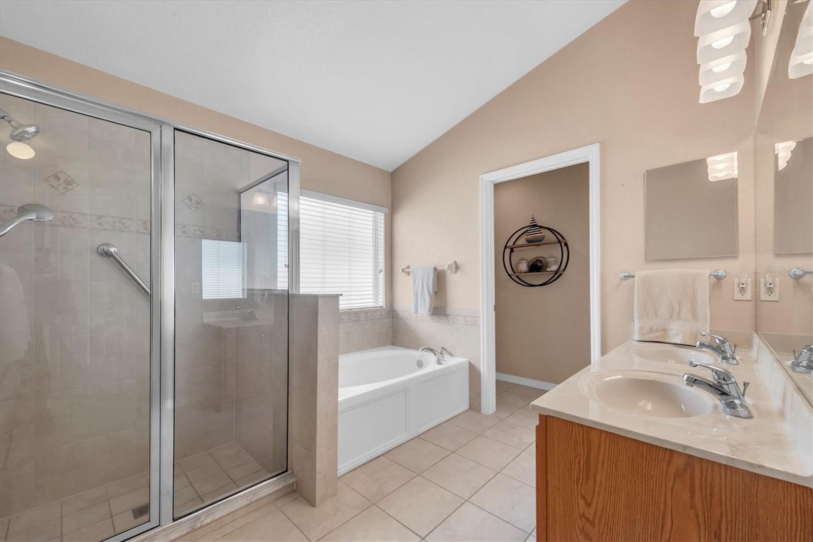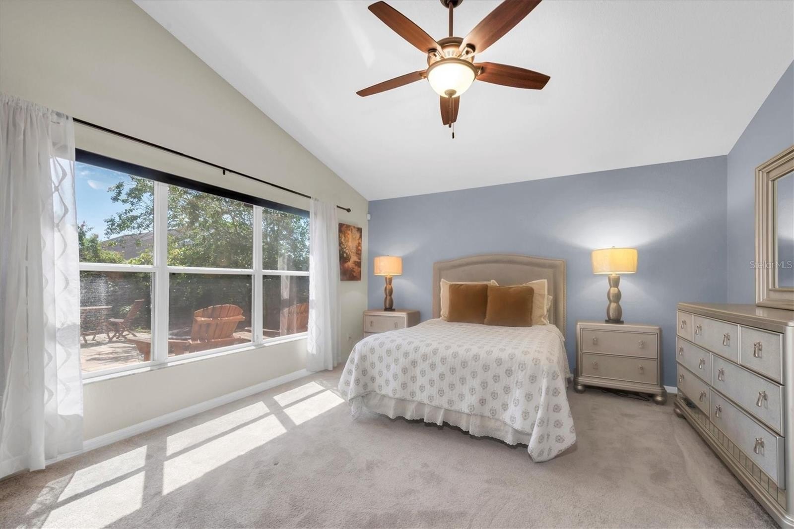 The primary suite, privately situated at the rear of the home, offers double-door entry, a walk-in closet, and direct access to the pool and lanai. The luxurious en-suite bathroom includes dual vanities, a walk-in shower, garden tub, private water closet, and generous linen storage.