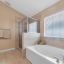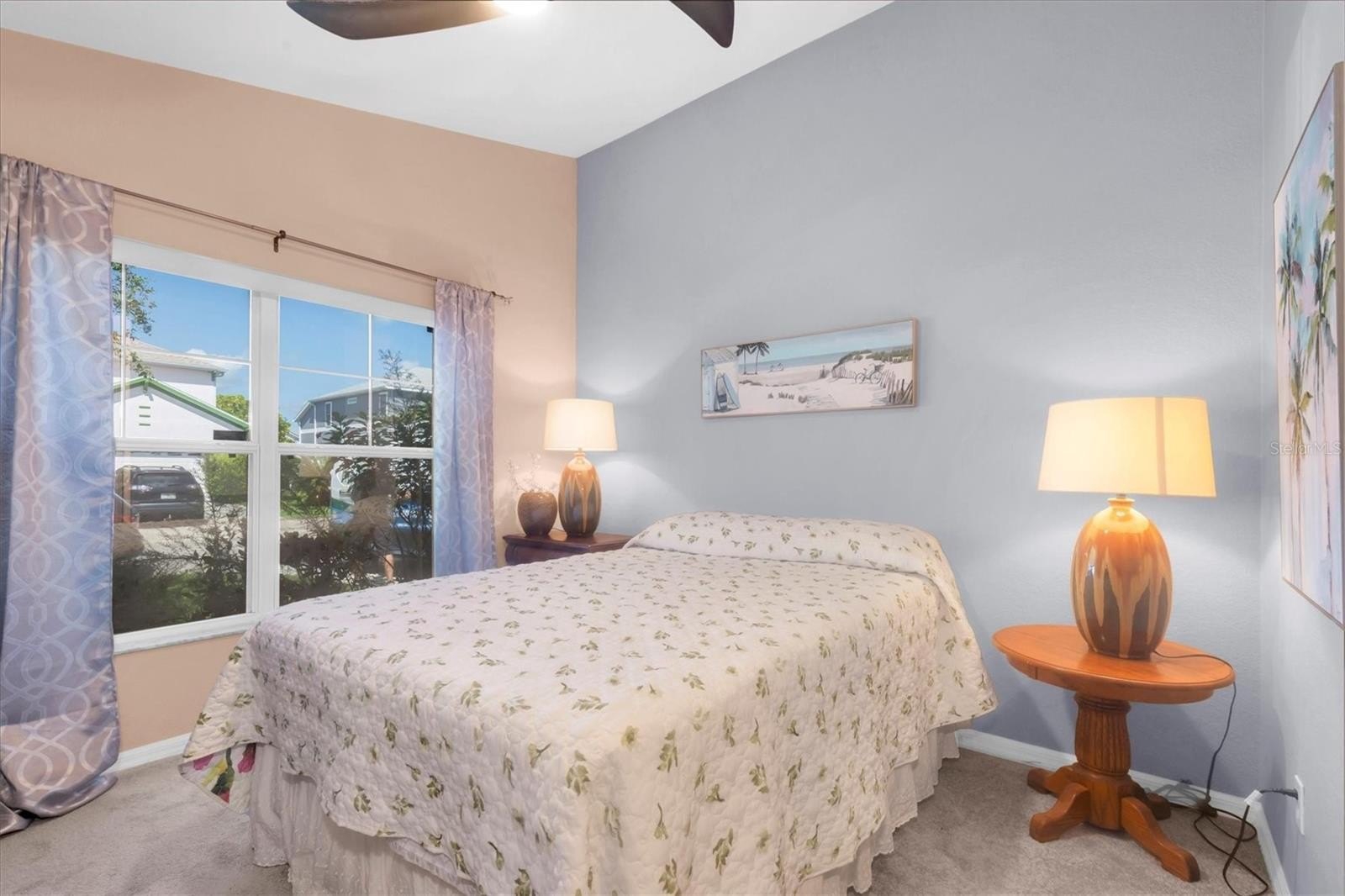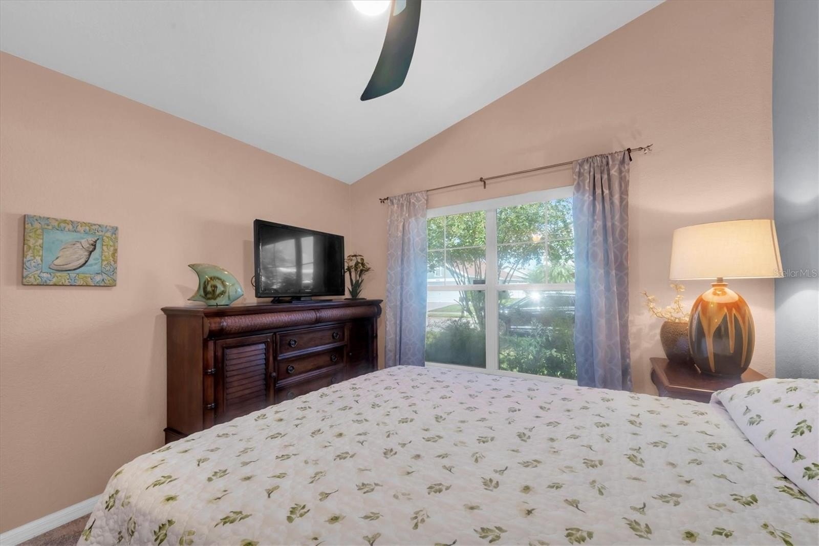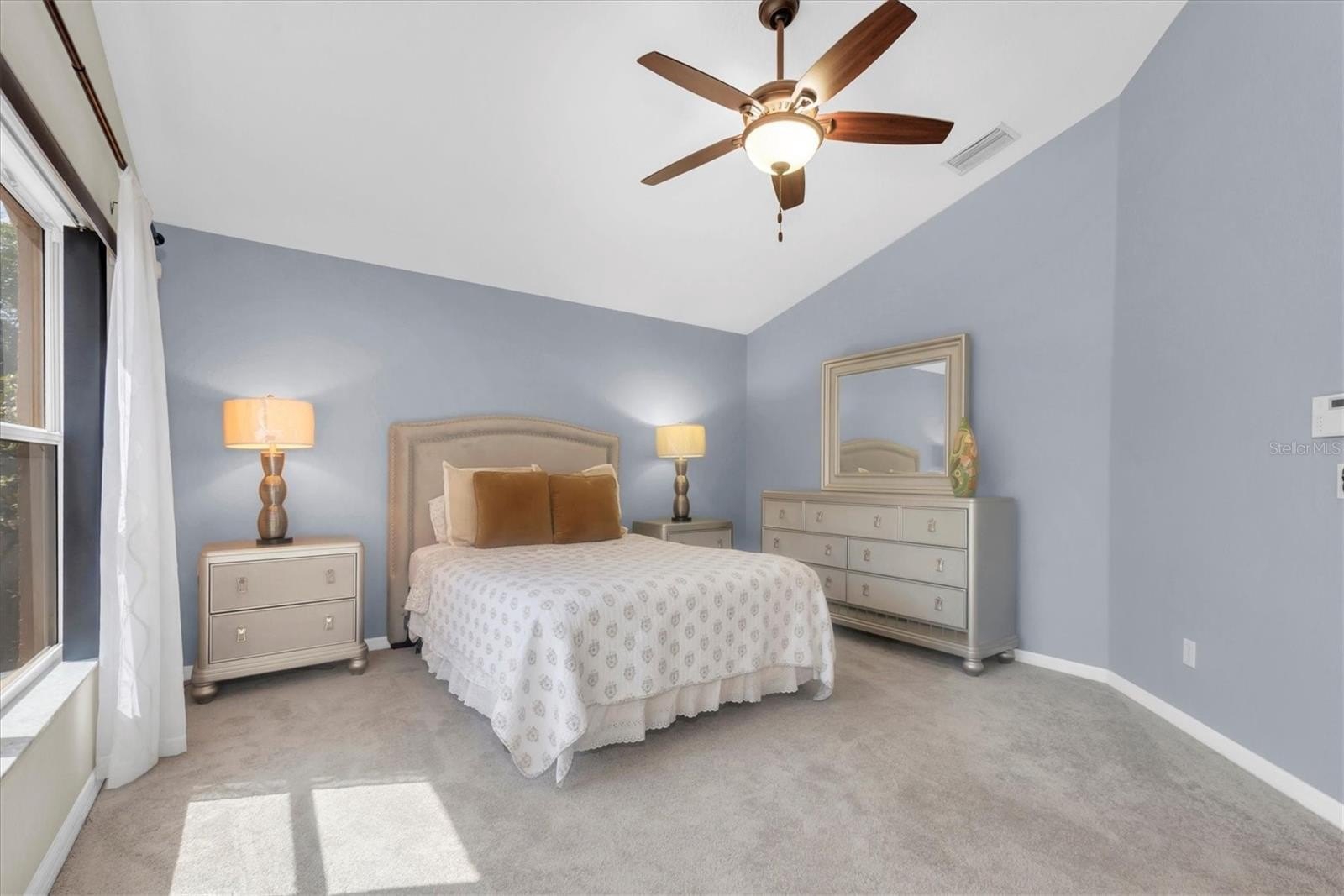 The primary suite, privately situated at the rear of the home, offers double-door entry, a walk-in closet, and direct access to the pool and lanai. The luxurious en-suite bathroom includes dual vanities, a walk-in shower, garden tub, private water closet, and generous linen storage.