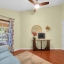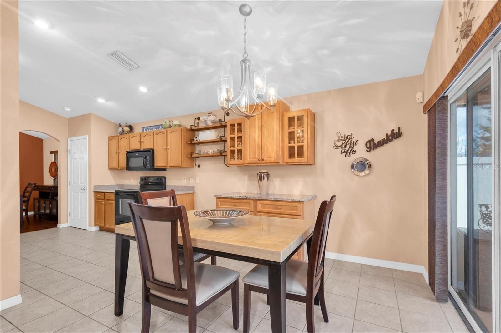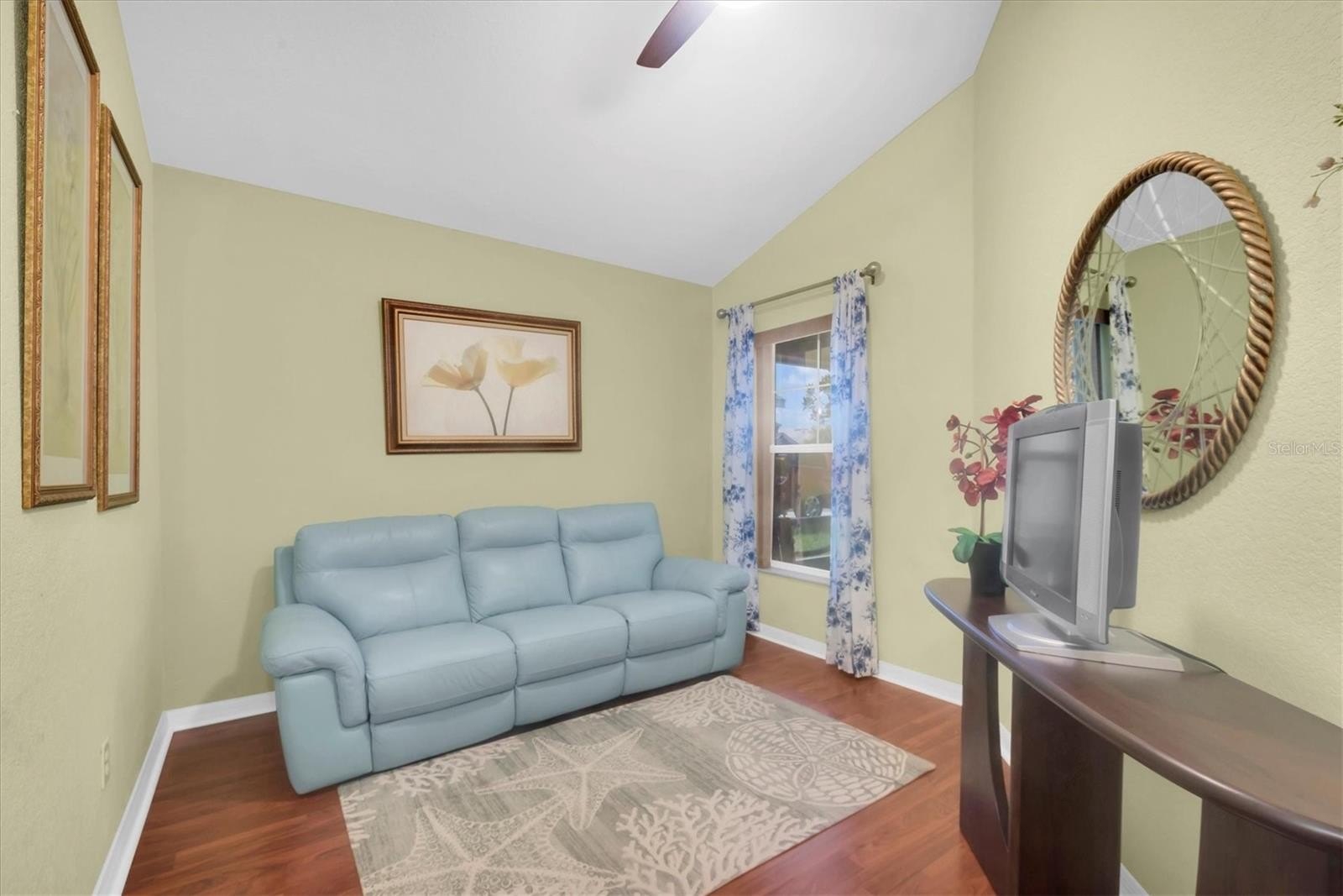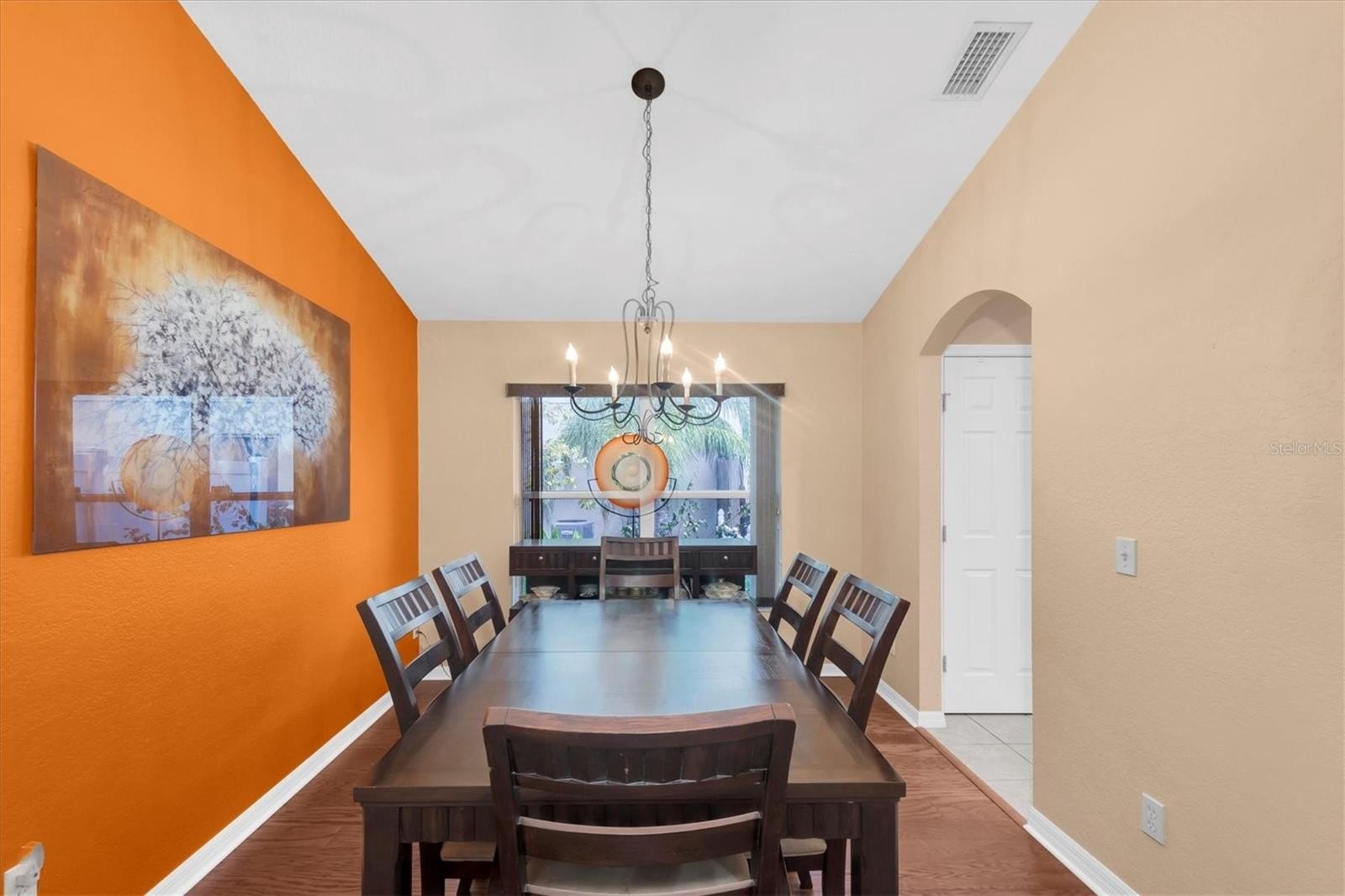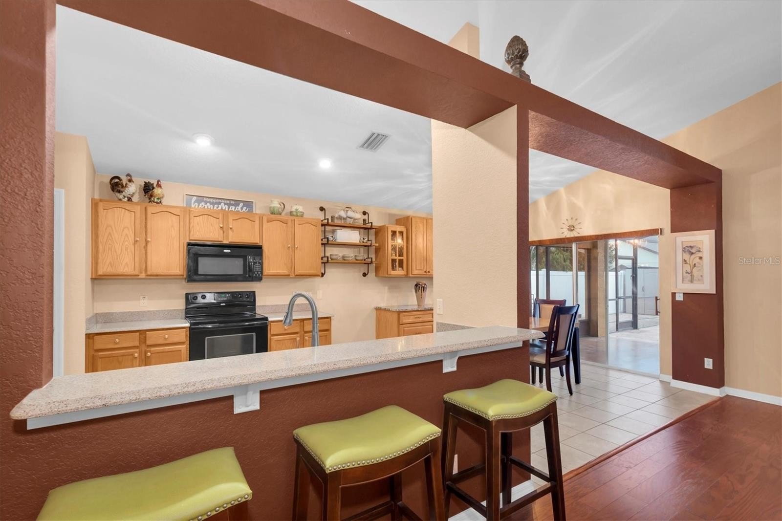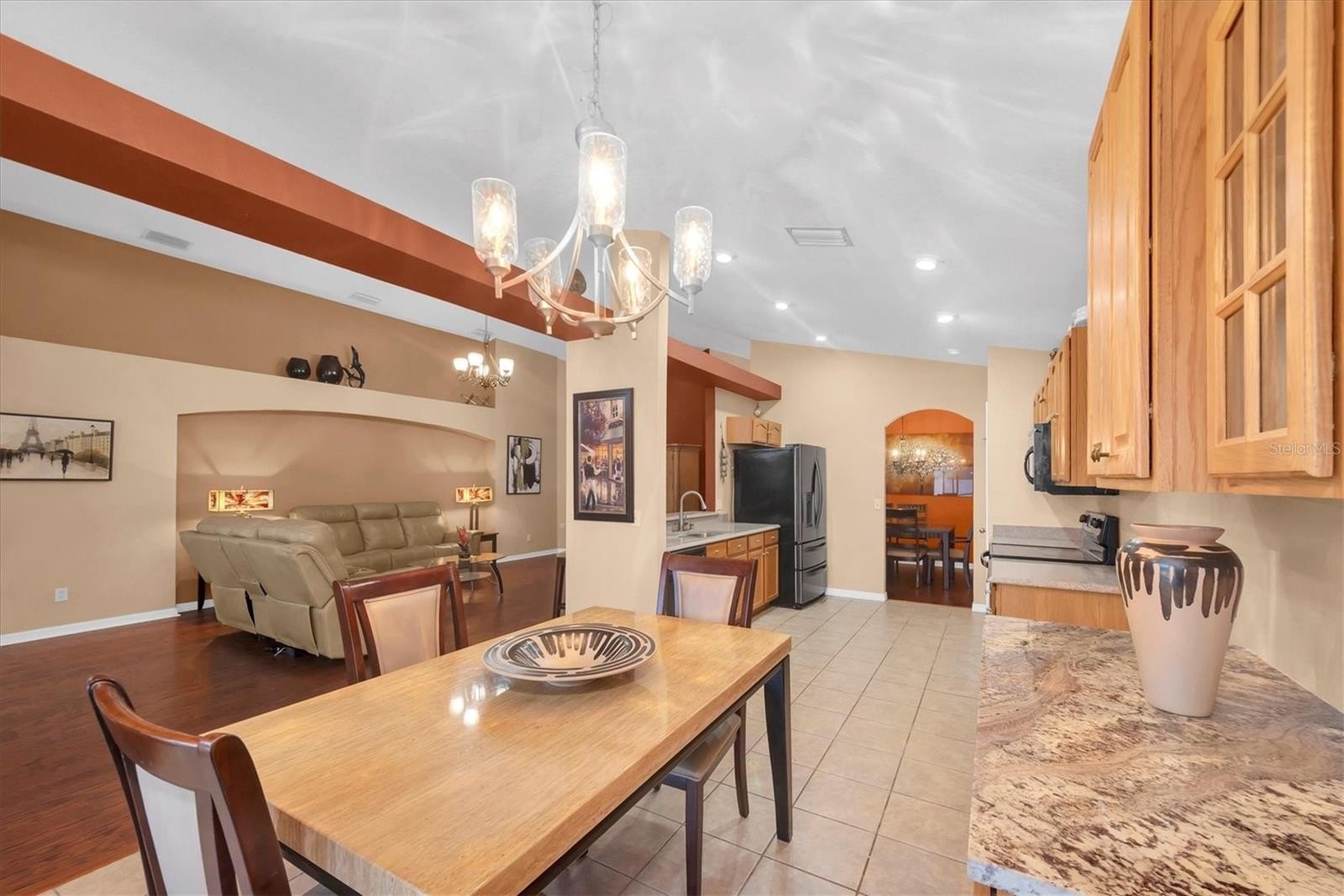 Beautiful wood flooring flows through the main living areas and two bedrooms. The upgraded kitchen showcases granite countertops, plenty of workspace, and a cozy breakfast nook overlooking the sparkling saltwater pool. A formal dining room sits just off the kitchen, perfect for gatherings.