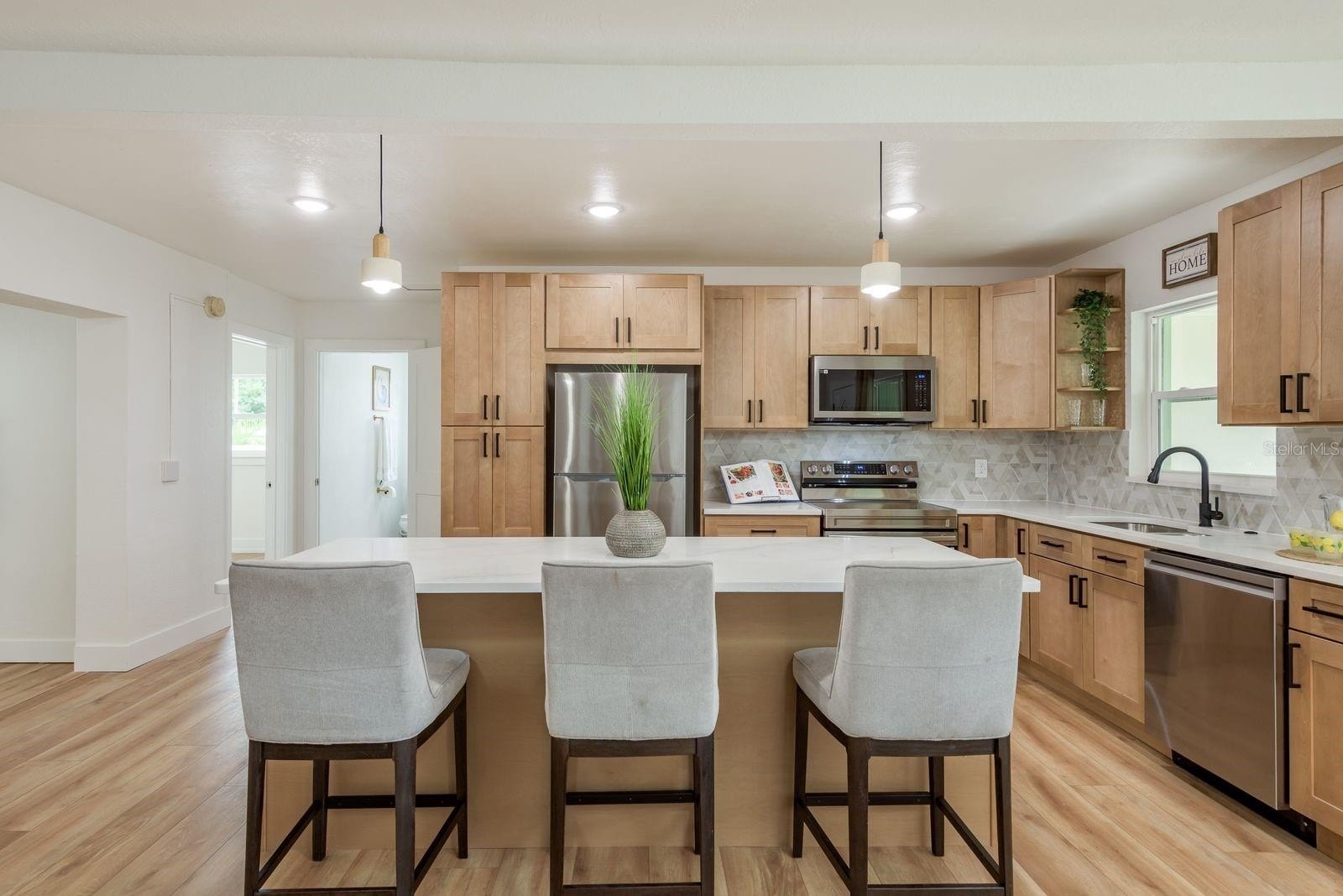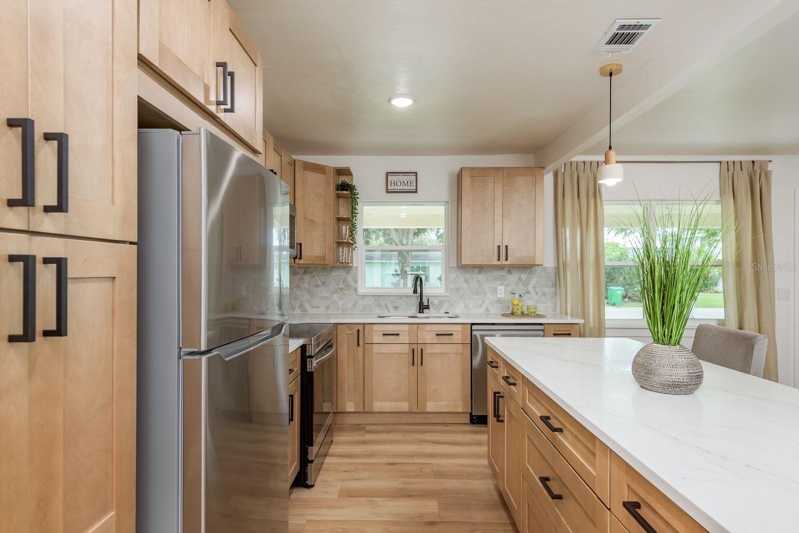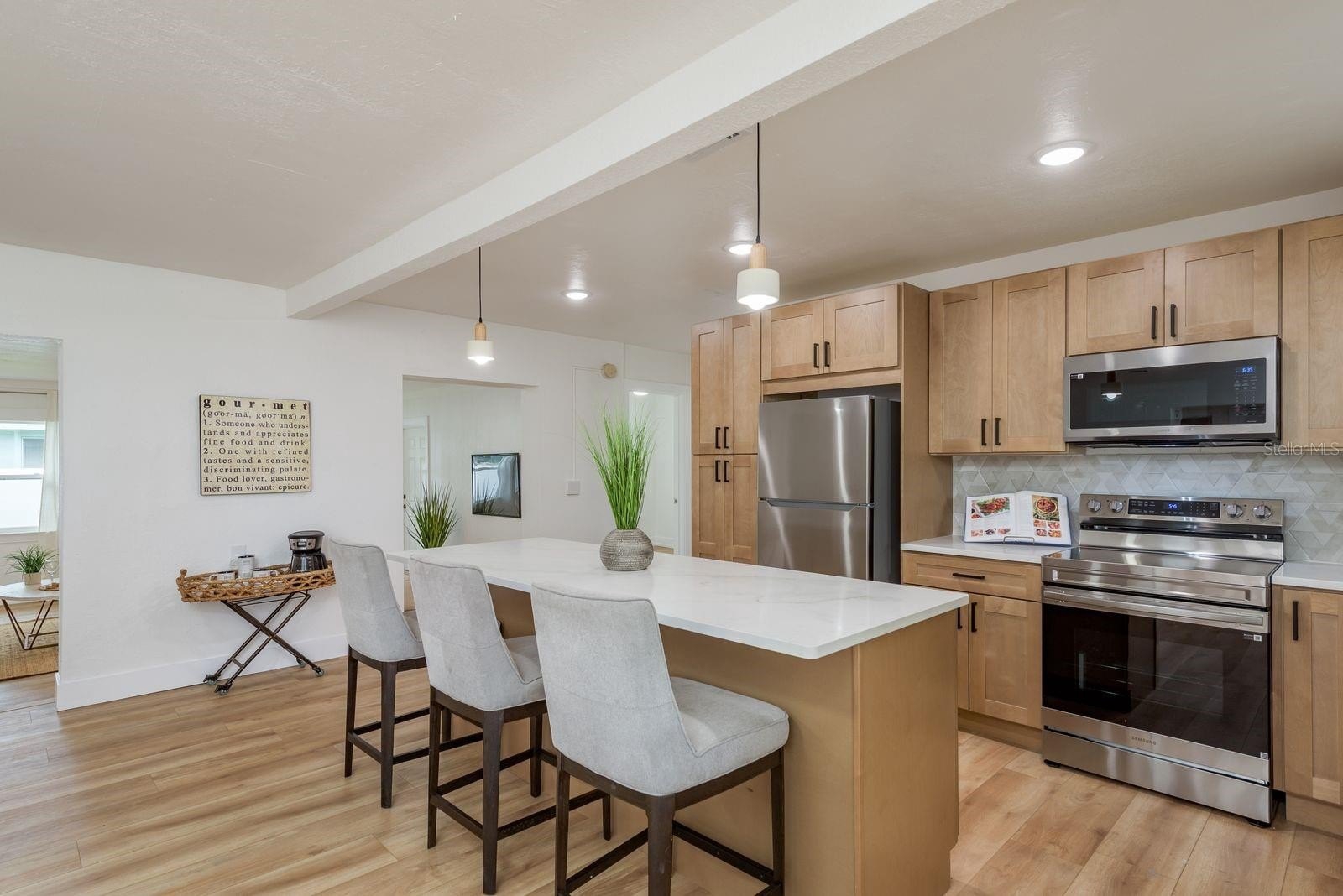 WELCOME HOME! to this beautifully renovated 3-bedroom, 2-bath single-family residence with a 1-car garage in the heart of Clearwater. Step inside and you’ll immediately appreciate the open design, which creates a light, spacious feel that’s perfect for both everyday living and entertaining. The brand-new kitchen features quartz counters, a large, sit-around center island, and stainless steel appliances, seamlessly connecting to the dining and living areas. Luxury vinyl plank flooring runs throughout the home, while both bathrooms have been fully remodeled with stone floors and modern fixures and tile. Outside, new white vinyl fencing provides privacy for a safe and secure backyard.