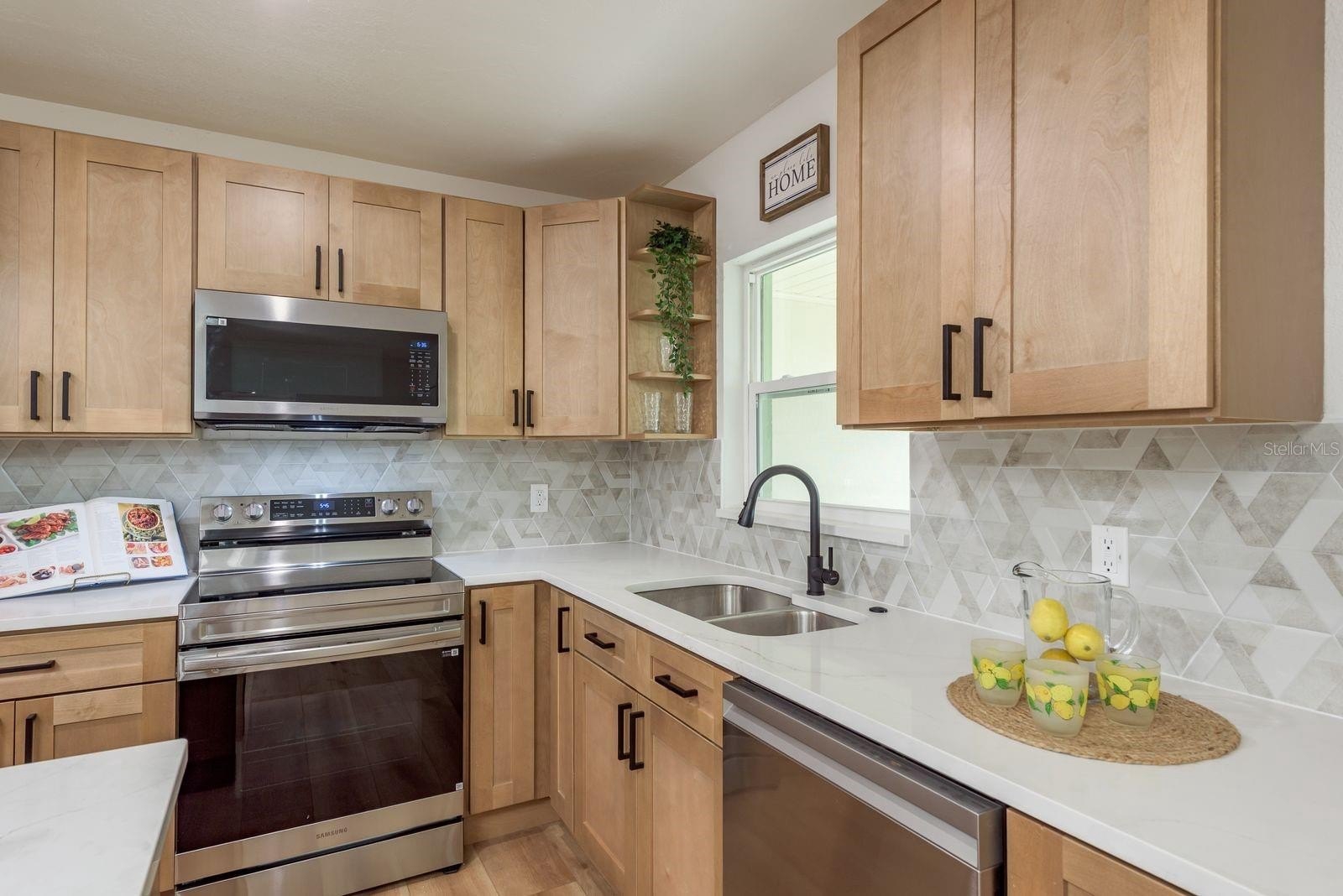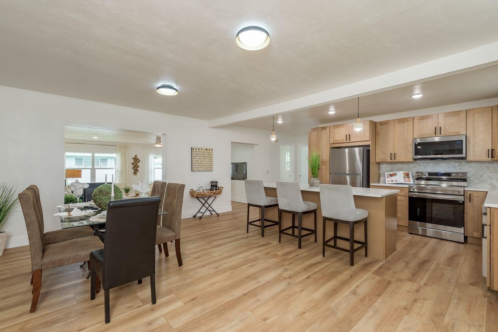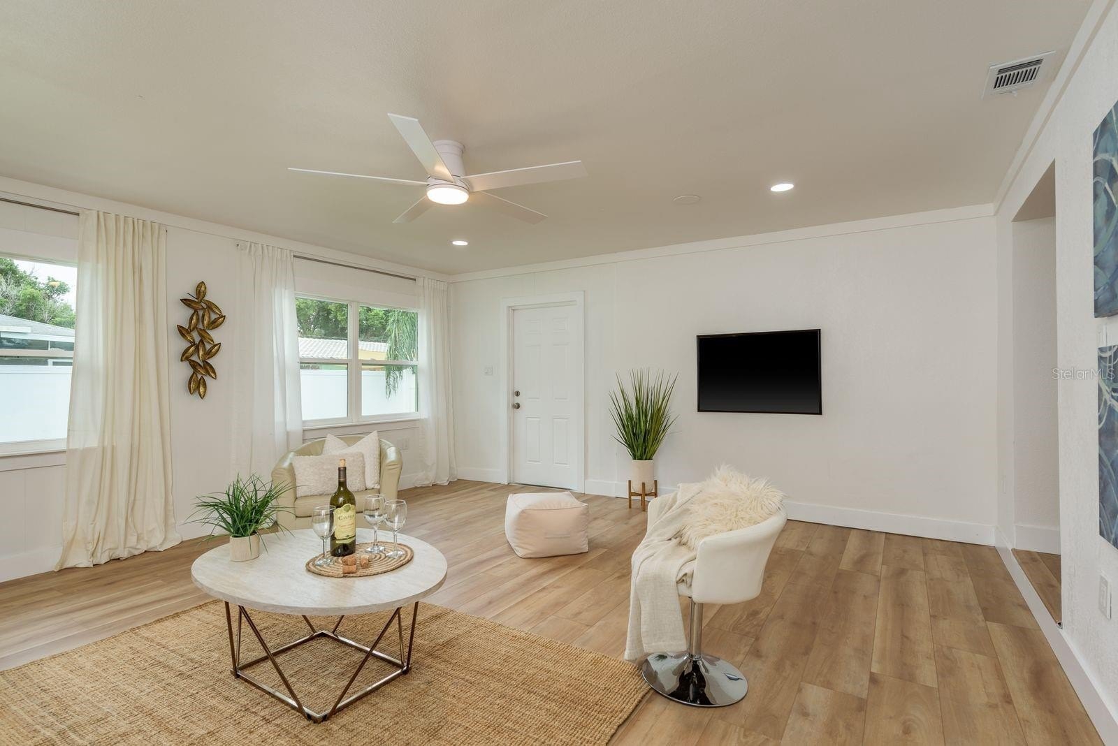 WELCOME HOME! to this beautifully renovated 3-bedroom, 2-bath single-family residence with a 1-car garage in the heart of Clearwater. Step inside and you’ll immediately appreciate the open design, which creates a light, spacious feel that’s perfect for both everyday living and entertaining. The brand-new kitchen features quartz counters, a large, sit-around center island, and stainless steel appliances, seamlessly connecting to the dining and living areas. Luxury vinyl plank flooring runs throughout the home, while both bathrooms have been fully remodeled with stone floors and modern fixures and tile. Outside, new white vinyl fencing provides privacy for a safe and secure backyard.