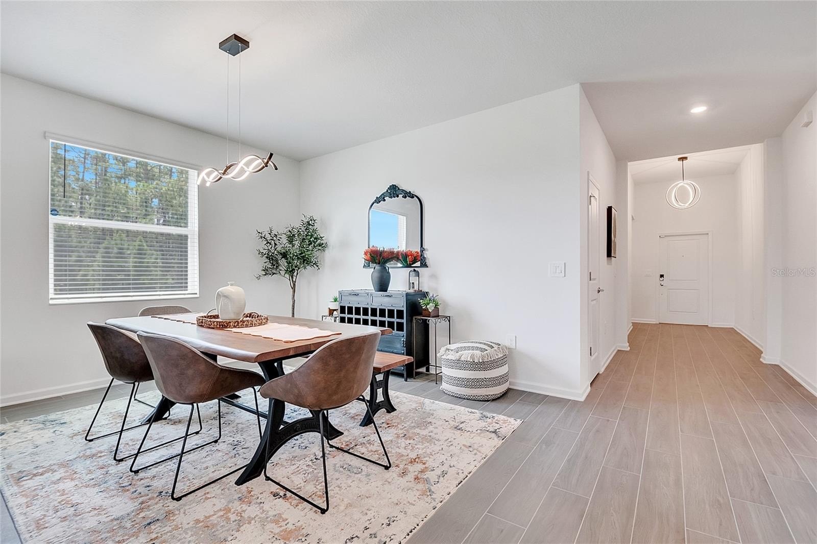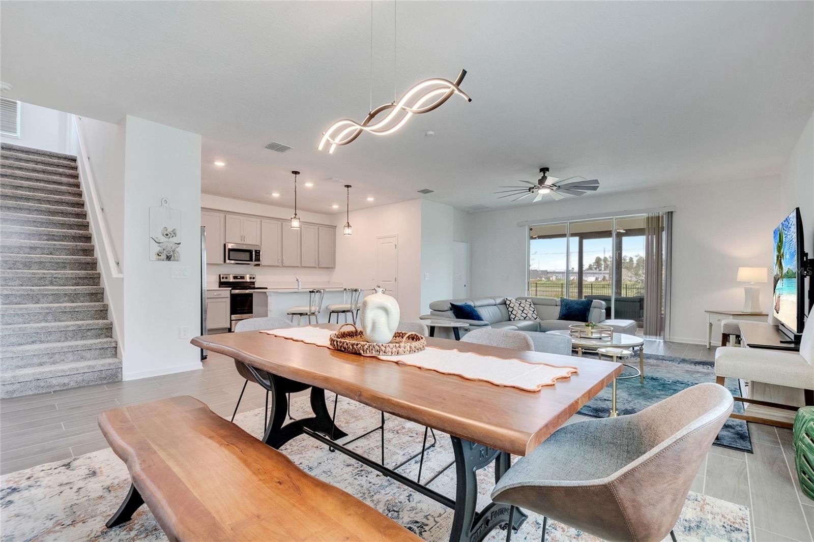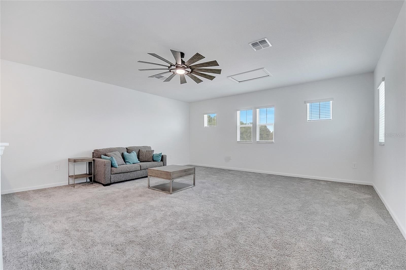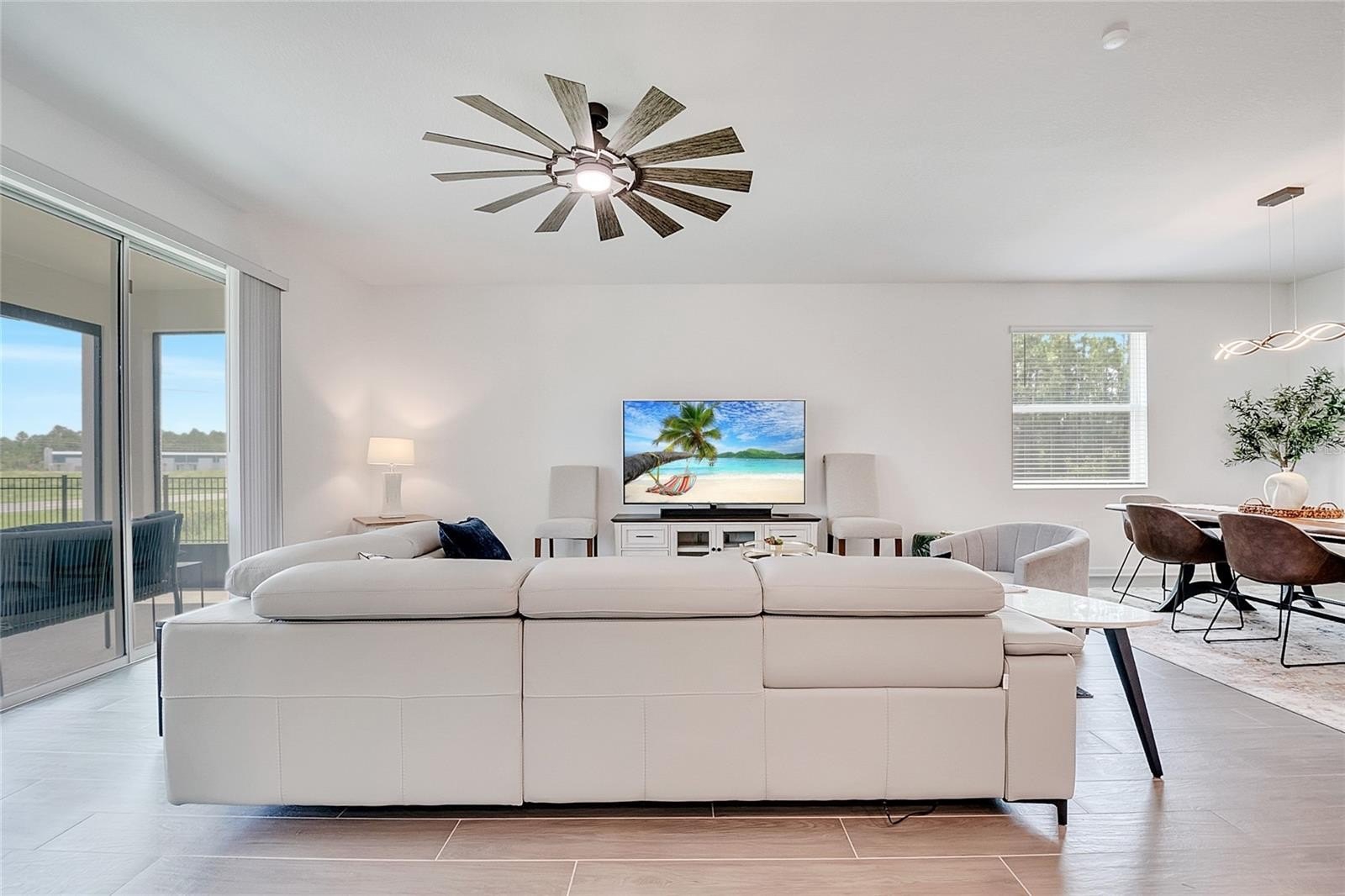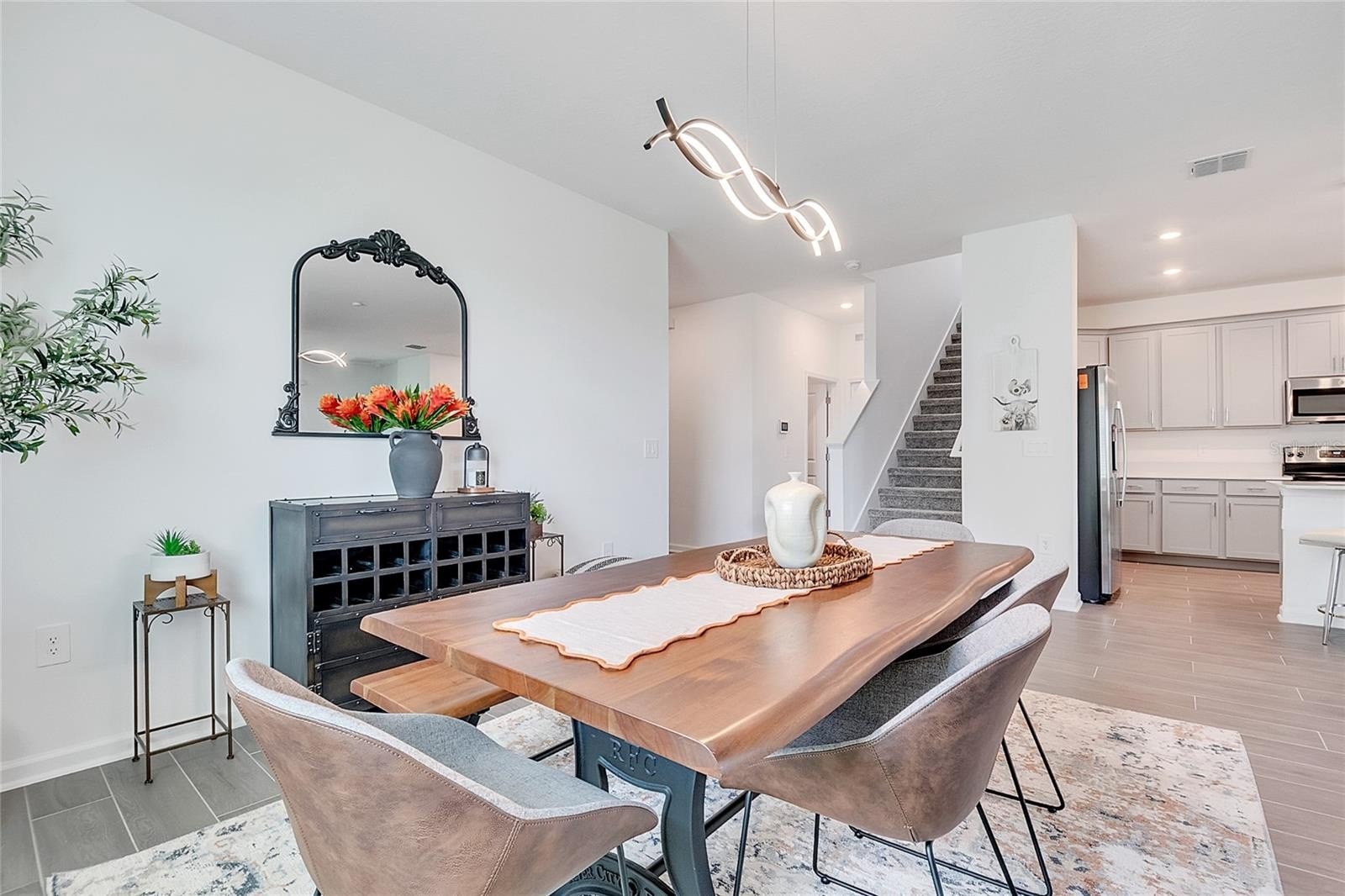 The spacious family room flows seamlessly into the dining area and kitchen, creating an ideal space for gatherings.