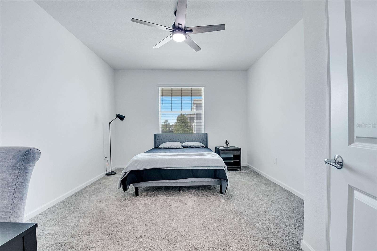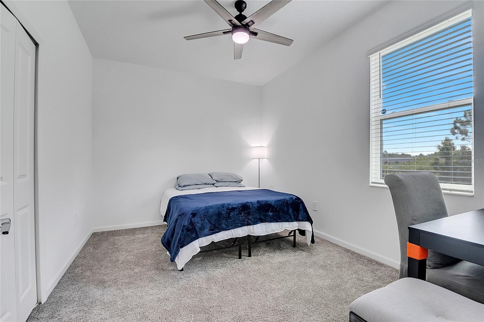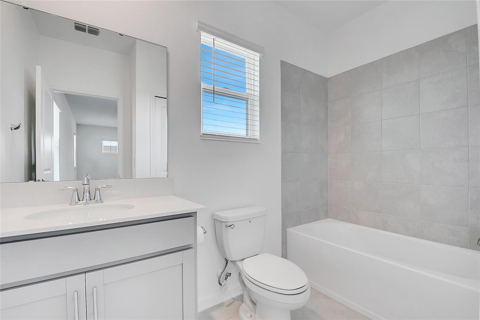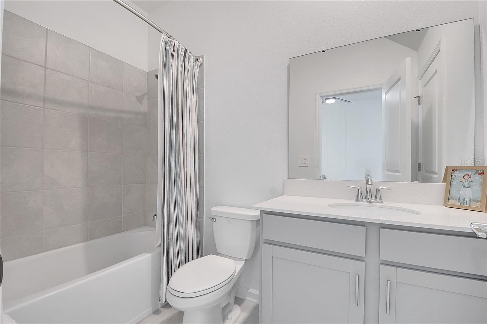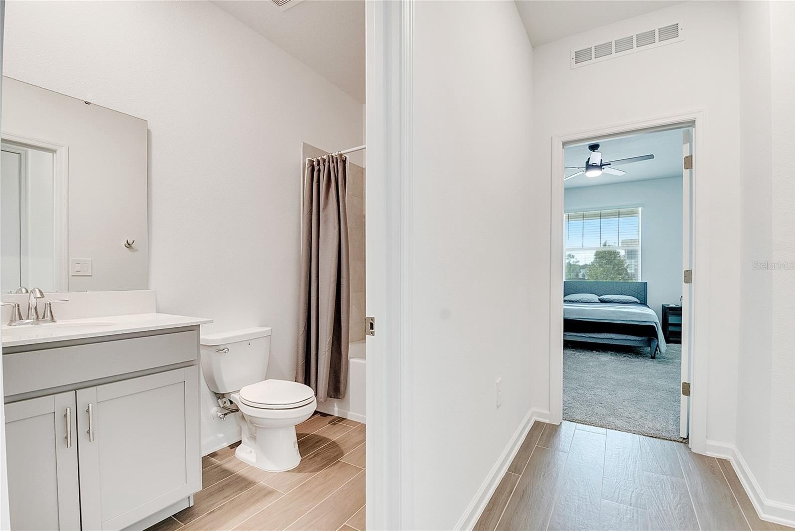 Two spacious guest rooms with ample closet space share a full-sized bathroom with a tub and shower combo, along with a vanity. The third bedroom serves as an ideal guest room for extended stays, with its own private en-suite bathroom.