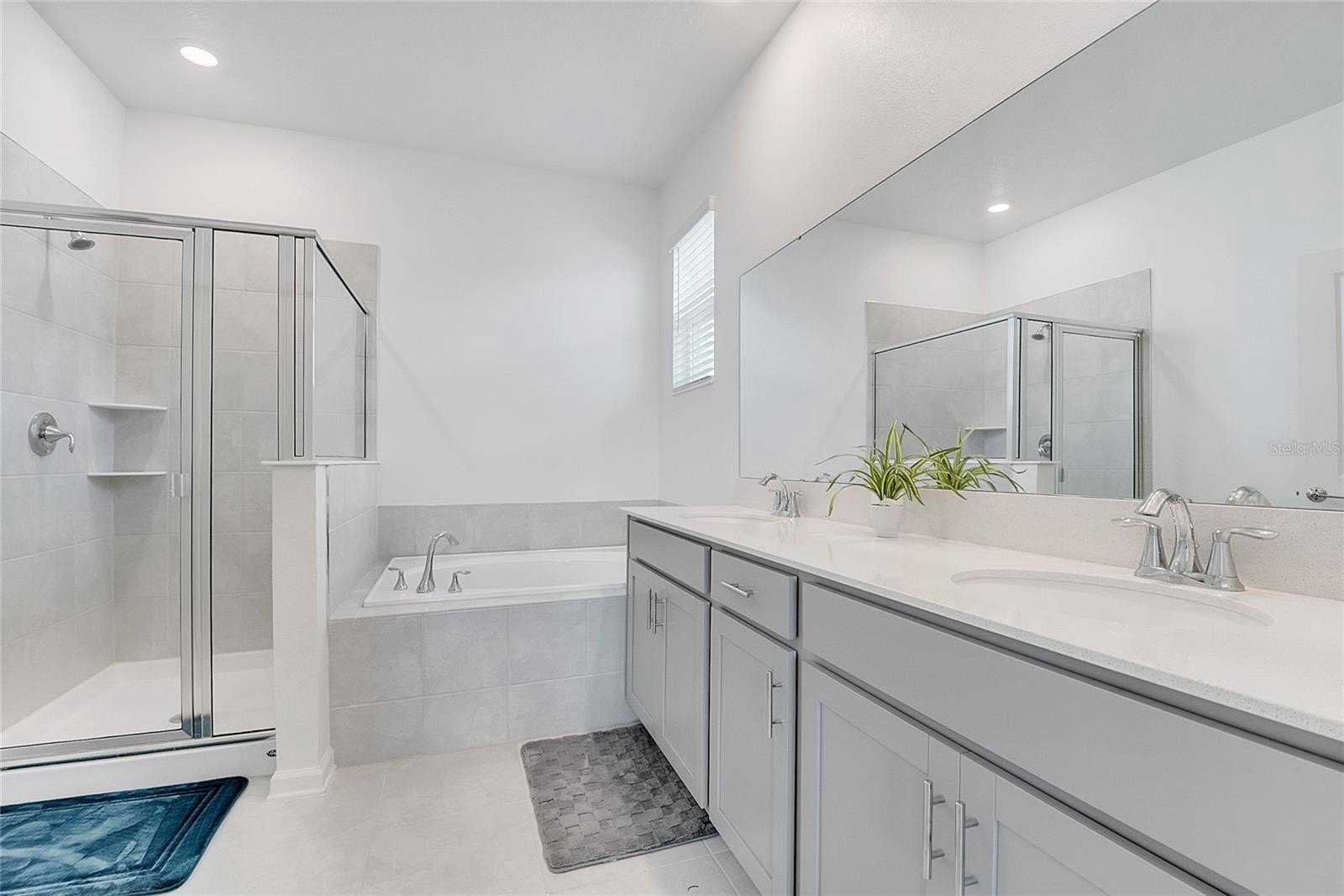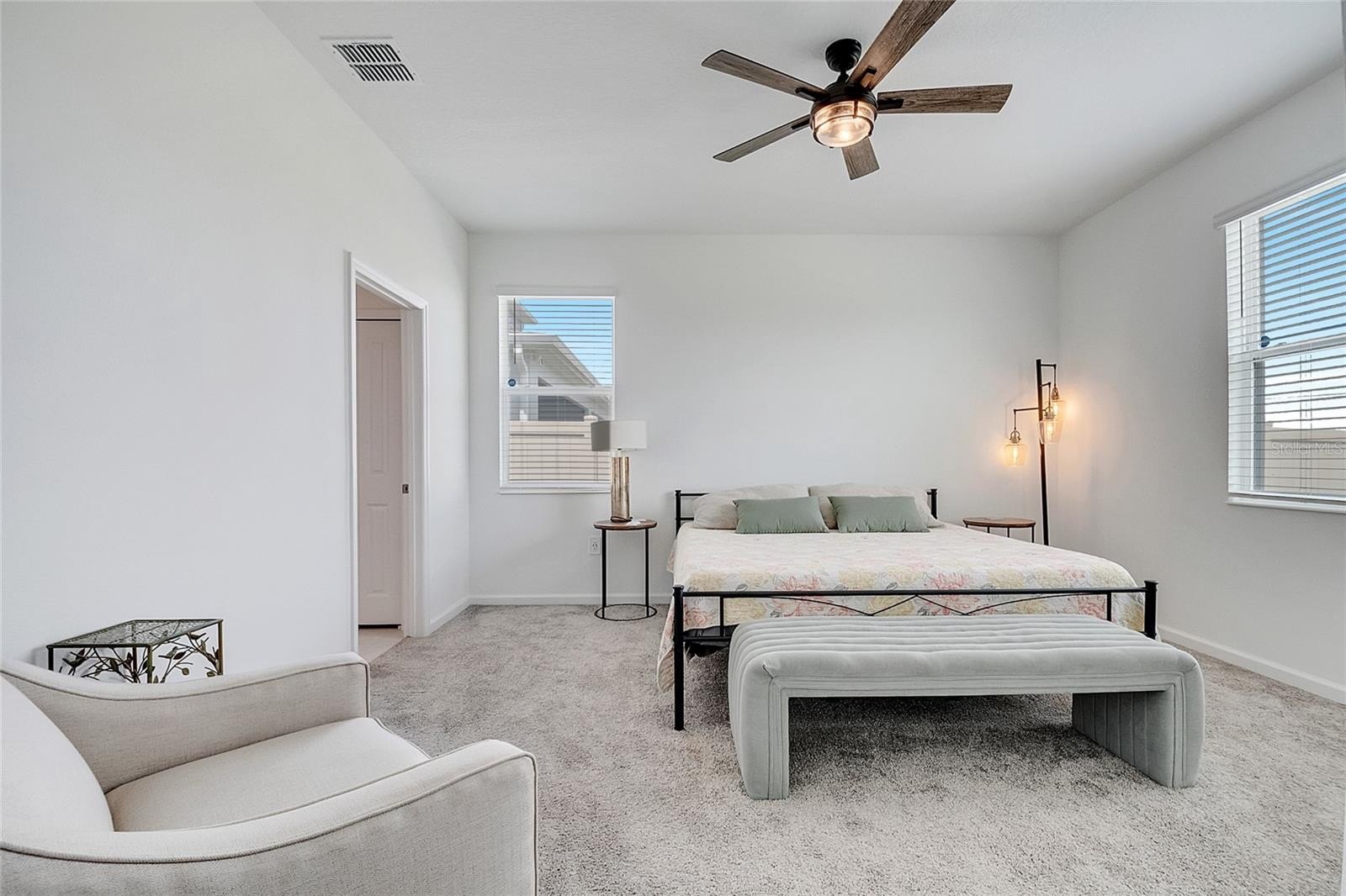 The primary suite boasts a custom-designed walk-in closet and plush carpet. The private en-suite includes dual sinks, a large soaking tub, and a separate walk-in shower.