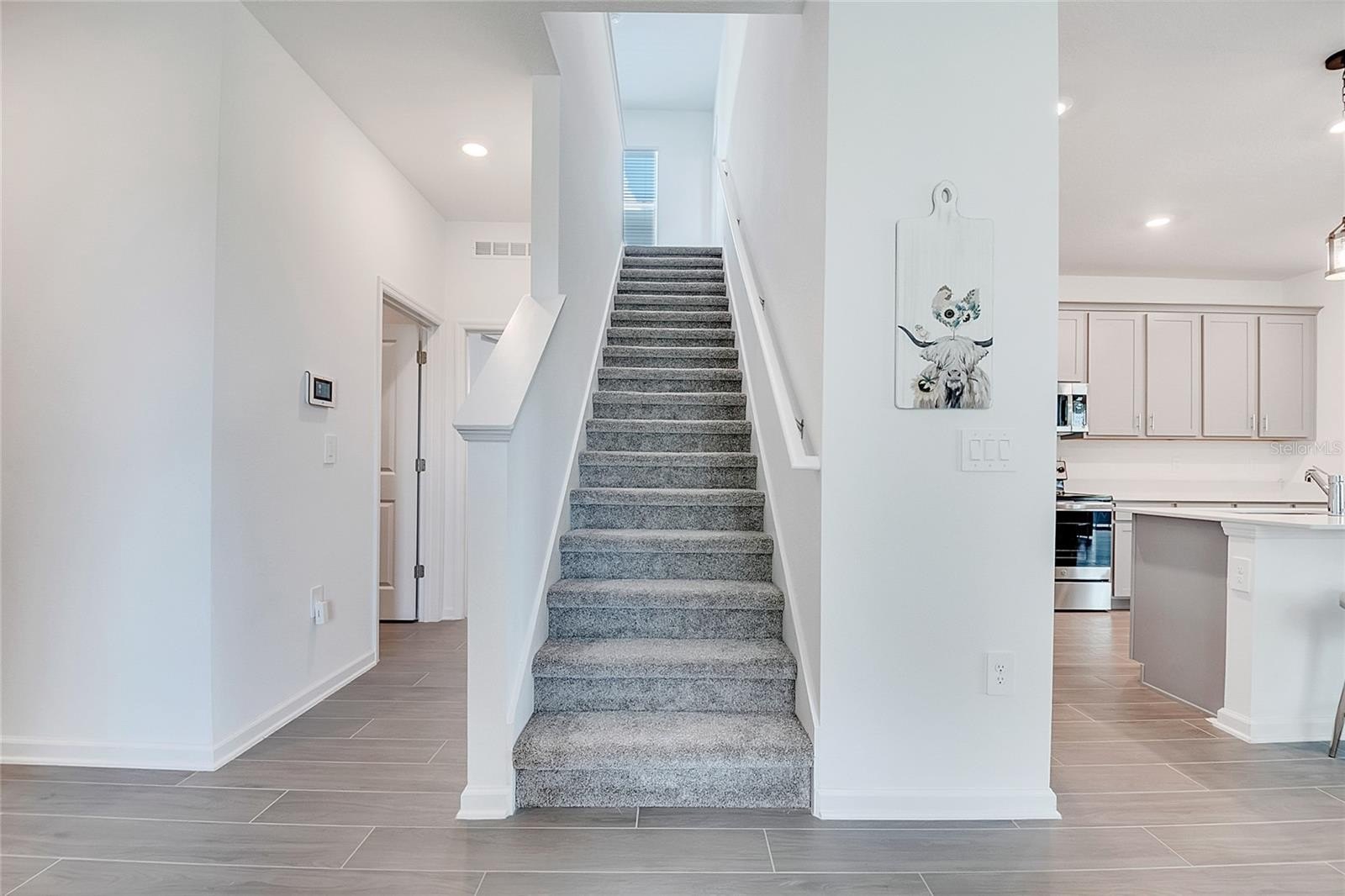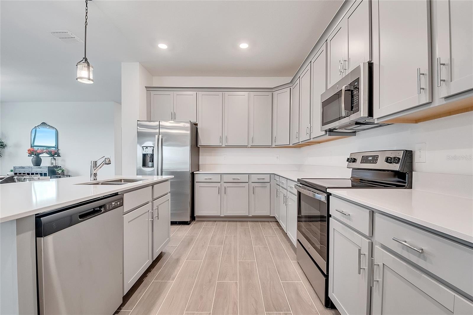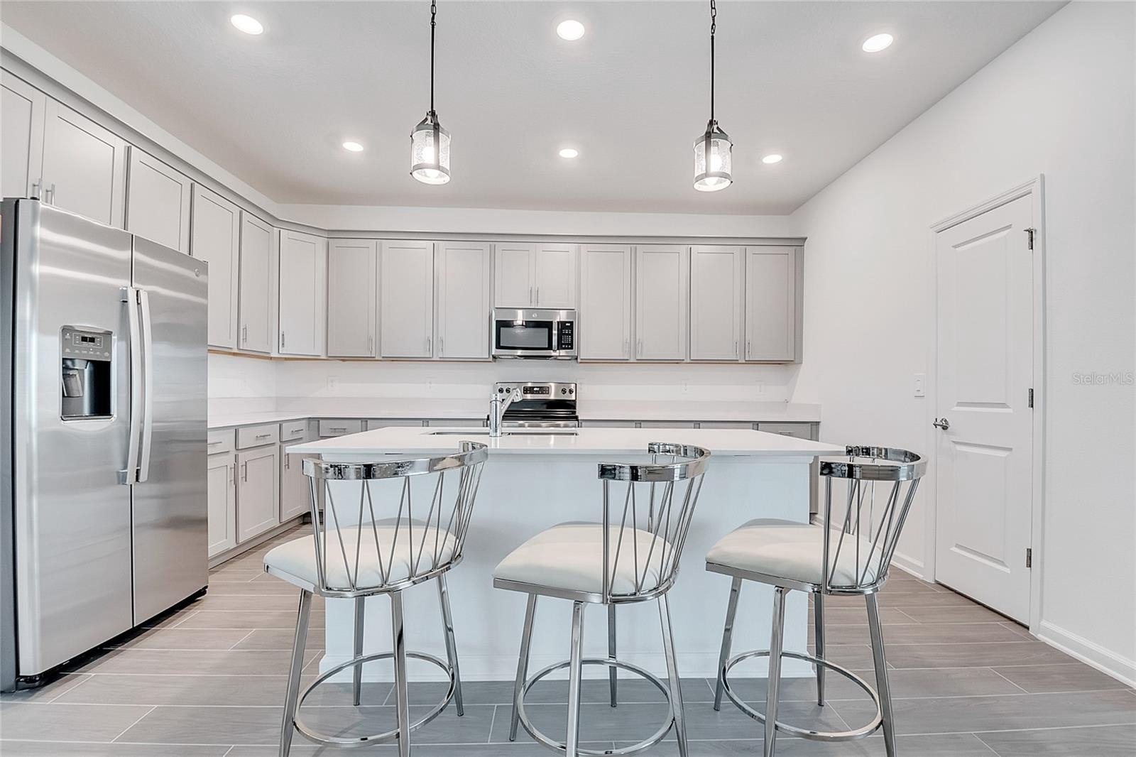 The heart of the home is the chef-inspired kitchen, featuring quartz countertops, a large island, and plenty of storage for all your culinary needs.
