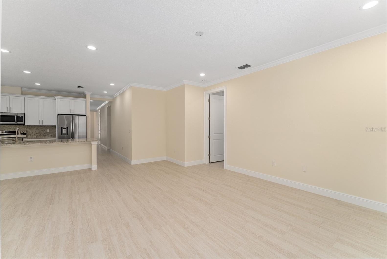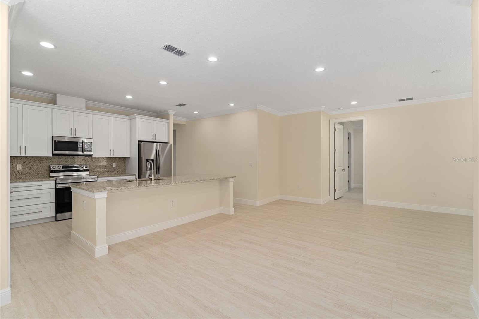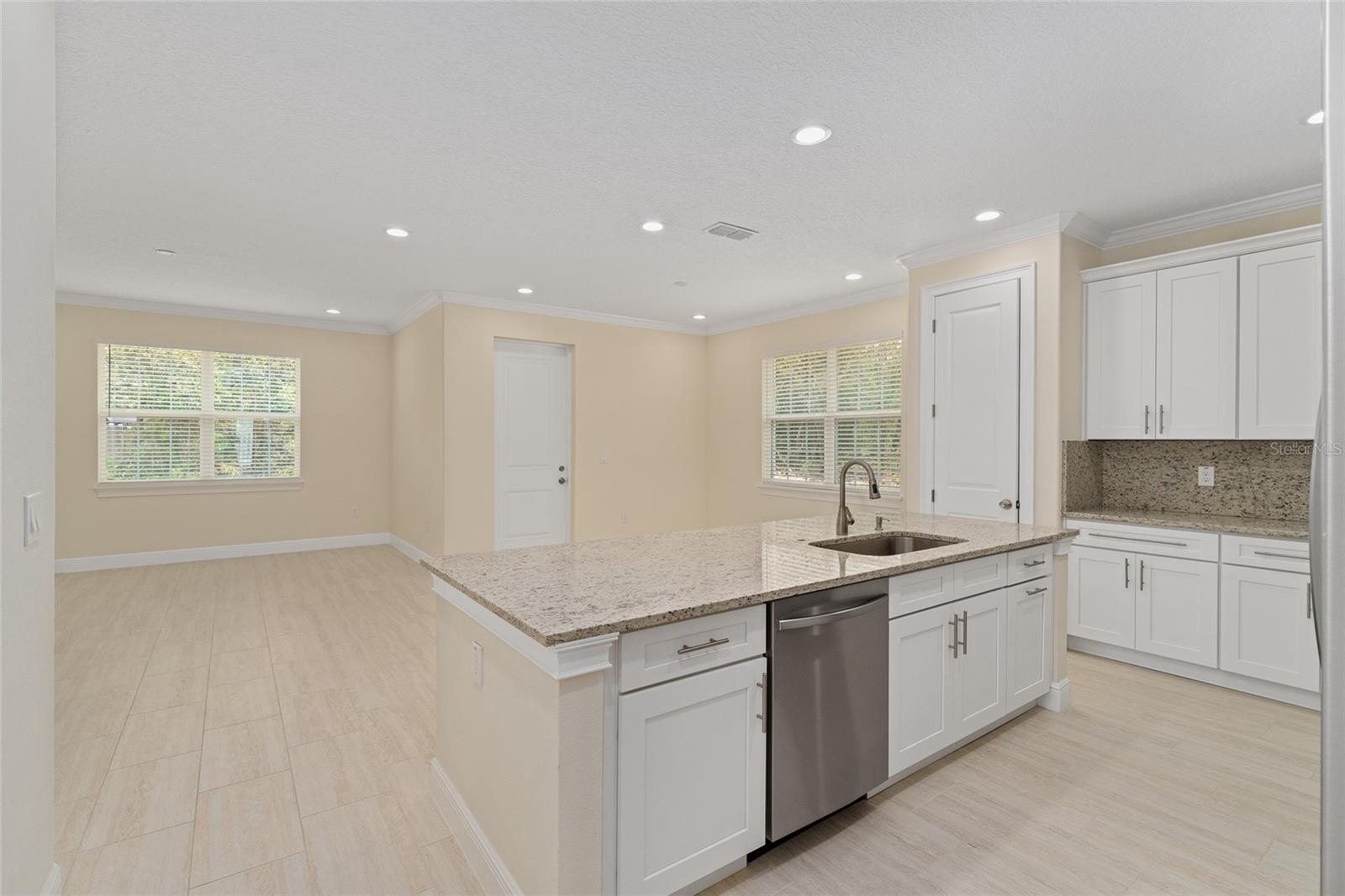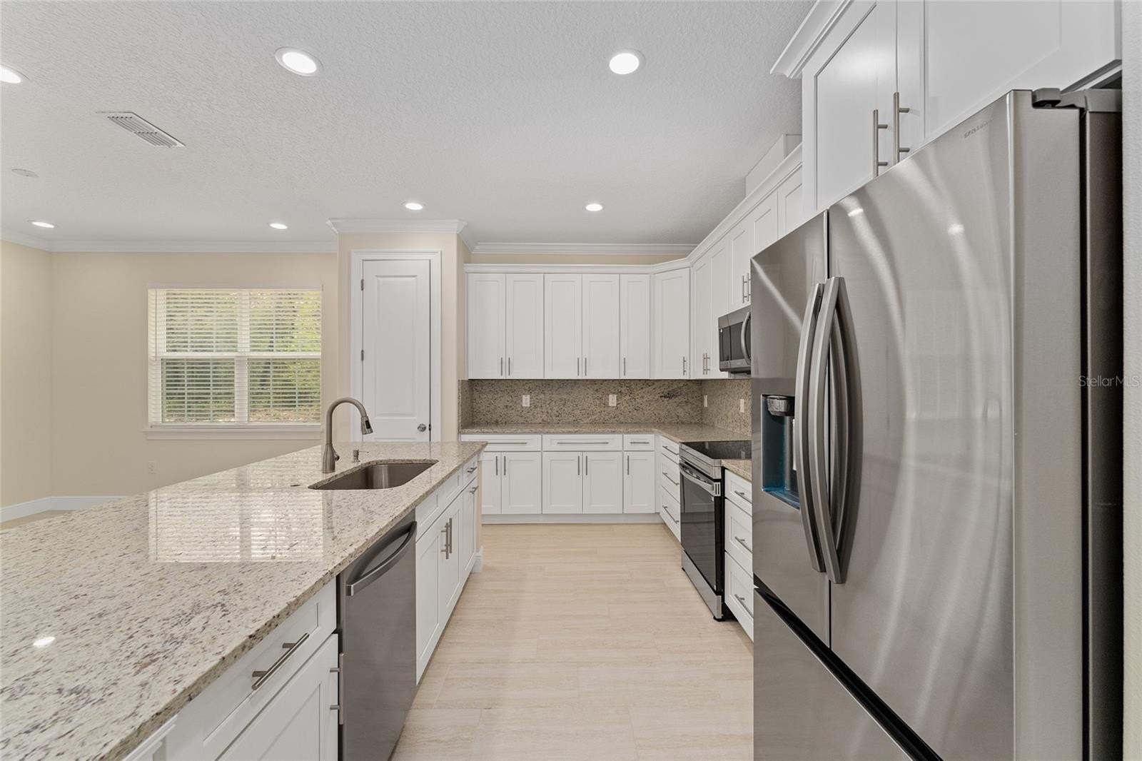 granite countertops that elevate the look and feel of the home. The kitchen seamlessly connects to the dining and