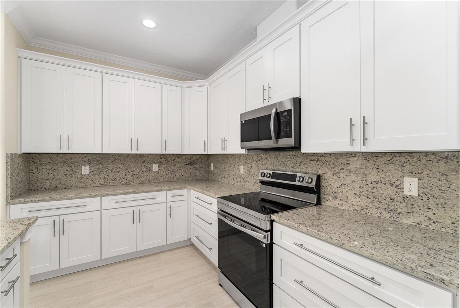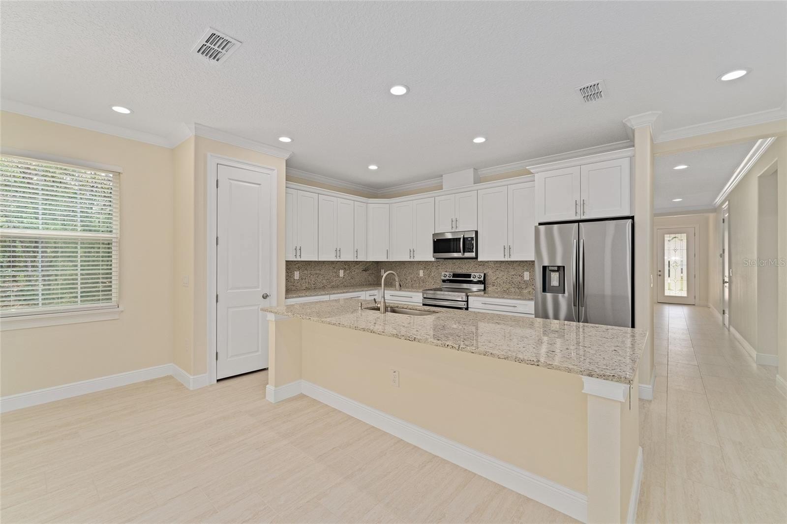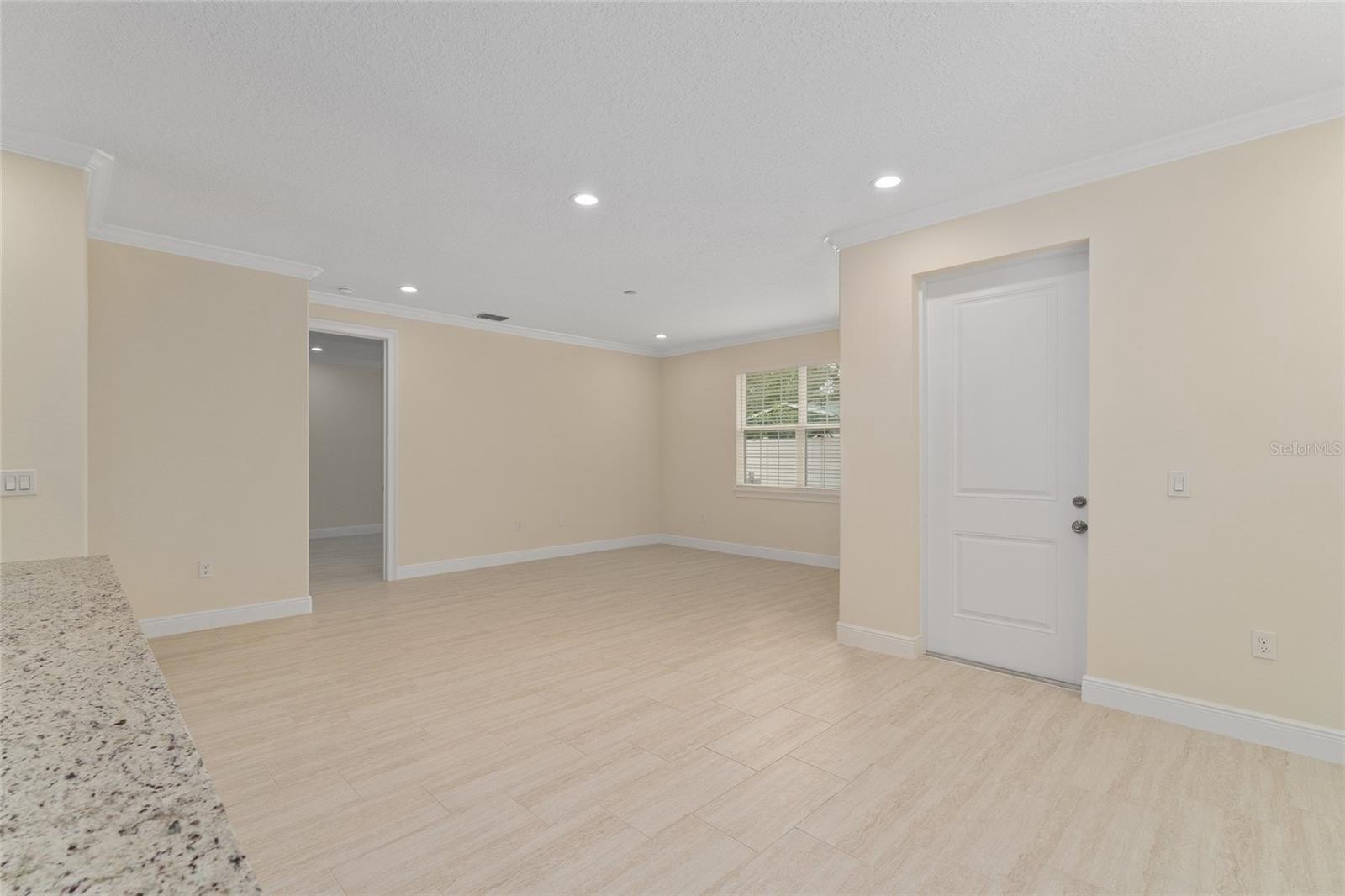 granite countertops that elevate the look and feel of the home. The kitchen seamlessly connects to the dining and