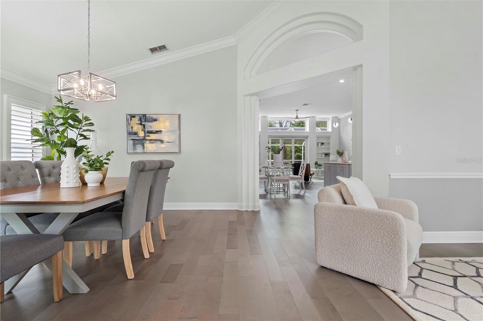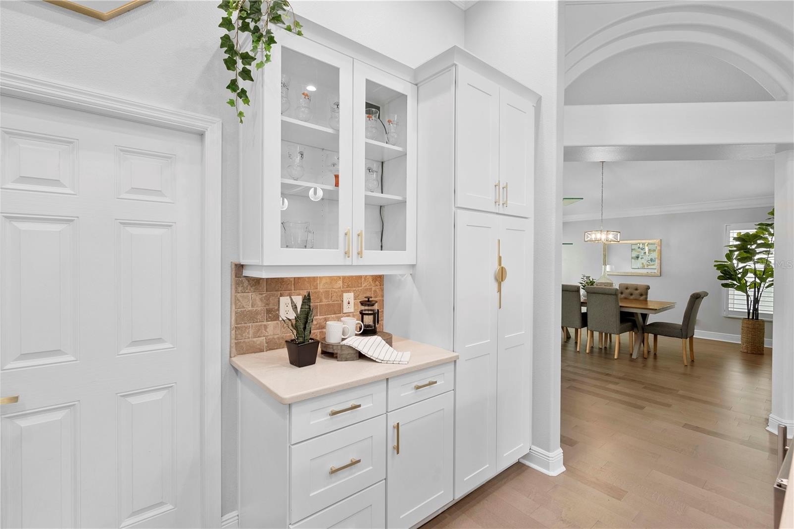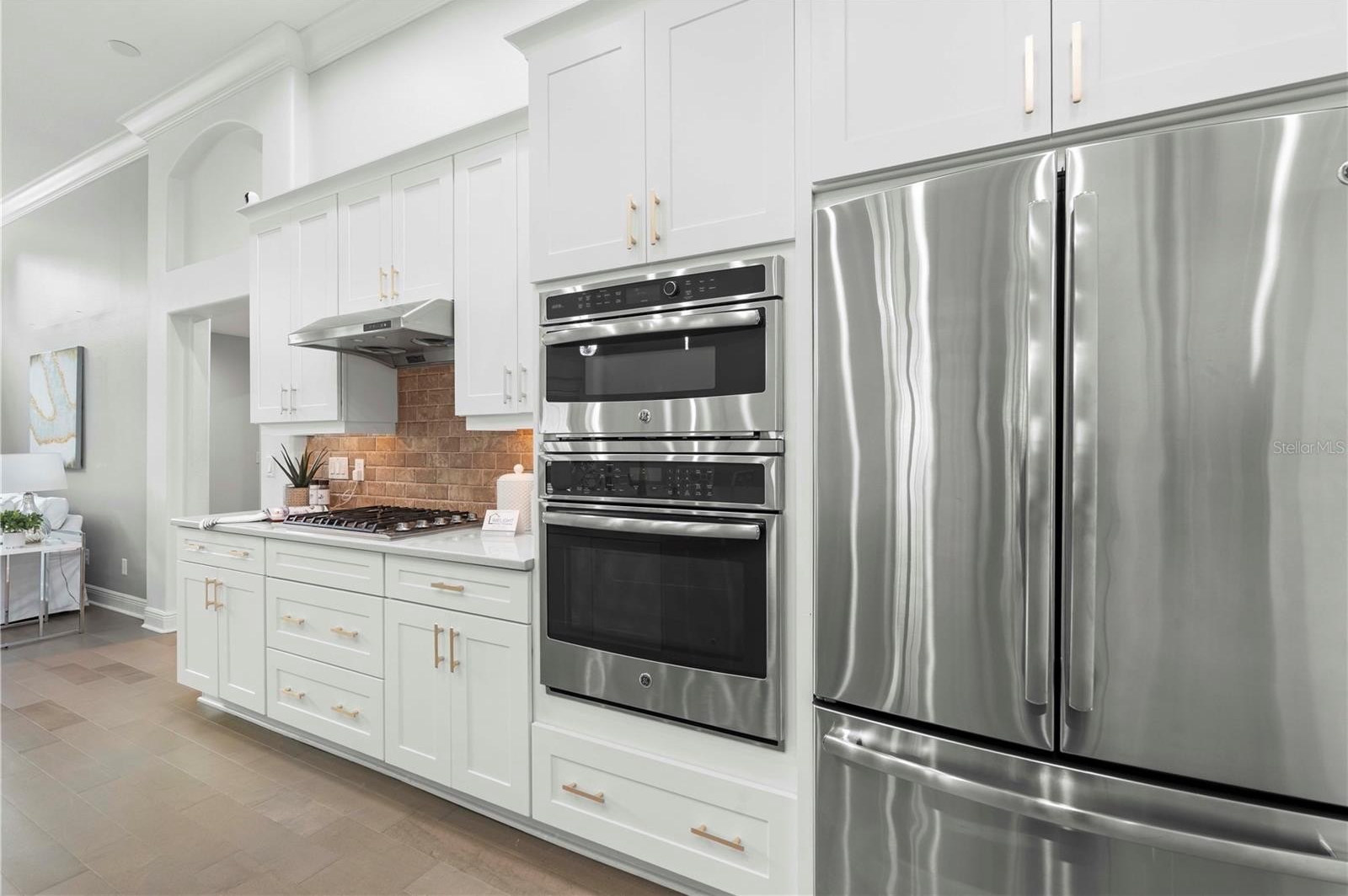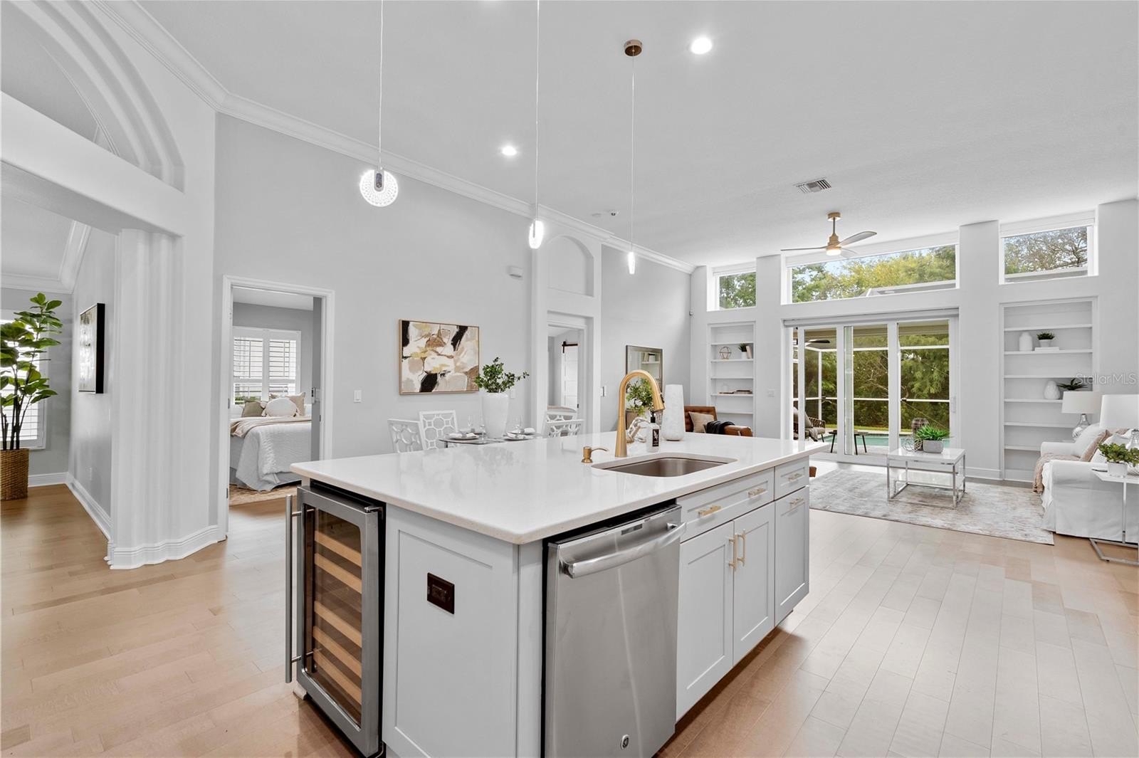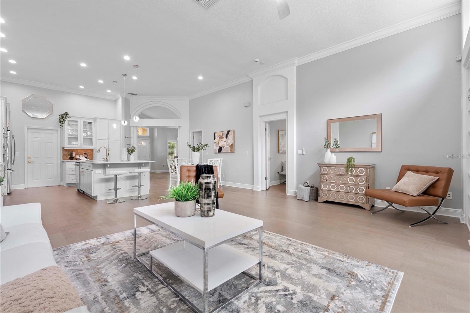 Step inside to soaring 12-FT ceilings, crown molding, and engineered hardwood floors (2021) that fill the home with natural light and timeless elegance. The chef’s kitchen, renovated in 2023, showcases soft-close solid wood cabinetry, premium Viking gas range, a large island with undermount sink, wine fridge, and ample storage—designed for both everyday living and unforgettable entertaining.
