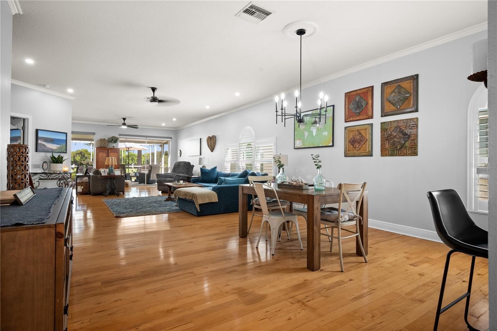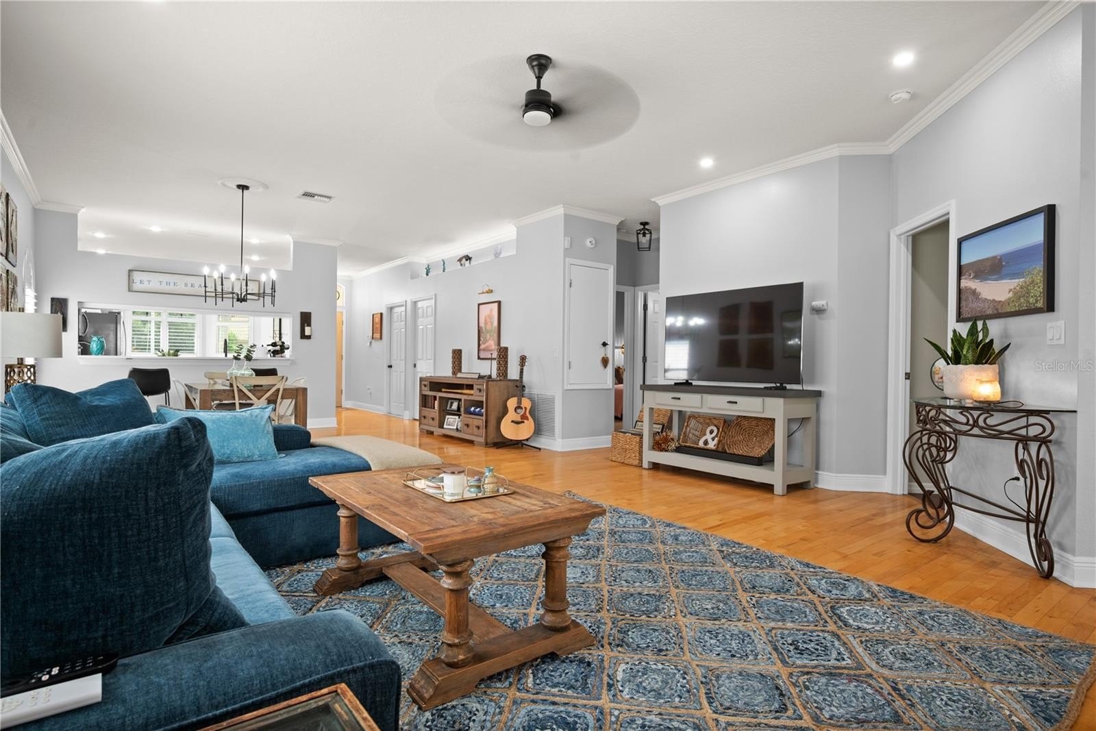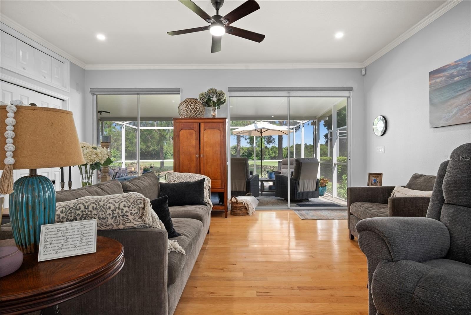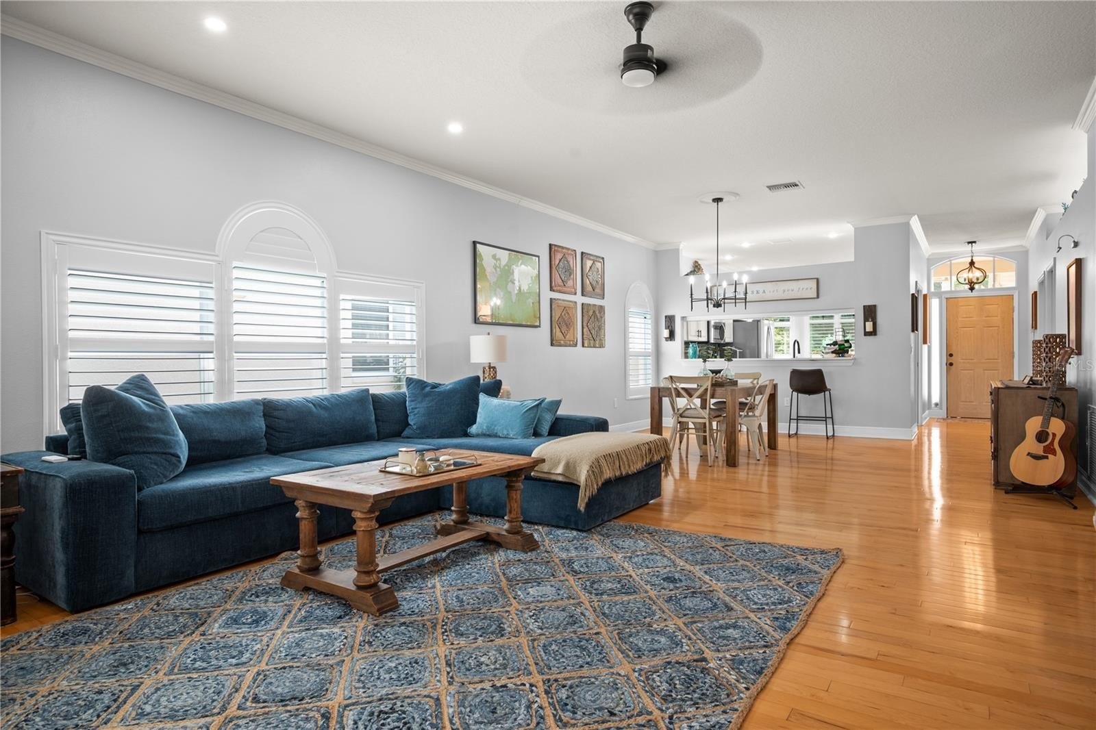 CLASSY & REMODELED HOME in the Crescent Oaks Country Club Community! Abundant wildlife from wild turkeys to deer often frequent the pristine grounds around this home, nestled on the 15th hole of the 18-hole championship Crescent Oaks Golf Course. Spacious and bright, the interior features a REMODELED KITCHEN, Plantation Shutters and double Sliders that open to a newly screened-in patio. The setting is ideal for entertaining and relaxing alike. Freshly painted with STUNNING WOOD FLOORS in the main living area add to the allure of this picture perfect space to enjoy your life. With the primary bedroom that offers a relaxing GARDEN TUB, a separate shower and a walk-in closet with custom shelving, along with a double vanity and a private toilet area and you have just landed in paradise! There are a host of modern conveniences that come with this home along with a new GENERAC WHOLE HOME GENERATOR - ensuring that you’re never without power. This home has never received water intrusion or flooded. And it comes with a transferable flood policy. The INDOOR LAUNDRY comes with a newer washer and dryer and the garage features a water softener and irrigation system. This home is loaded with storage space and is just exquisite!! Other highlights are NEWER ROOF (2021) fresh exterior PAINT (2024) HVAC system (2013). No CDD fees & Low HOA fees cover lawn care, shrub trimming, maintenance, exterior water, irrigation system, exterior home painting on a rotating basis, 24-7 guard, and access to the clubhouse. * DOG FRIENDLY * The community amenities include the 18-hole championship golf course plus clubhouse, nestled in this gated community! GOLF? TENNIS? PICKLEBALL, ANYONE?
