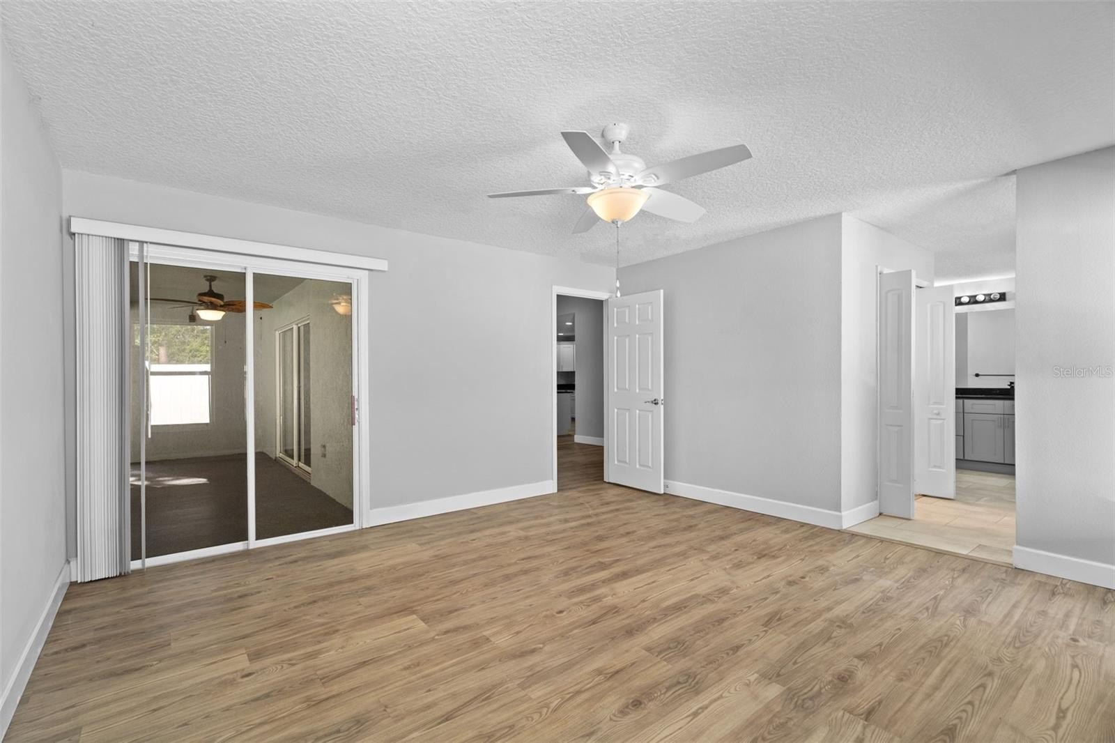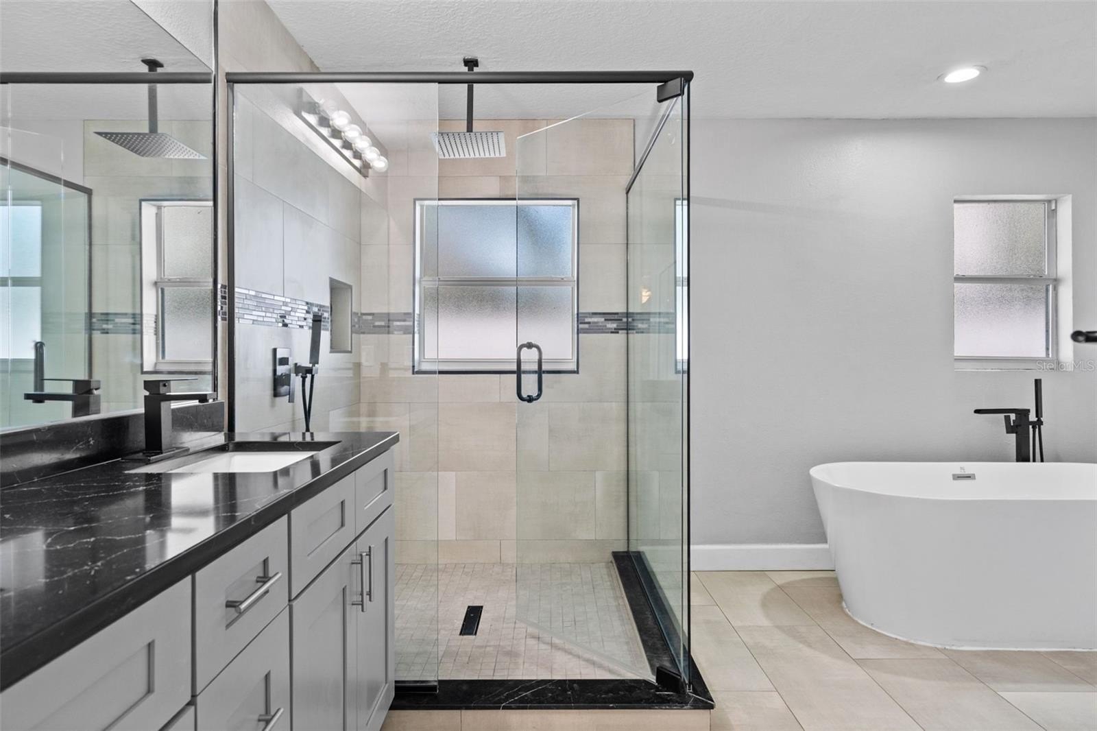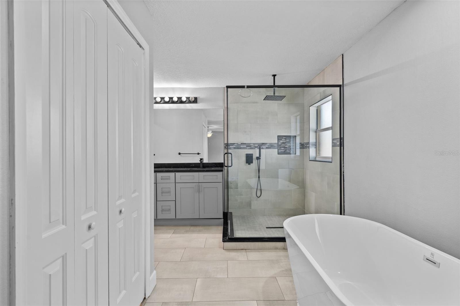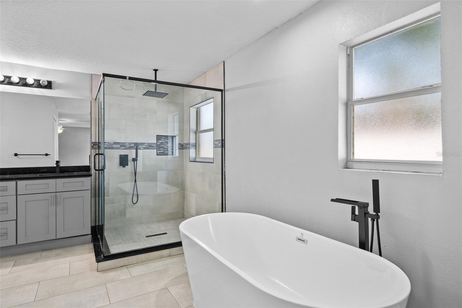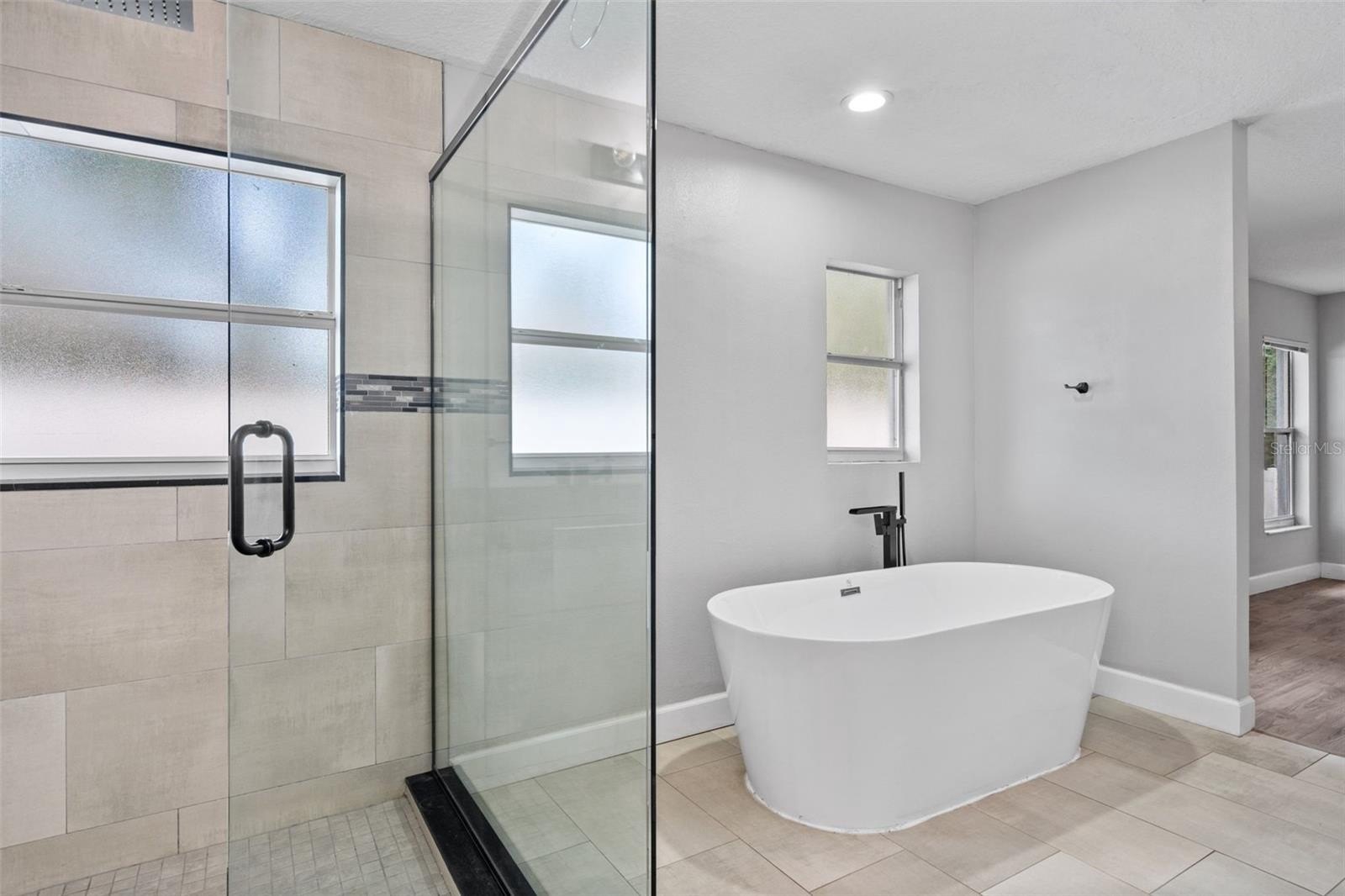 The primary suite is filled with natural light and offers balcony access, a freestanding soaking tub, a walk-in shower, and a spacious closet.