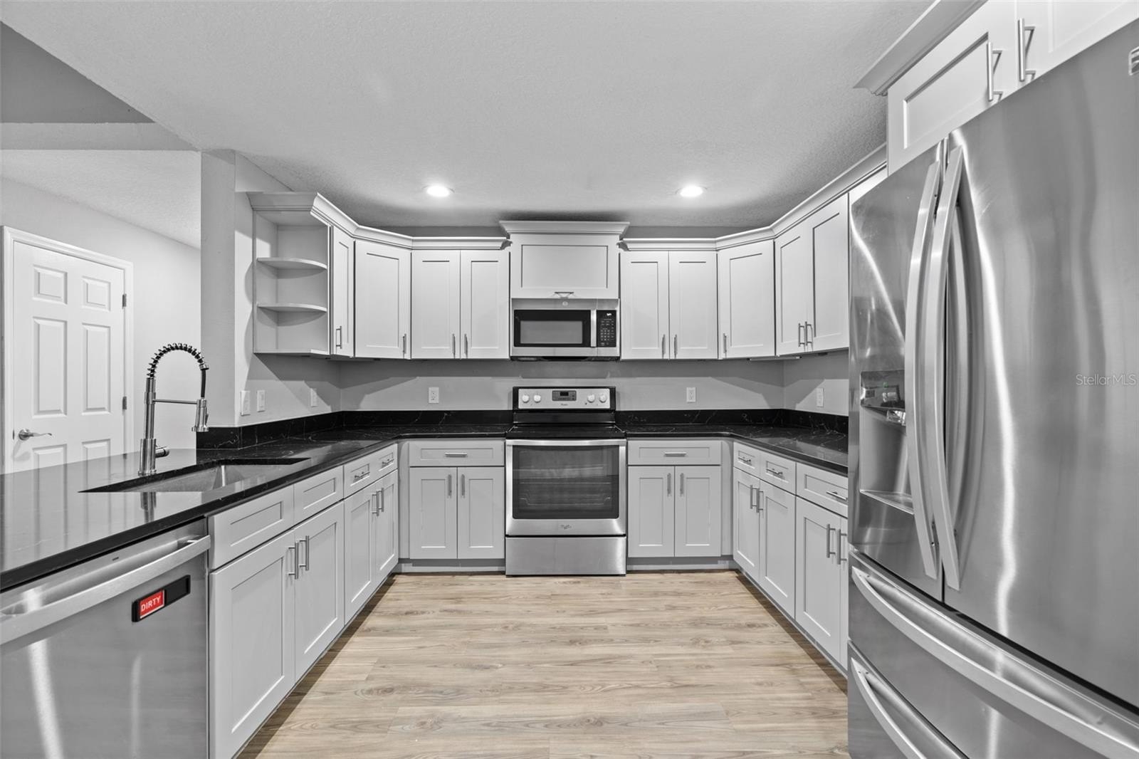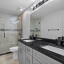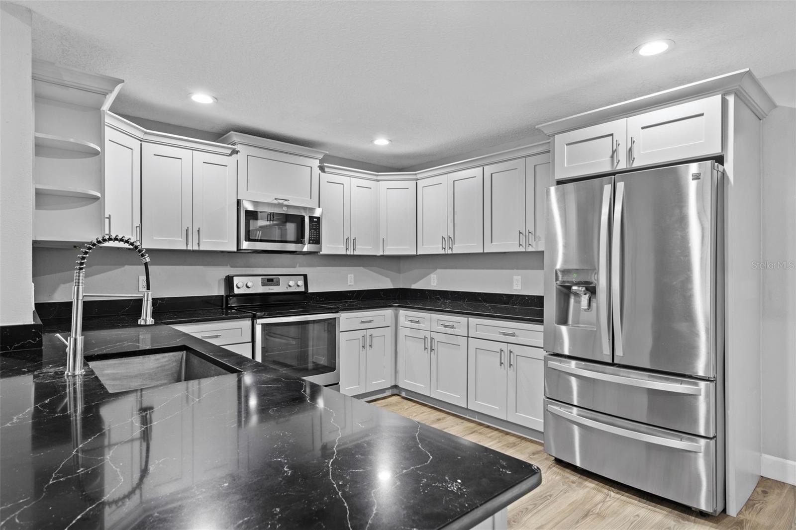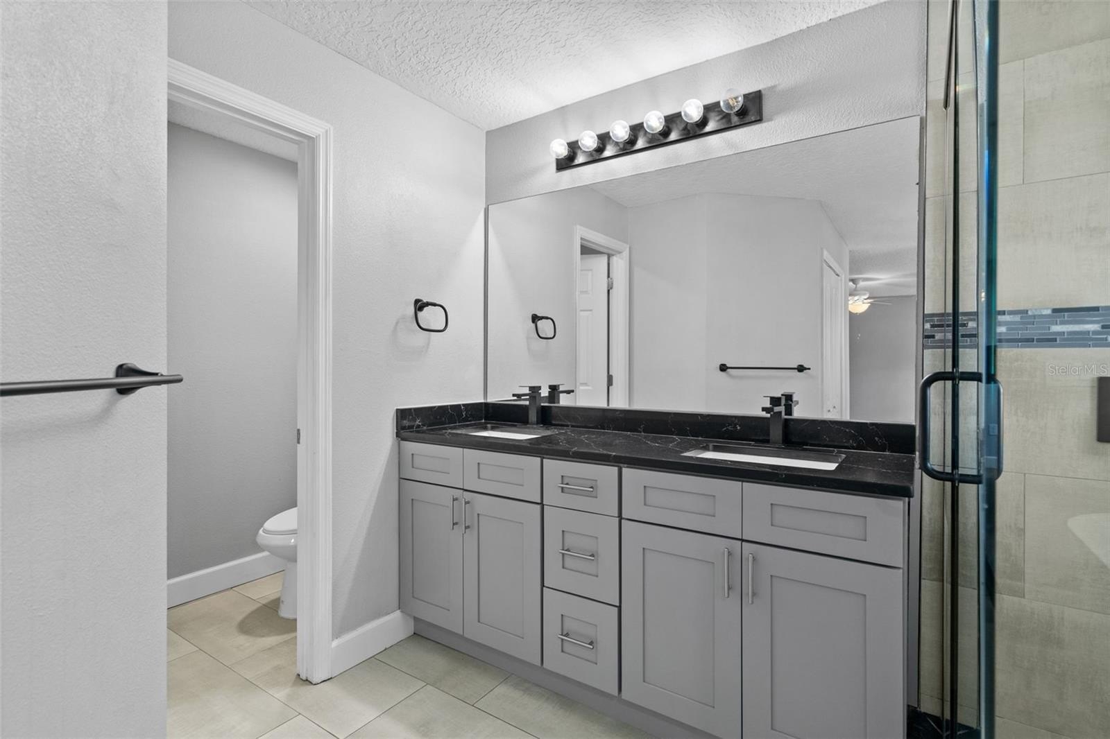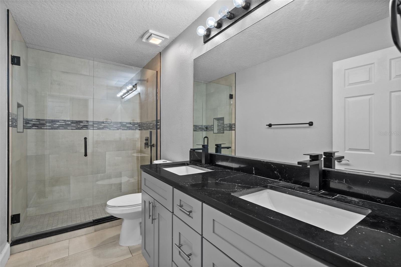 Interior highlights include freshly textured and painted walls, commercial-grade luxury vinyl flooring, and a gourmet kitchen with stainless steel appliances, new soft-close cabinetry, and elegant black Carrara quartz countertops. Both bathrooms have been updated with Carrara quartz, porcelain tile, and brand-new glass shower enclosures.