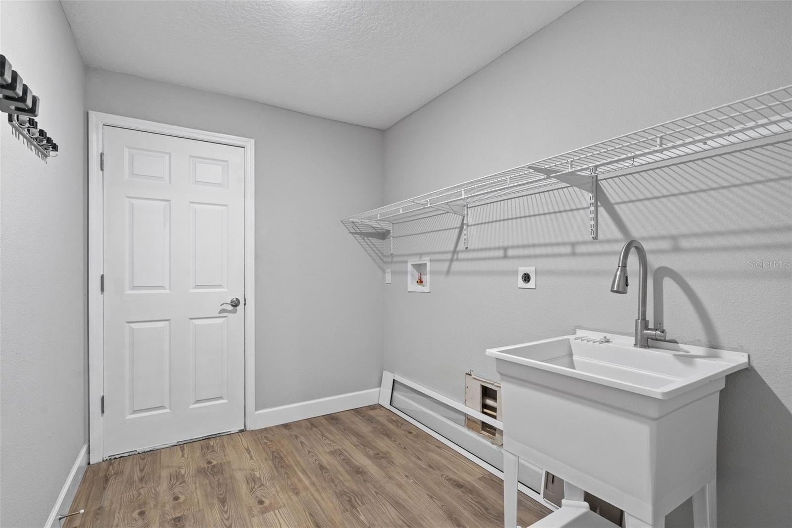 Laundry room with utility sink and shelving