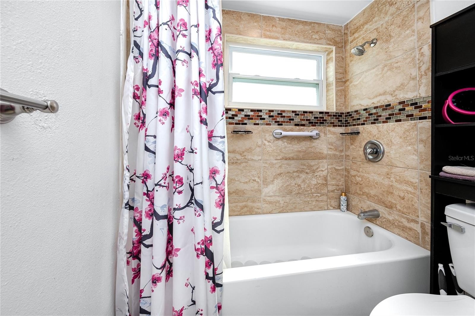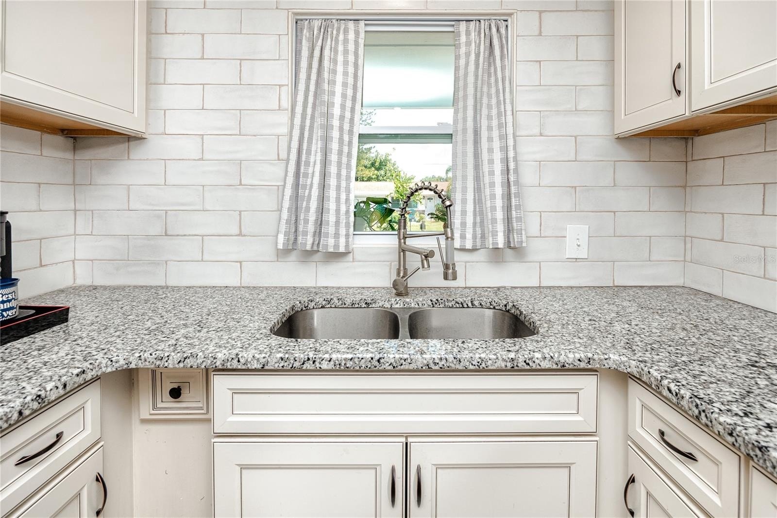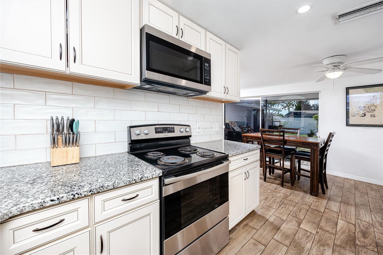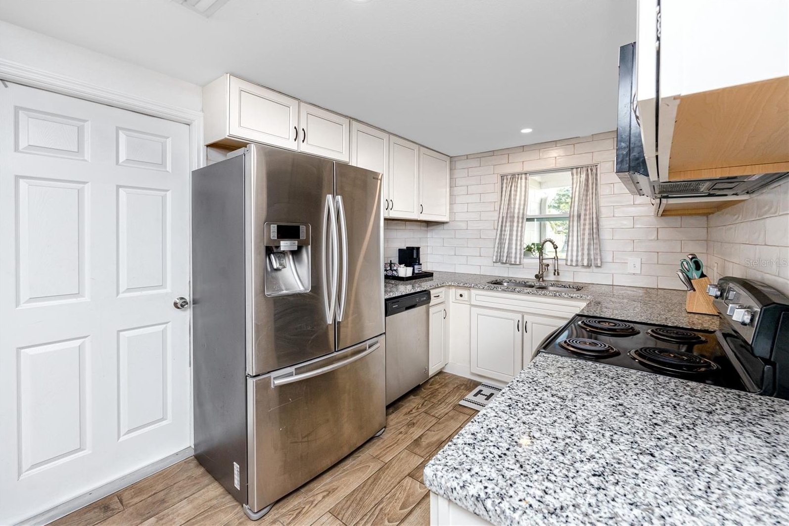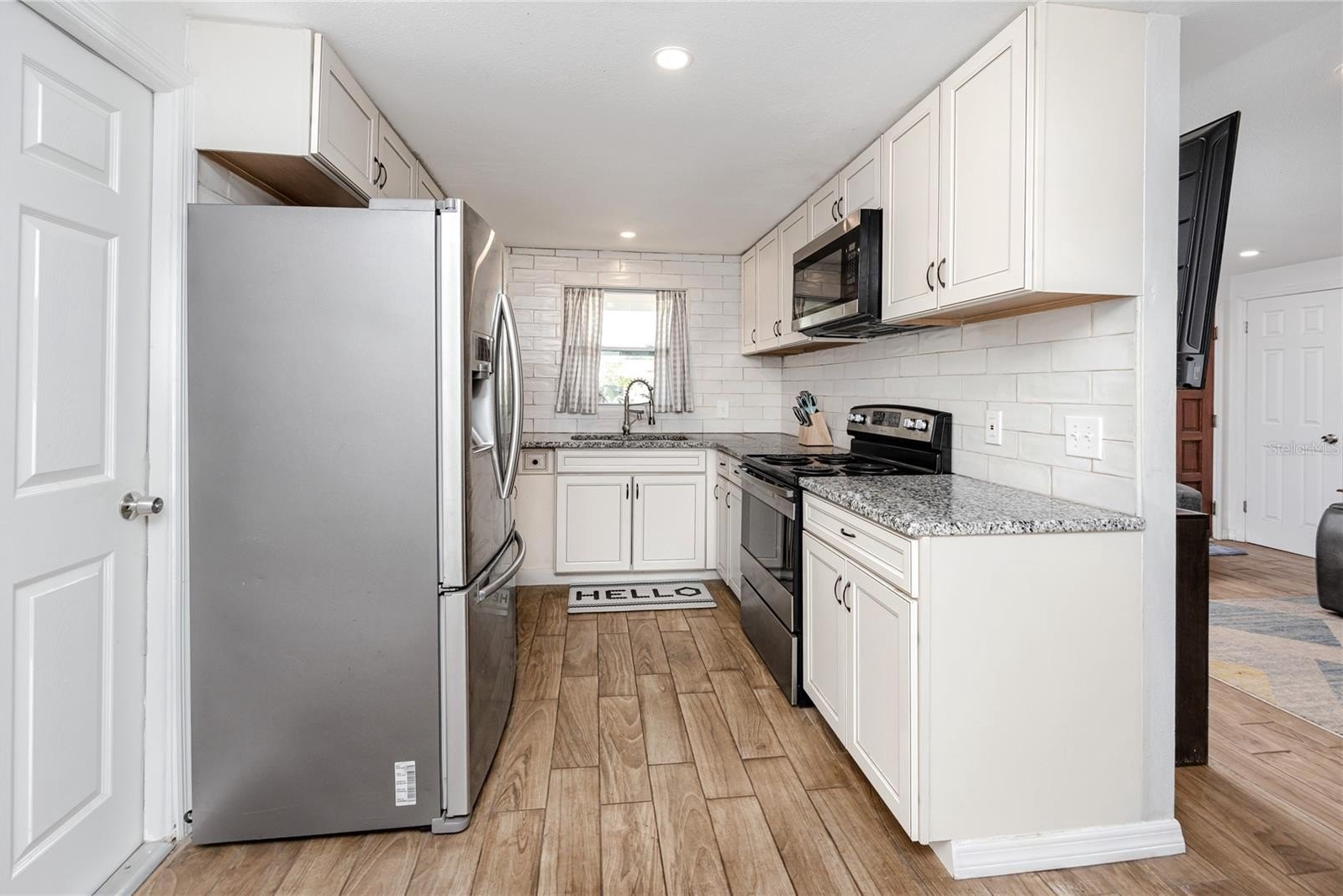 Inside, the 3-bedroom, 1-bath layout has been thoughtfully updated to combine comfort and modern design. The open floor plan is anchored by new wood-look tile flooring throughout, creating a seamless flow from room to room. The kitchen is a showpiece with stone countertops, sleek cabinetry, and a subway tile backsplash that blends style with durability—perfect for everyday use or appealing to future guests. The bathroom has been fully updated as well, with matching stone counters, modern cabinetry, and a tub-shower framed in elegant tile. All major appliances convey, including a full-sized Samsung washer and dryer.