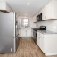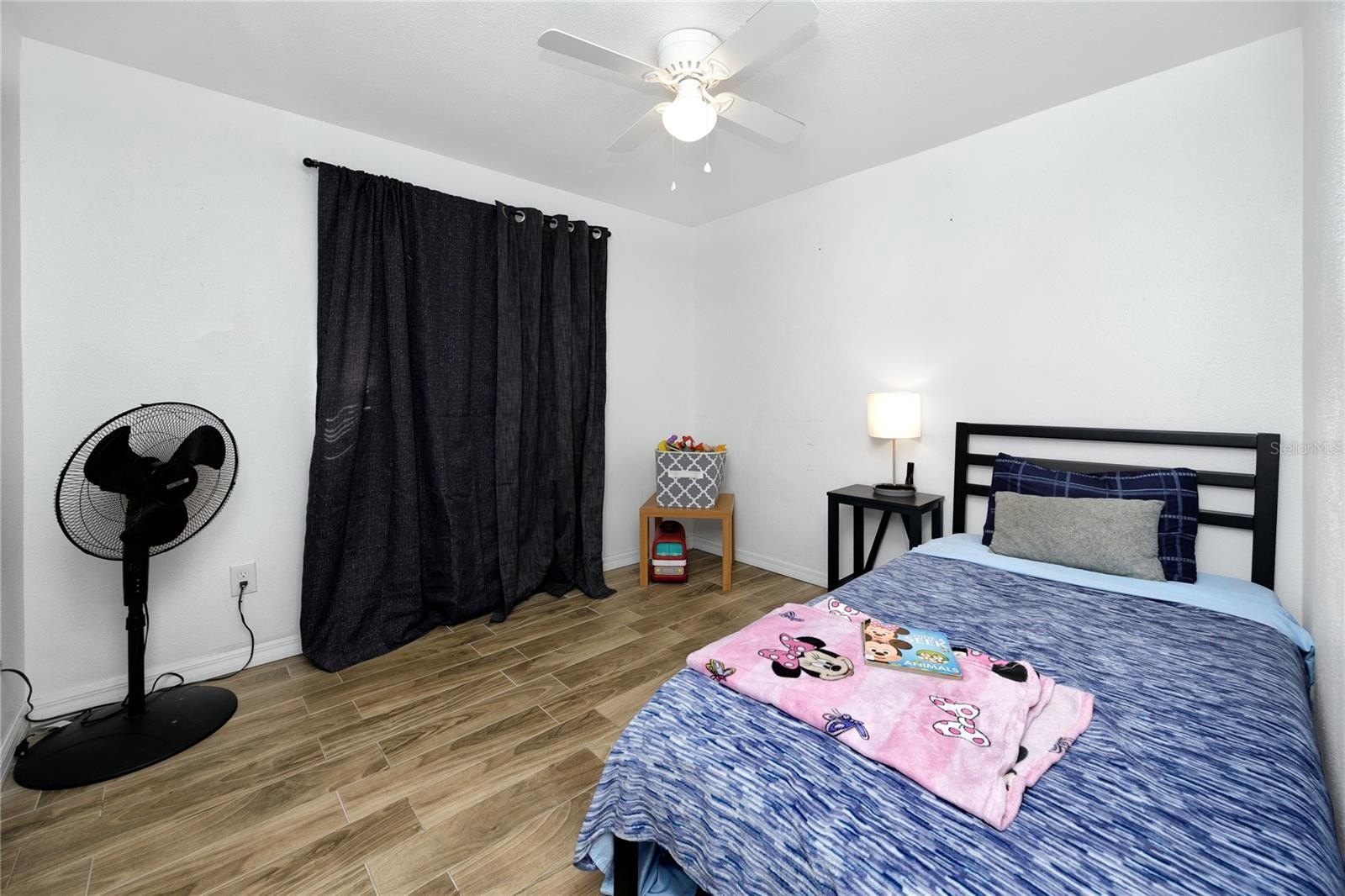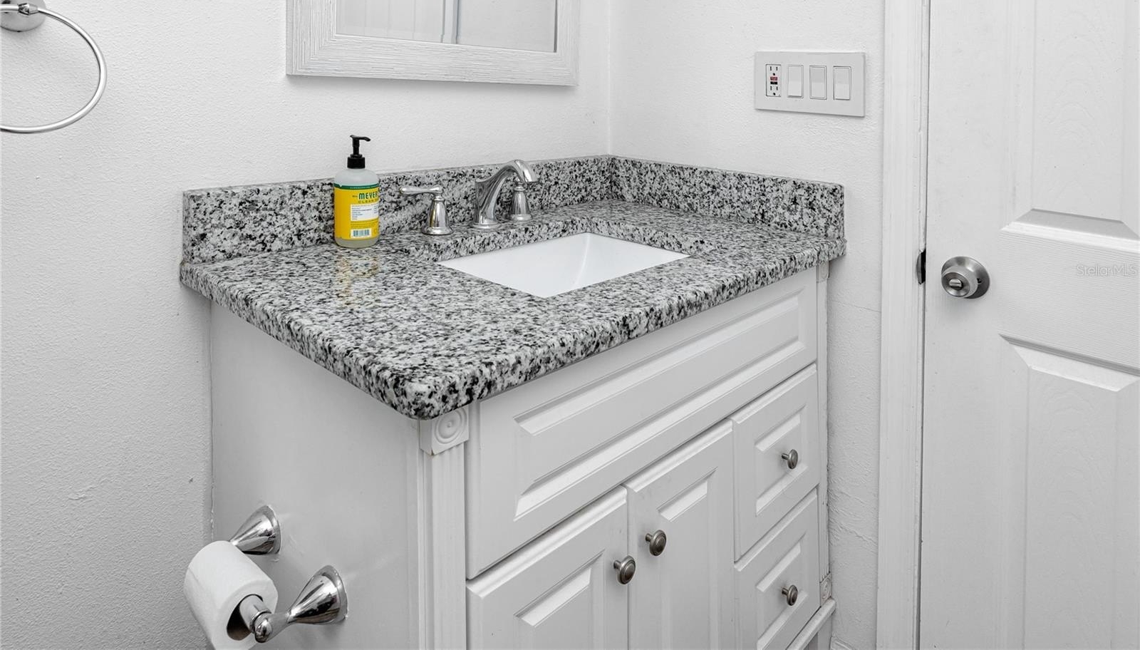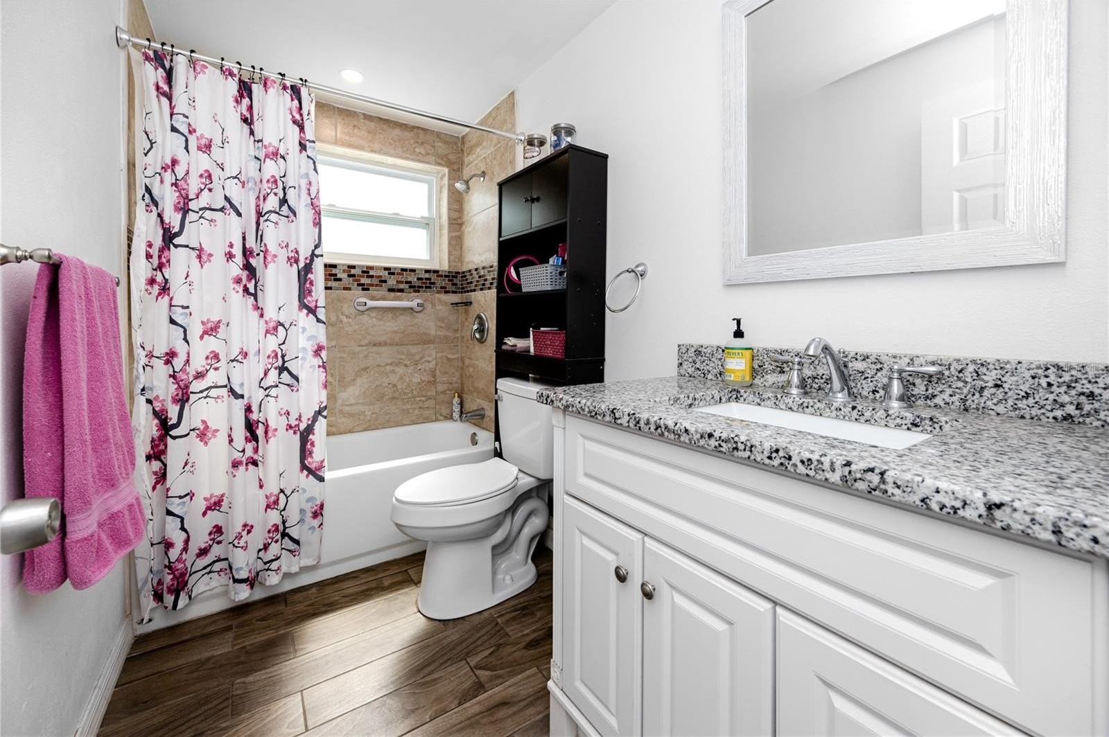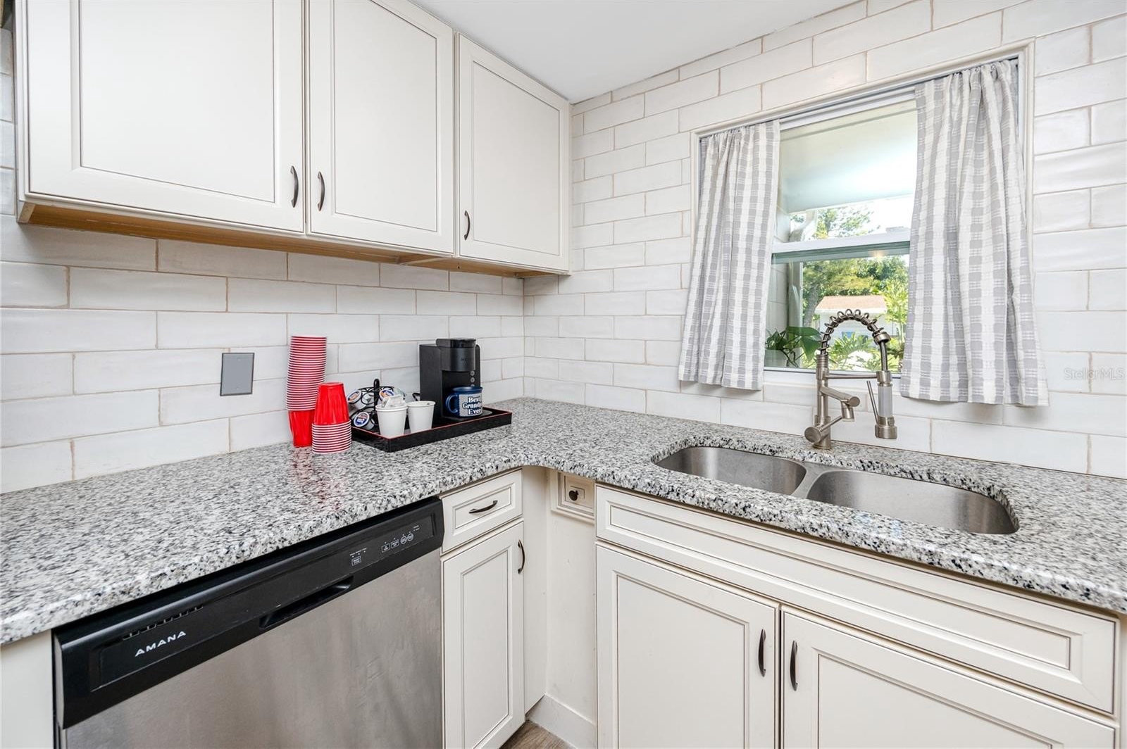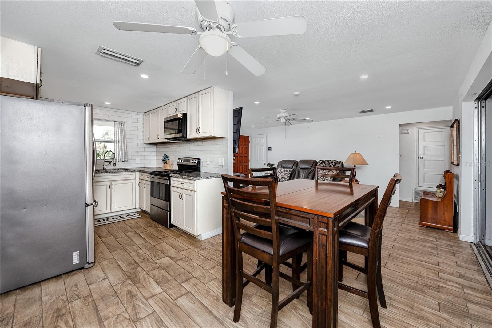 Inside, the 3-bedroom, 1-bath layout has been thoughtfully updated to combine comfort and modern design. The open floor plan is anchored by new wood-look tile flooring throughout, creating a seamless flow from room to room. The kitchen is a showpiece with stone countertops, sleek cabinetry, and a subway tile backsplash that blends style with durability—perfect for everyday use or appealing to future guests. The bathroom has been fully updated as well, with matching stone counters, modern cabinetry, and a tub-shower framed in elegant tile. All major appliances convey, including a full-sized Samsung washer and dryer.