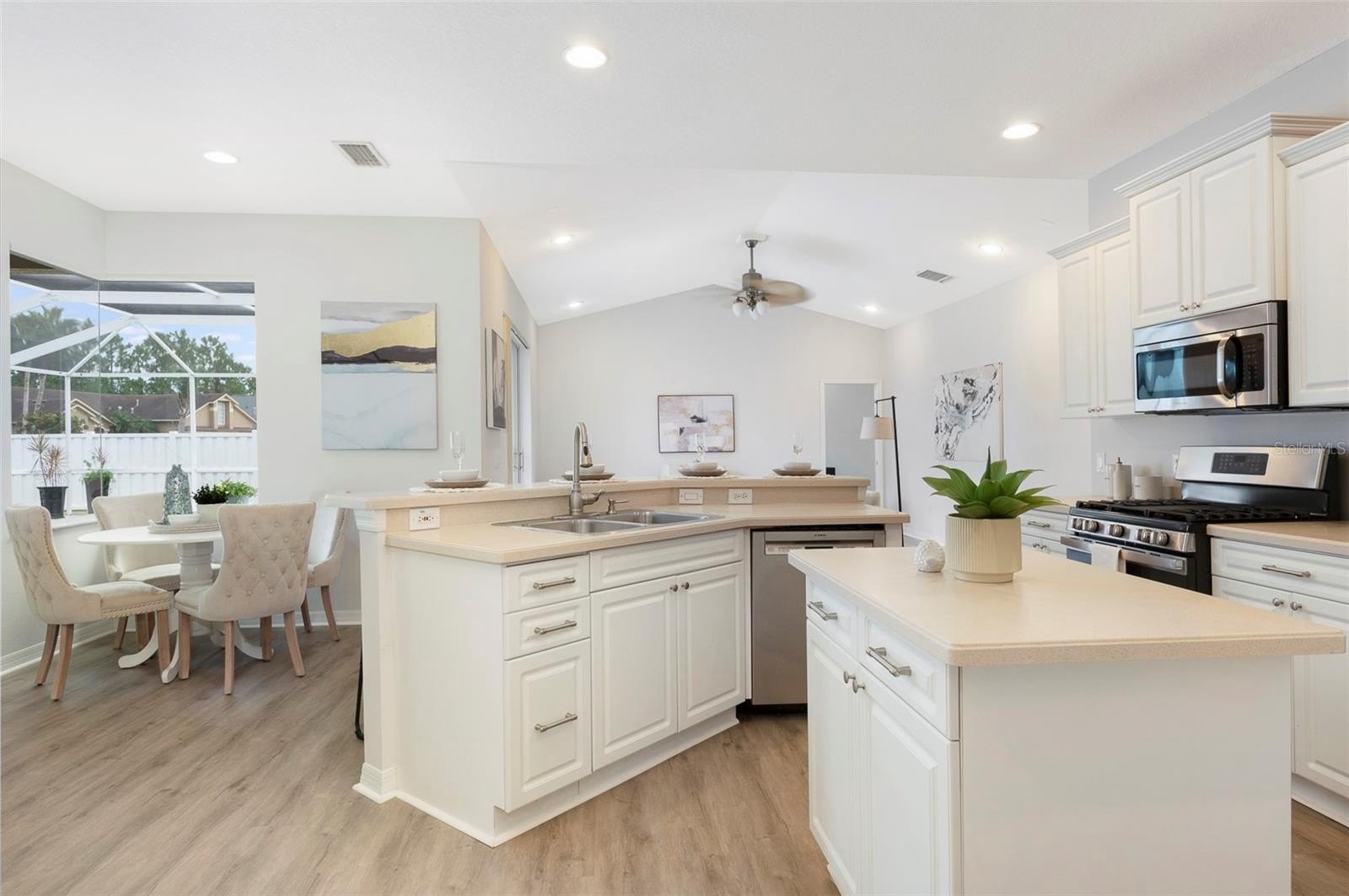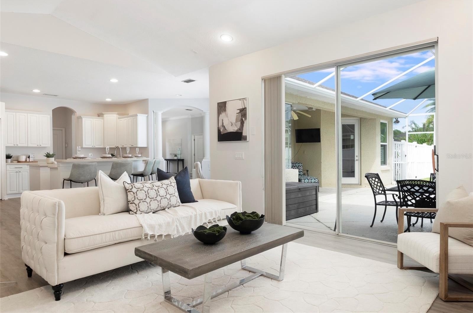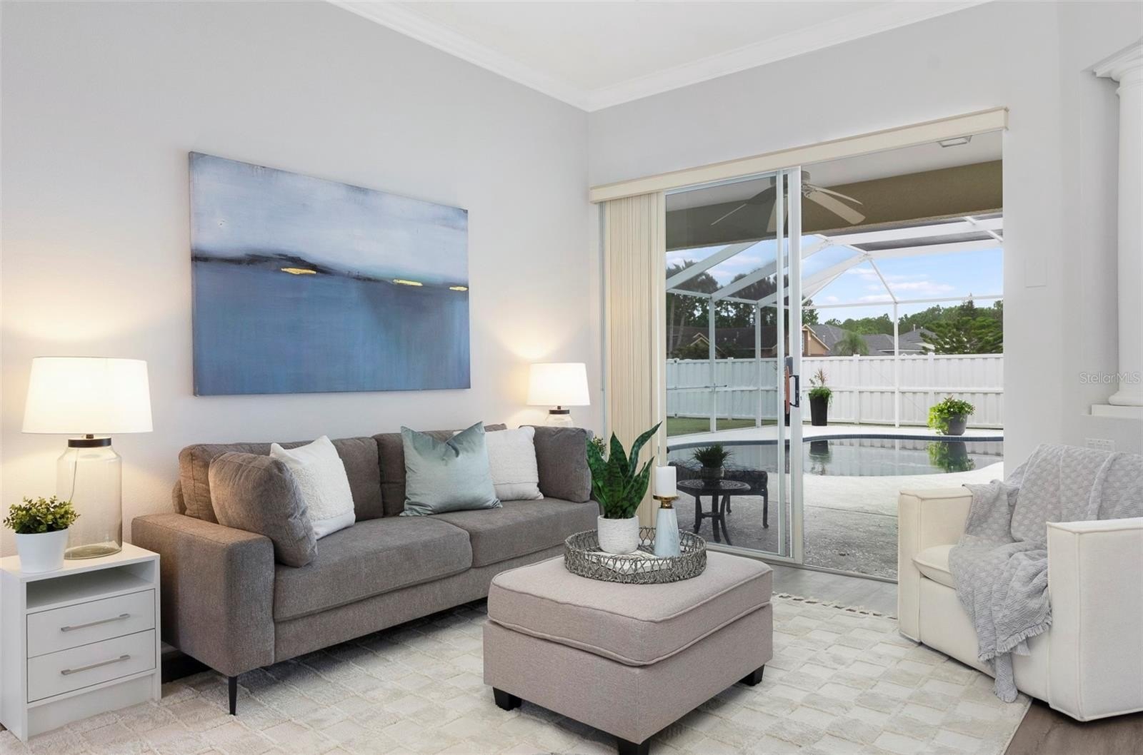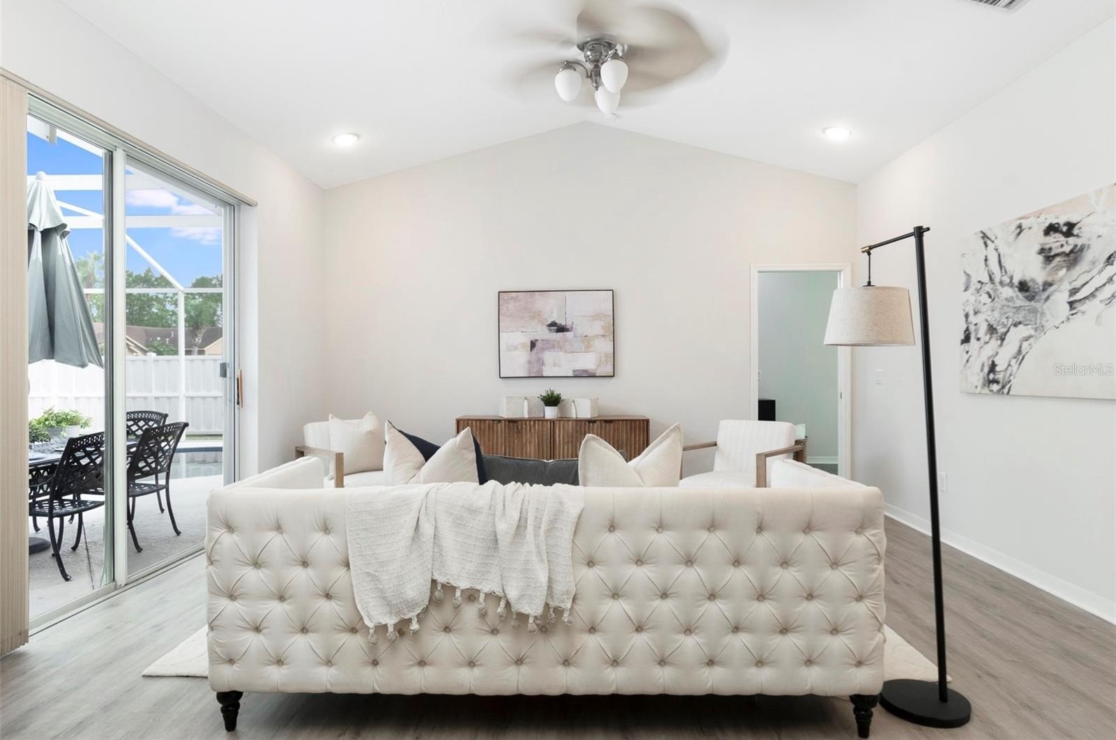 At the heart of the home, the kitchen shines as a true gathering place. Crisp white cabinetry, stainless steel appliances, a spacious center island, and plenty of counter space make it as functional as it is beautiful. Whether preparing a casual meal or hosting a holiday dinner, this kitchen will inspire. Just steps away, the family room with its tall ceilings offers an inviting space to relax, with views that draw you right out to the lanai and pool area.