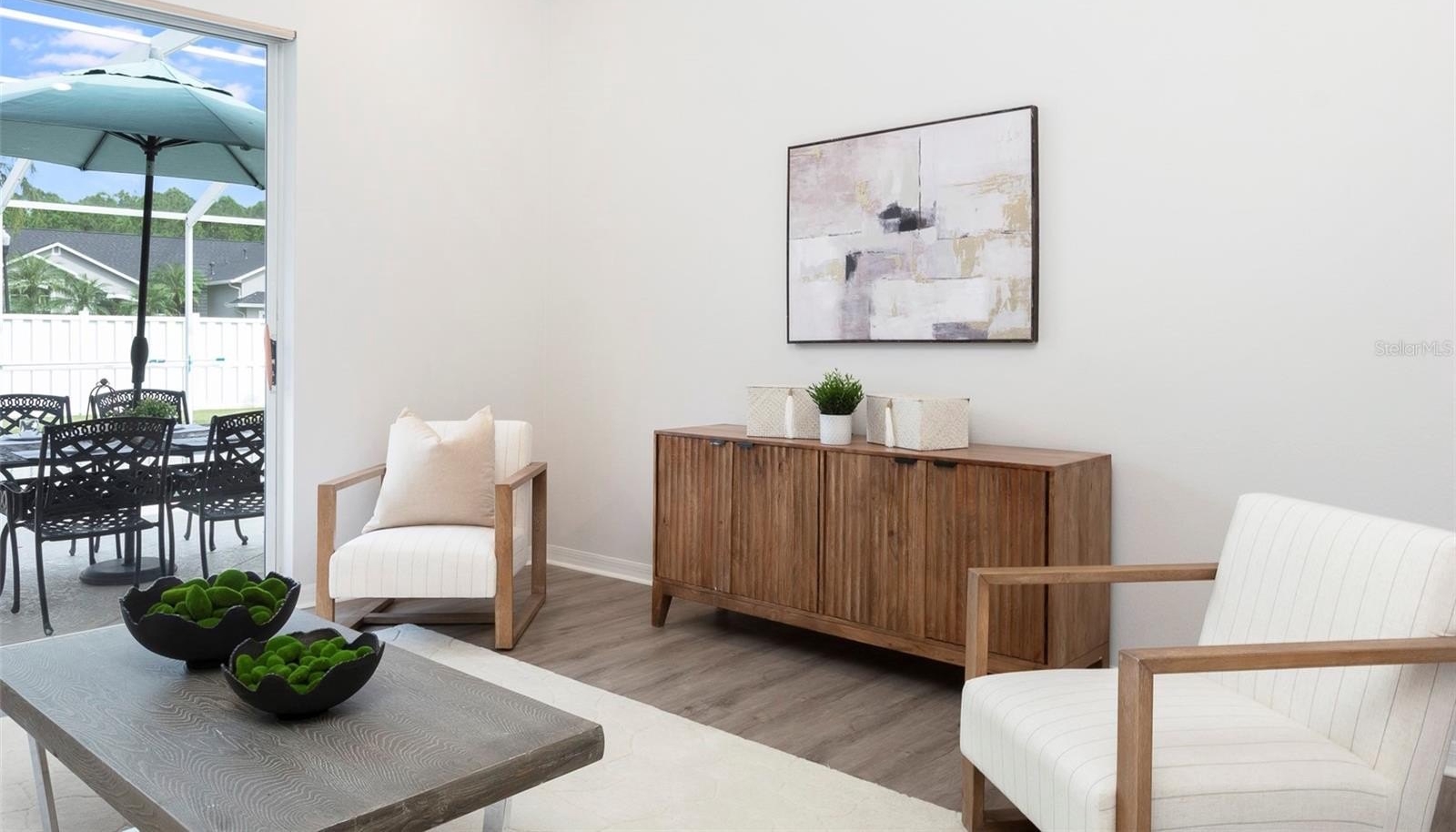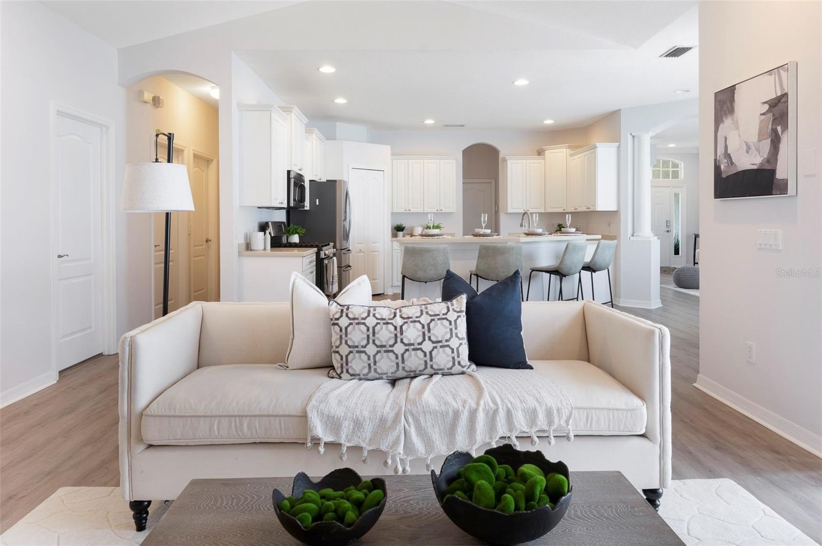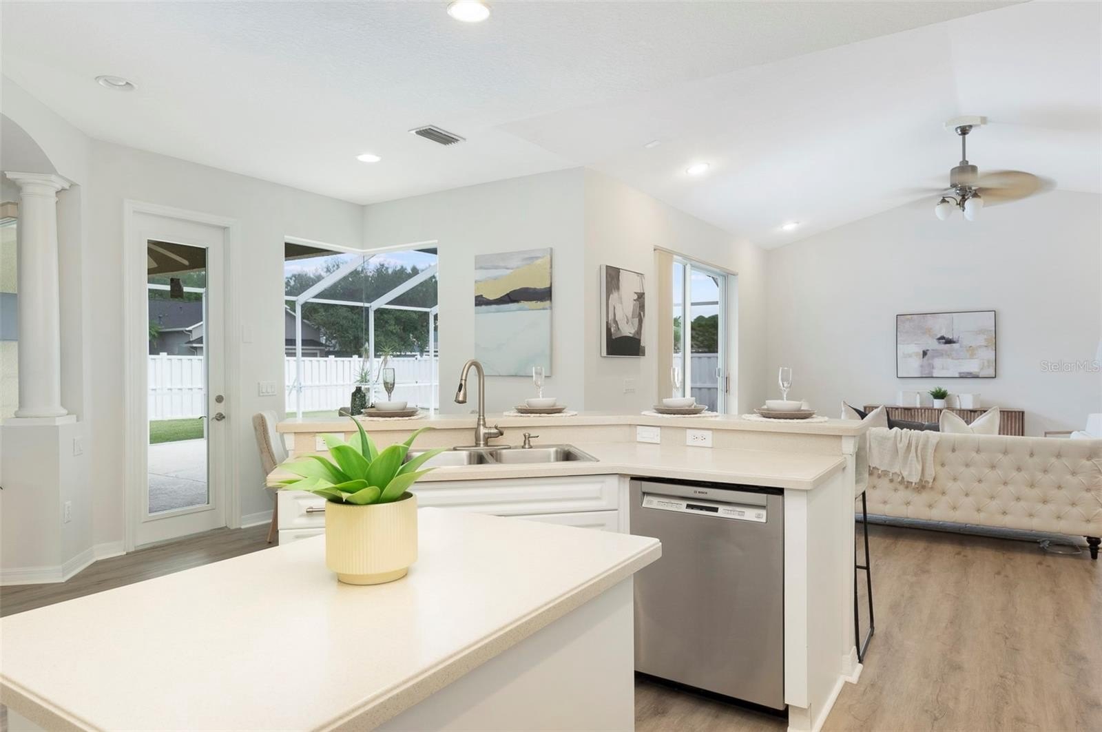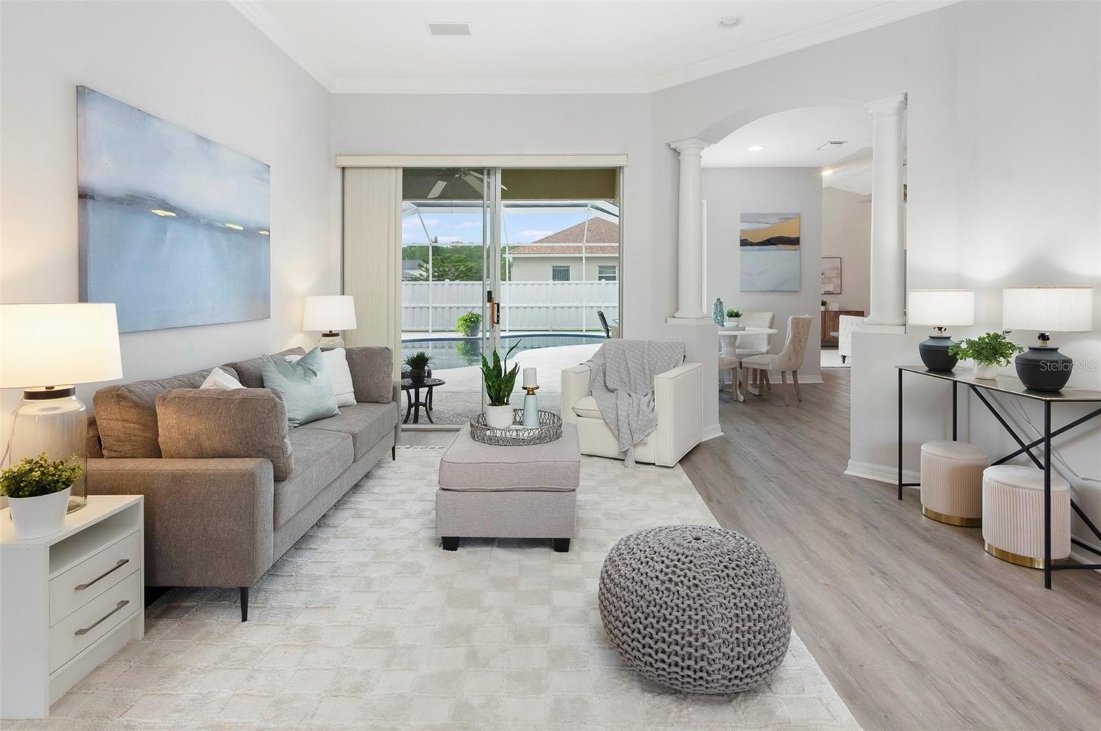 At the heart of the home, the kitchen shines as a true gathering place. Crisp white cabinetry, stainless steel appliances, a spacious center island, and plenty of counter space make it as functional as it is beautiful. Whether preparing a casual meal or hosting a holiday dinner, this kitchen will inspire. Just steps away, the family room with its tall ceilings offers an inviting space to relax, with views that draw you right out to the lanai and pool area.