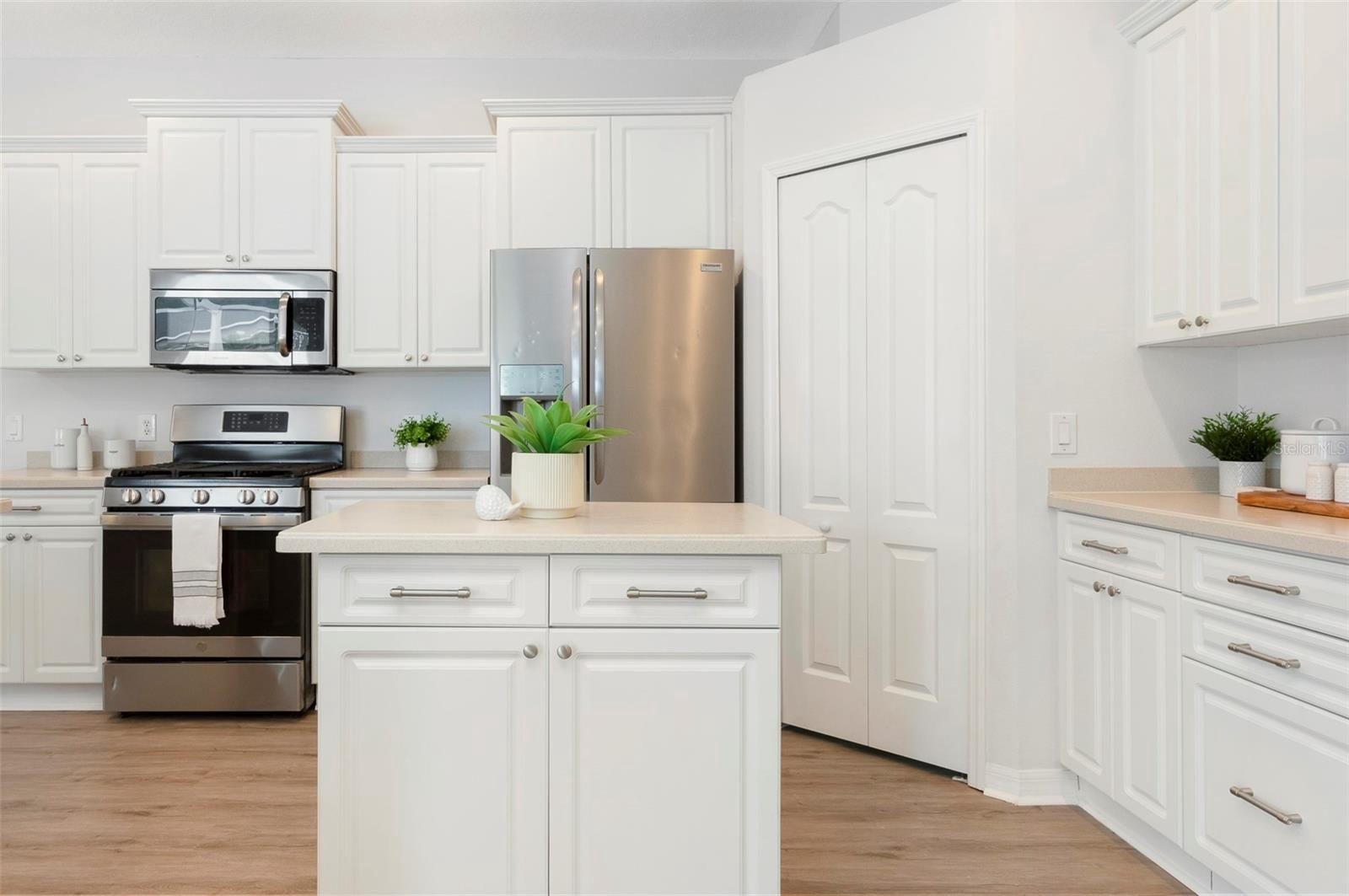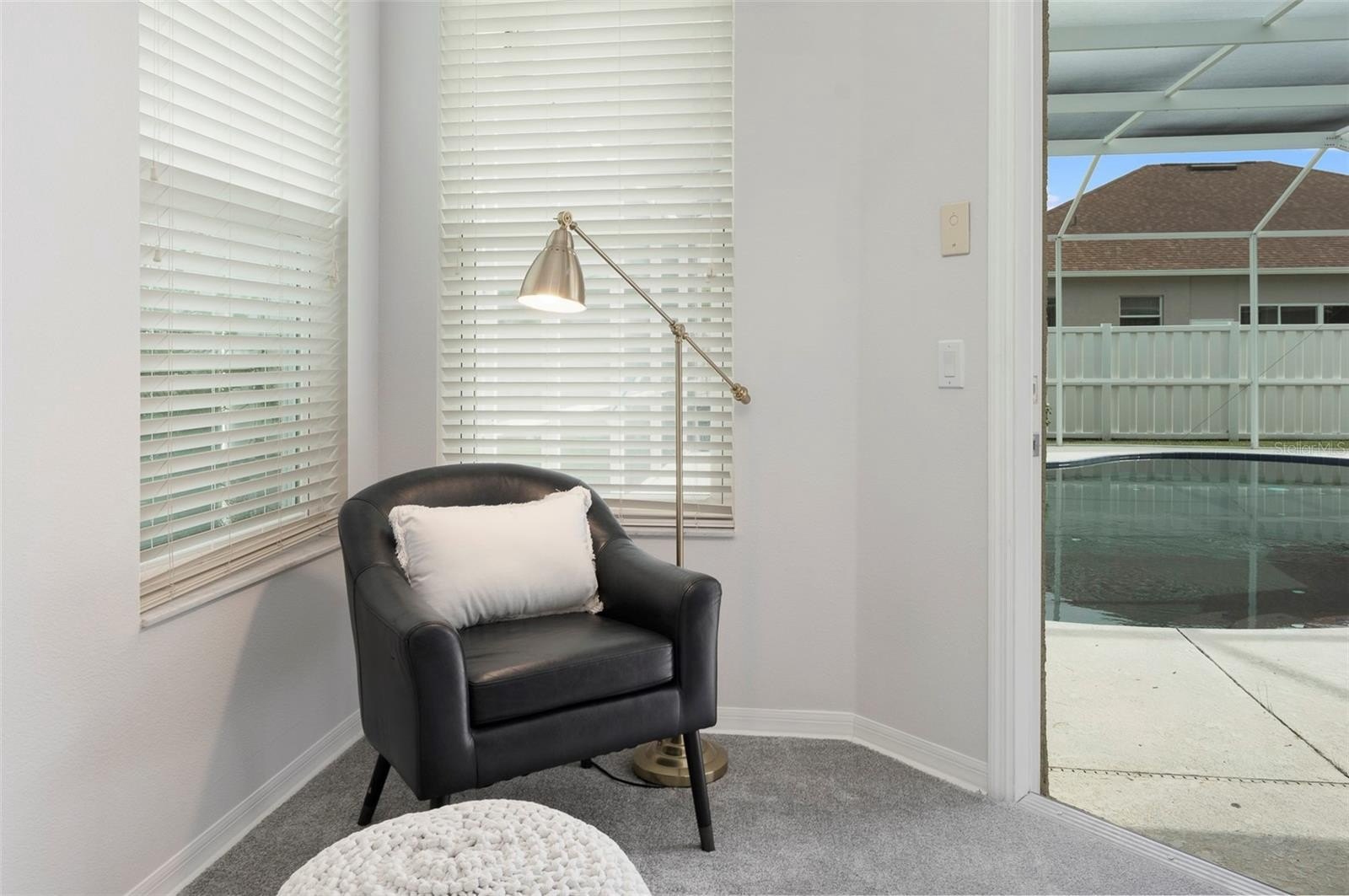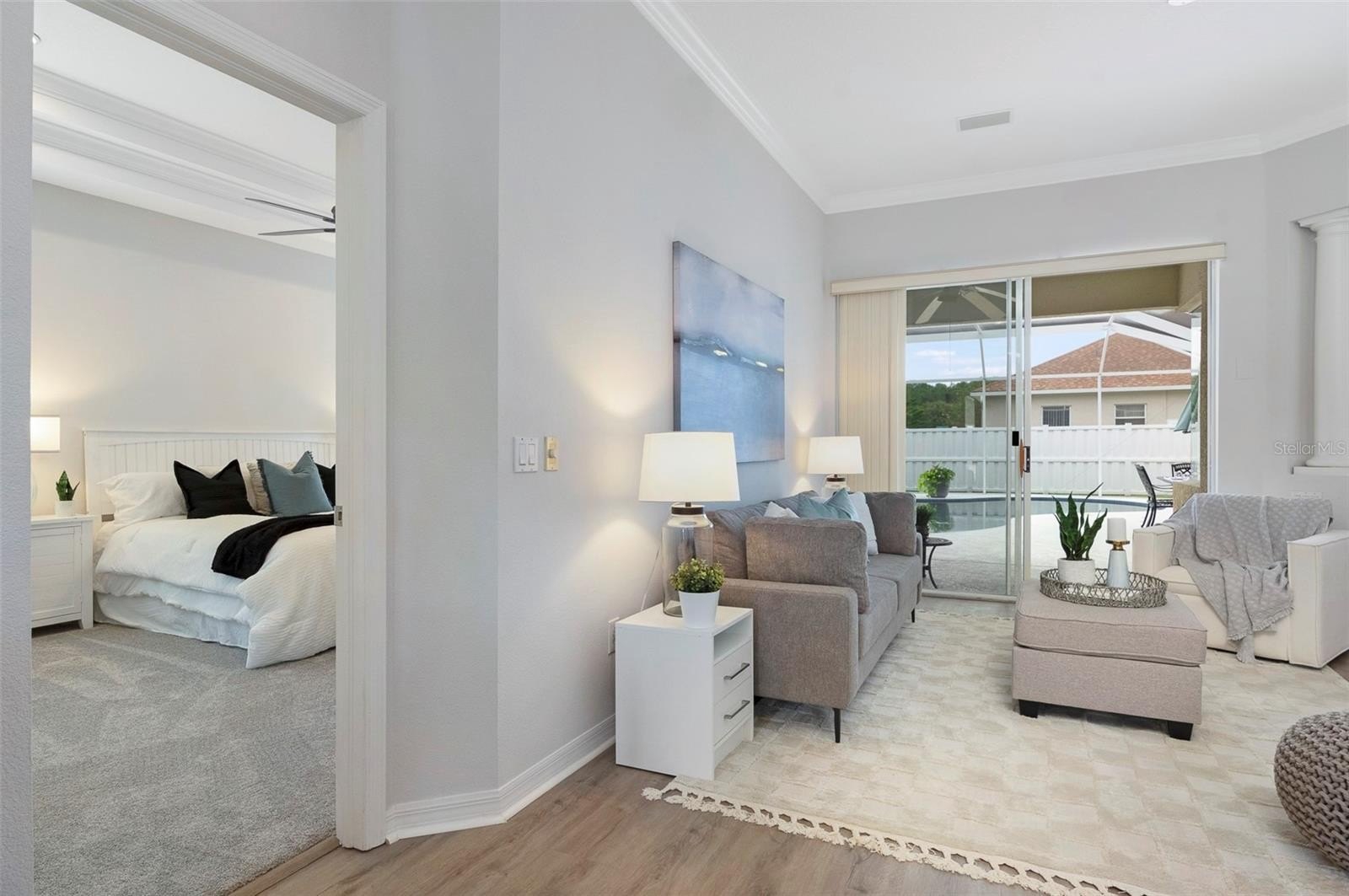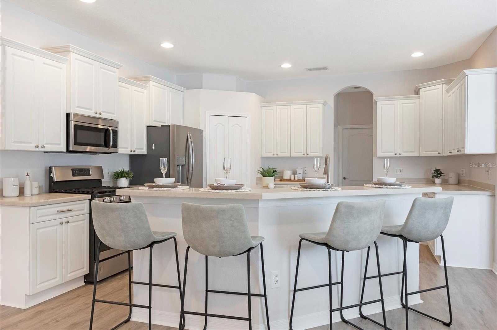 At the heart of the home, the kitchen shines as a true gathering place. Crisp white cabinetry, stainless steel appliances, a spacious center island, and plenty of counter space make it as functional as it is beautiful. Whether preparing a casual meal or hosting a holiday dinner, this kitchen will inspire. Just steps away, the family room with its tall ceilings offers an inviting space to relax, with views that draw you right out to the lanai and pool area.