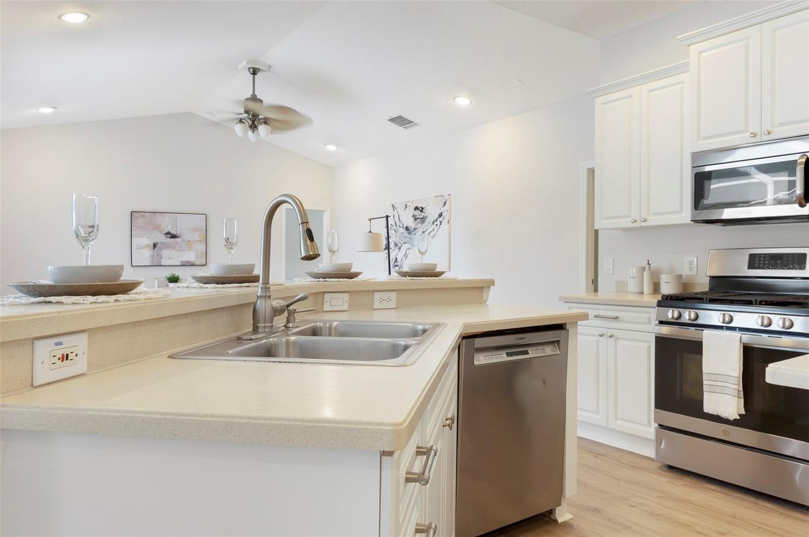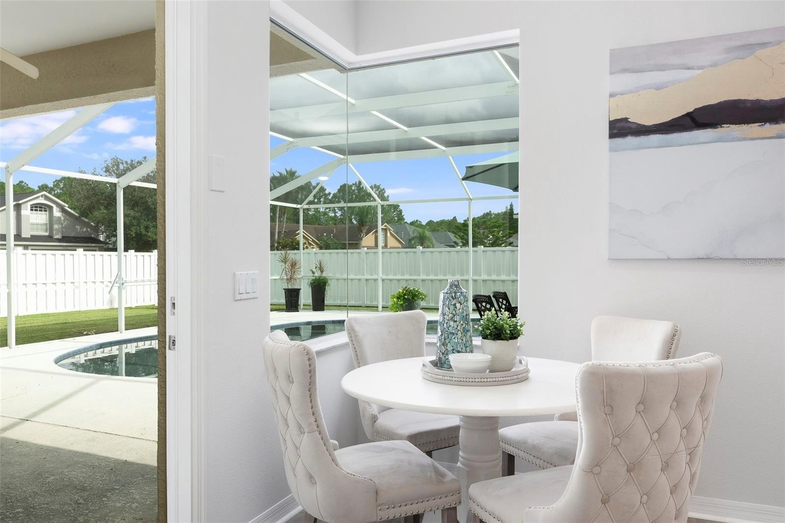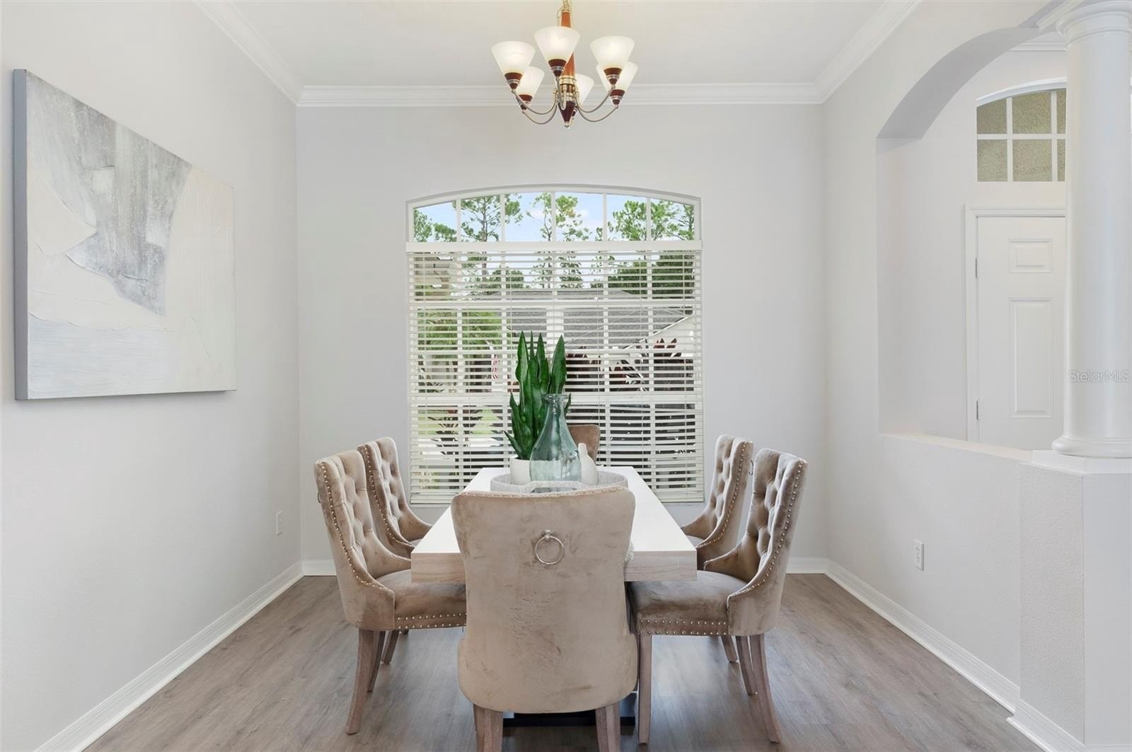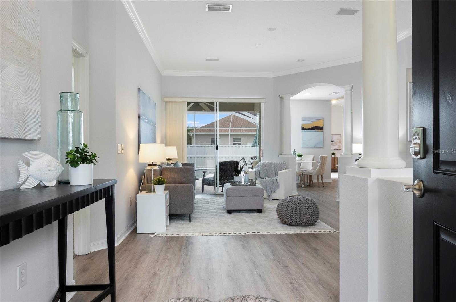 At the heart of the home, the kitchen shines as a true gathering place. Crisp white cabinetry, stainless steel appliances, a spacious center island, and plenty of counter space make it as functional as it is beautiful. Whether preparing a casual meal or hosting a holiday dinner, this kitchen will inspire. Just steps away, the family room with its tall ceilings offers an inviting space to relax, with views that draw you right out to the lanai and pool area.