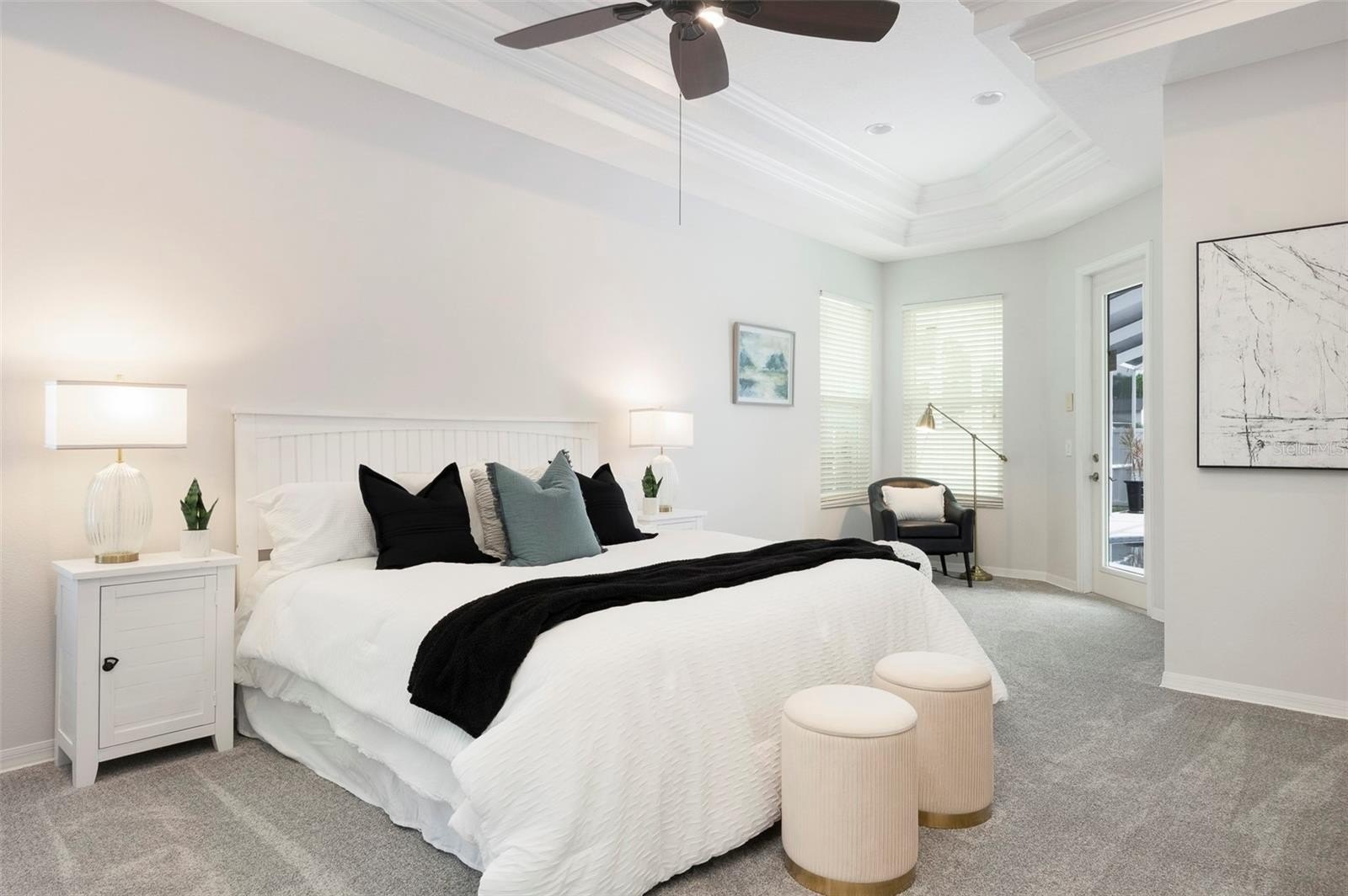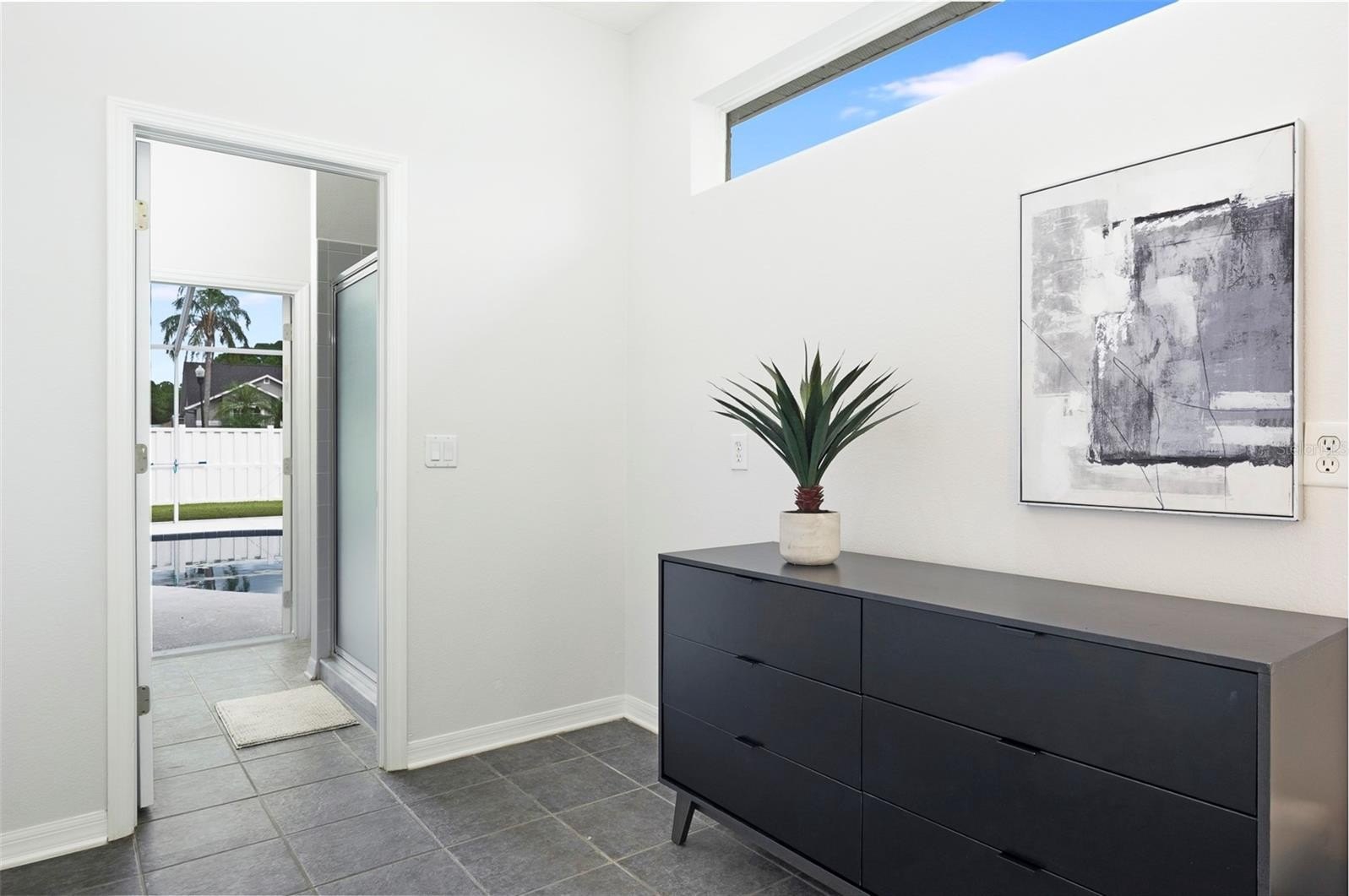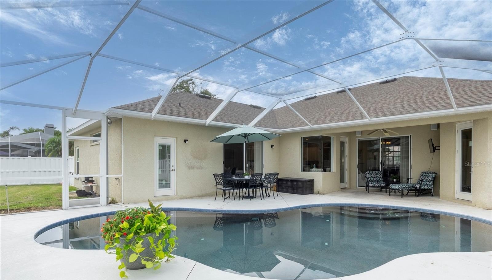 The master suite is a retreat of its own, featuring two walk-in closets, lanai access, and a large bathroom complete with dual vanities, a soaking tub, water closet and an oversized shower. Additional bedrooms are generously sized, and the fourth bedroom—with its own private bath—also doubles as the pool bath, making it ideal for guests or extended family.