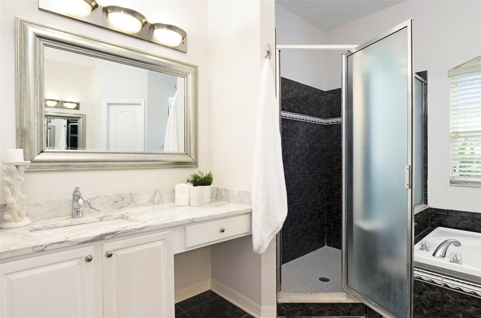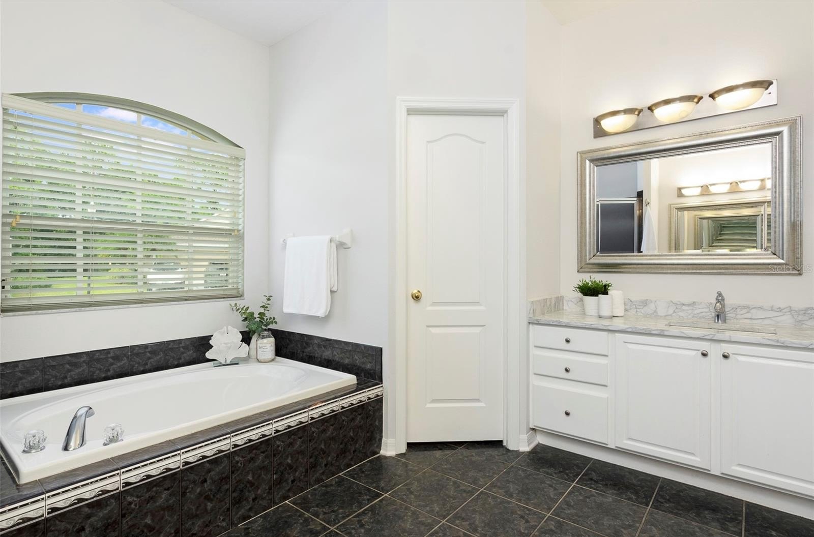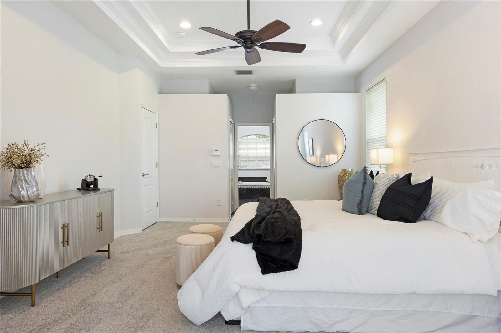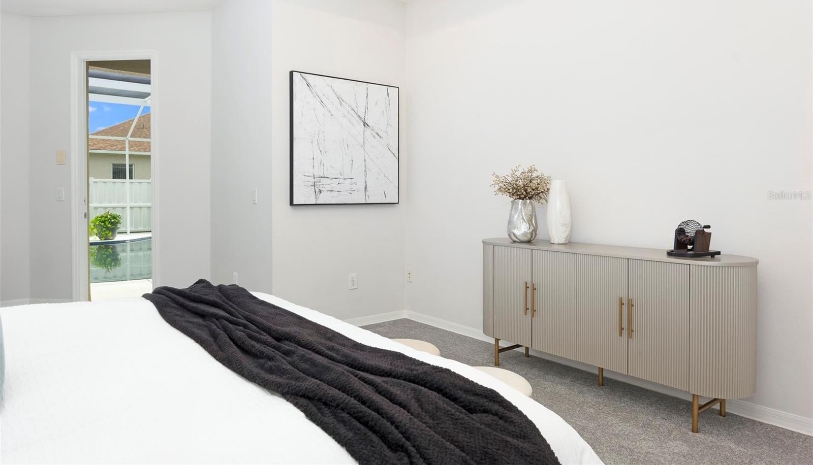 The master suite is a retreat of its own, featuring two walk-in closets, lanai access, and a large bathroom complete with dual vanities, a soaking tub, water closet and an oversized shower. Additional bedrooms are generously sized, and the fourth bedroom—with its own private bath—also doubles as the pool bath, making it ideal for guests or extended family.