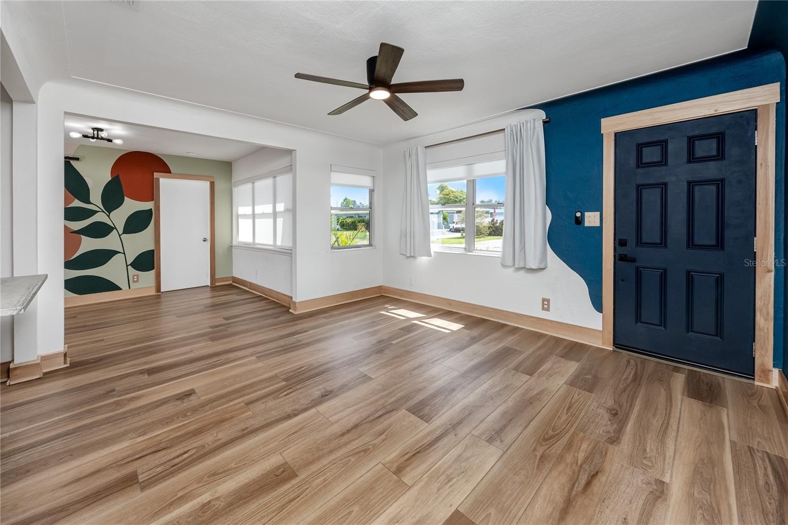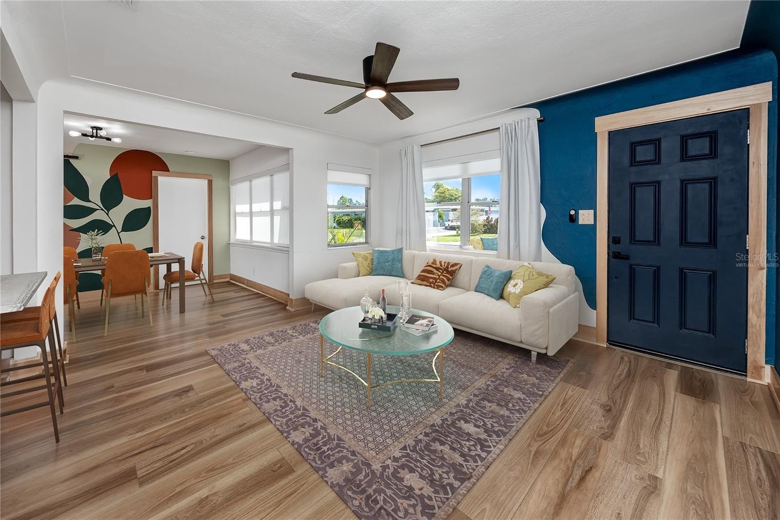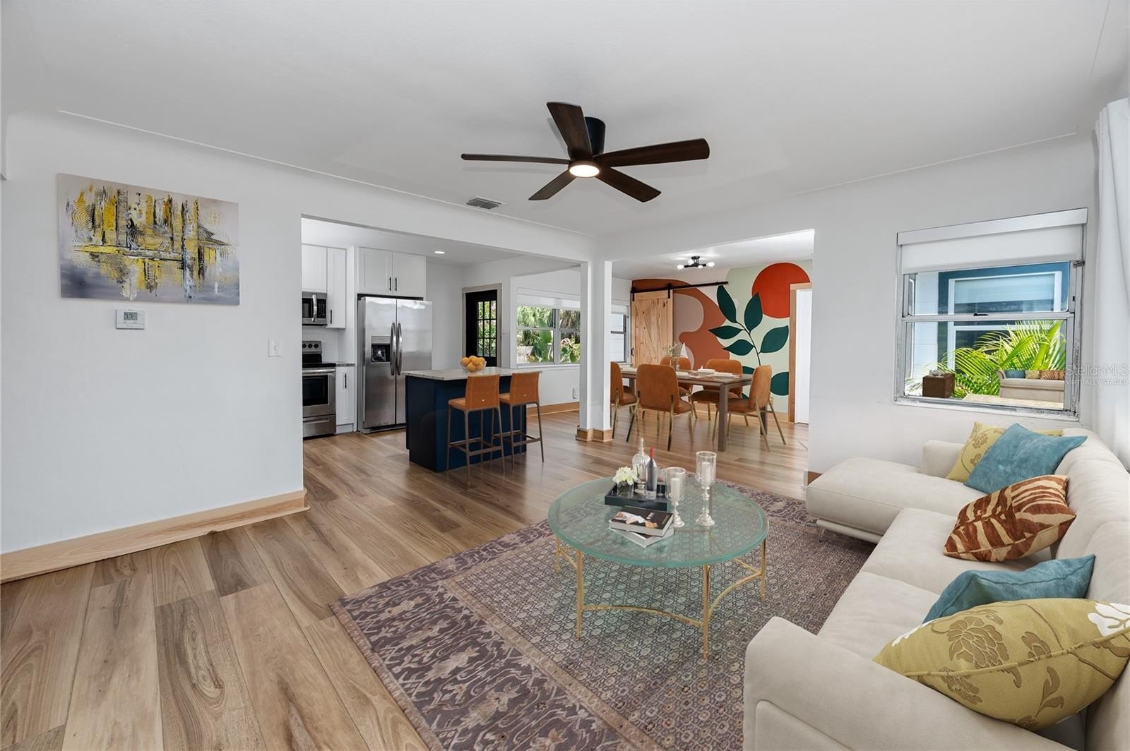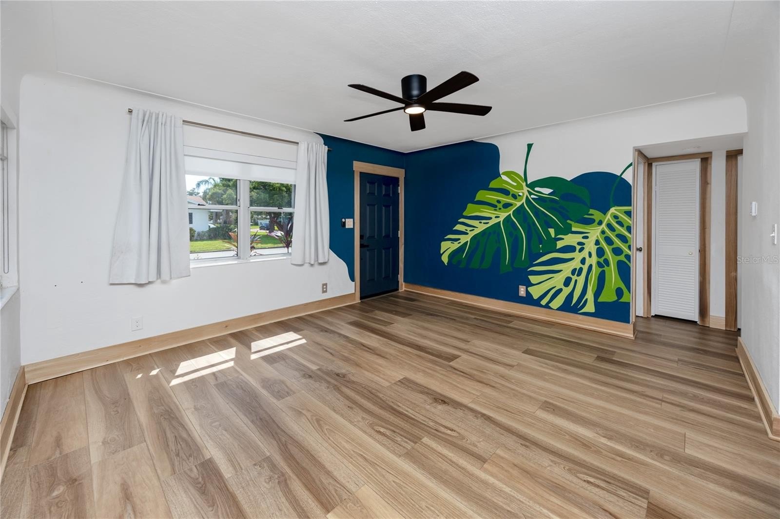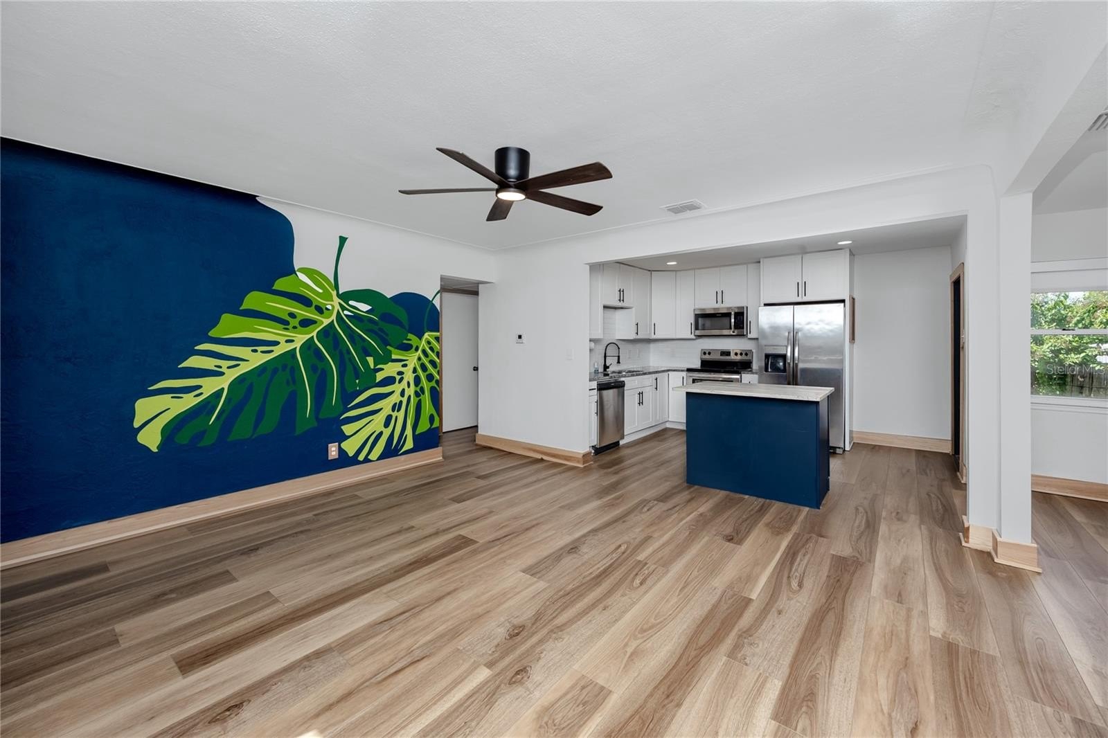 Inside, the 1,170 sq. ft. open floor plan is bright and inviting, with large windows, fresh paint, and chic tropical accent murals enhancing the home’s boho-meets-mid-century aesthetic. Low-maintenance luxury vinyl plank flooring, updated ceiling fans, and thoughtful details create a space that’s both stylish and functional.