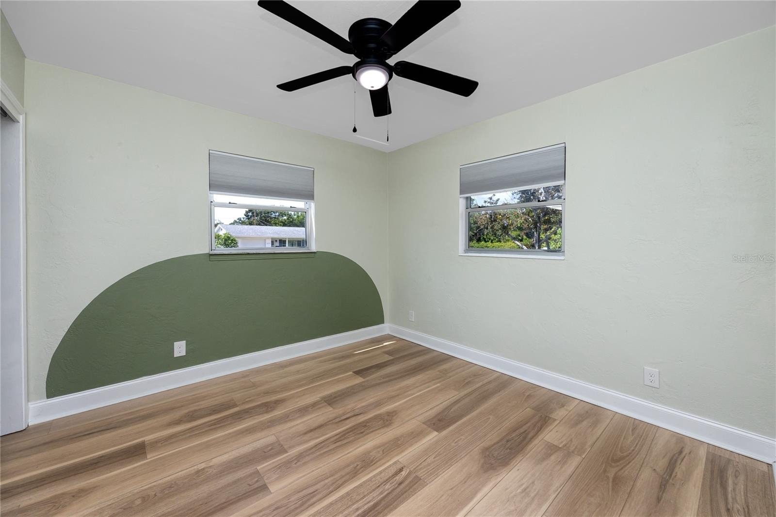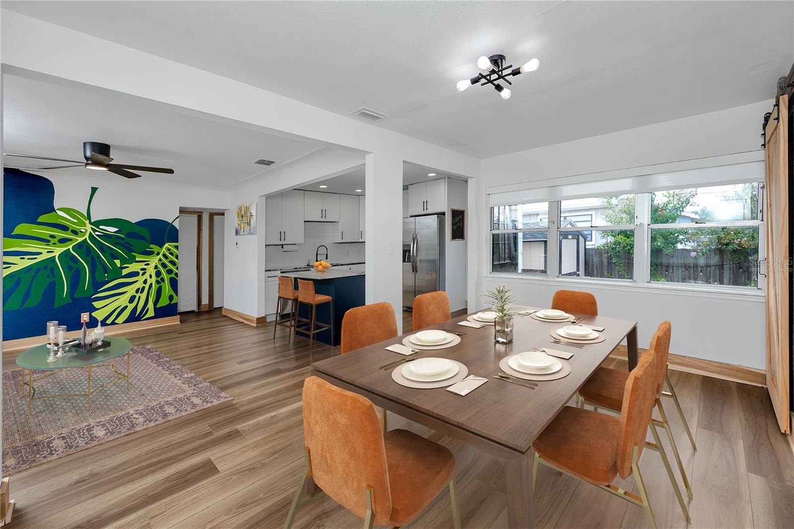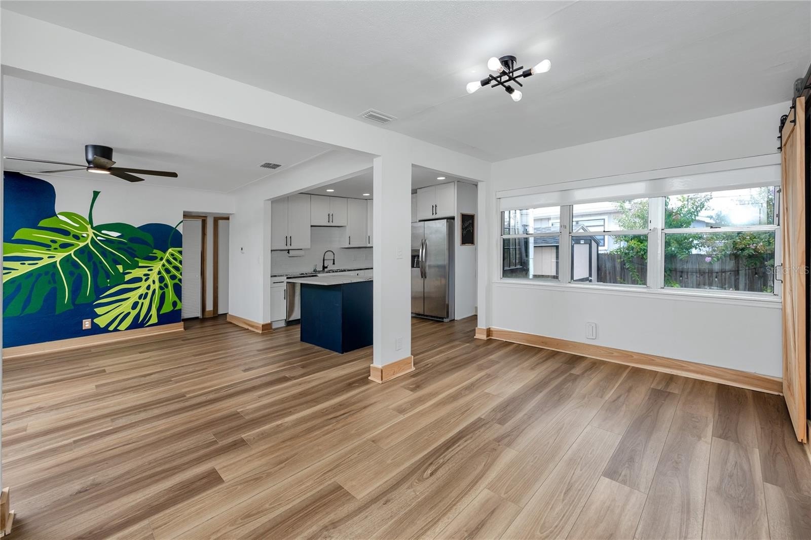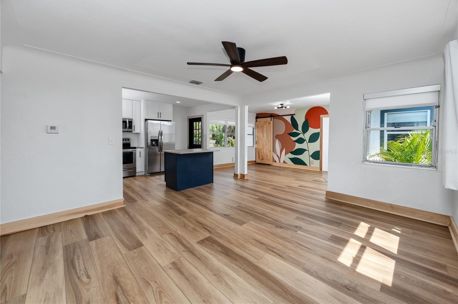 Inside, the 1,170 sq. ft. open floor plan is bright and inviting, with large windows, fresh paint, and chic tropical accent murals enhancing the home’s boho-meets-mid-century aesthetic. Low-maintenance luxury vinyl plank flooring, updated ceiling fans, and thoughtful details create a space that’s both stylish and functional.