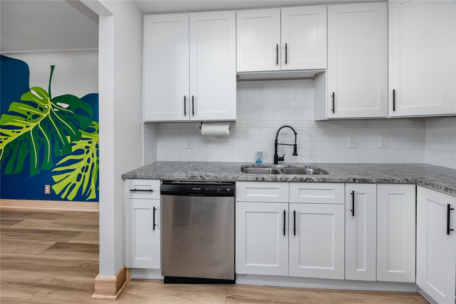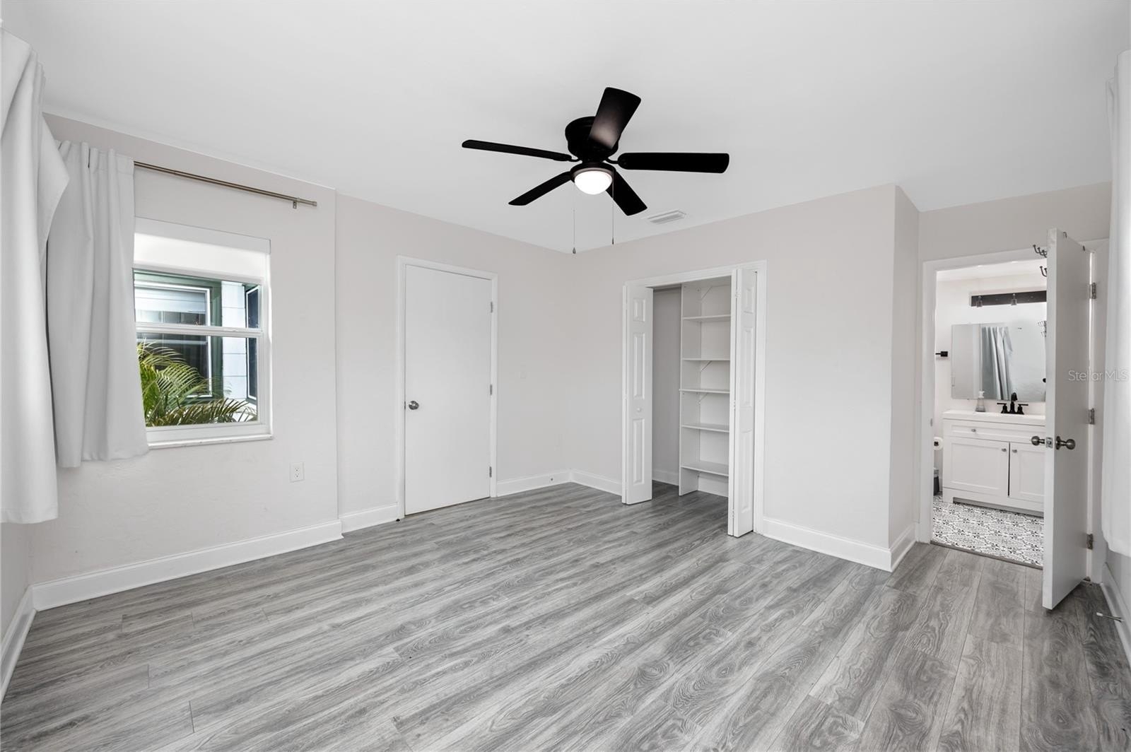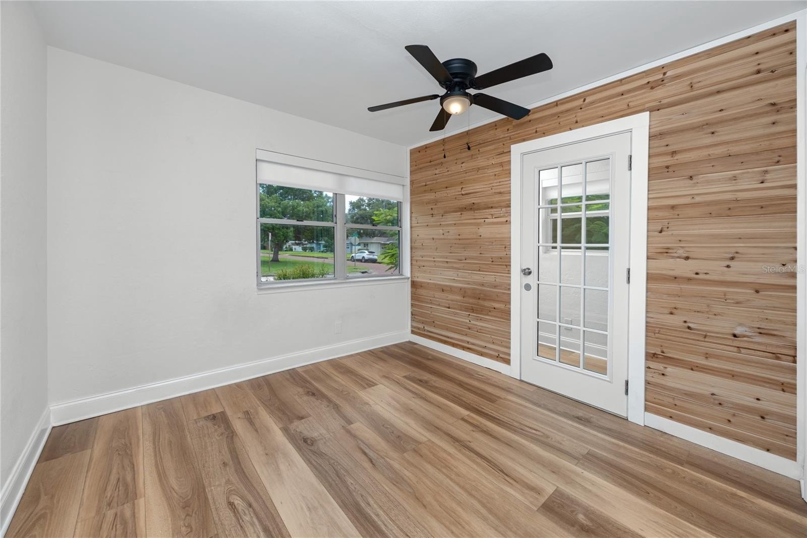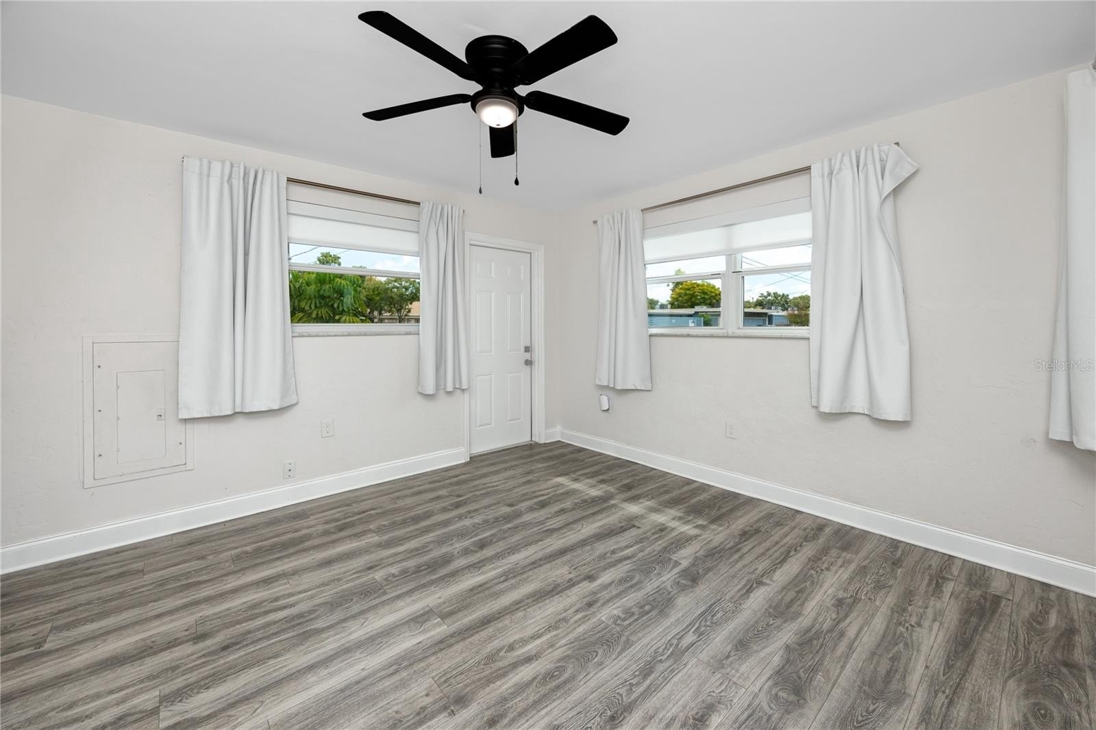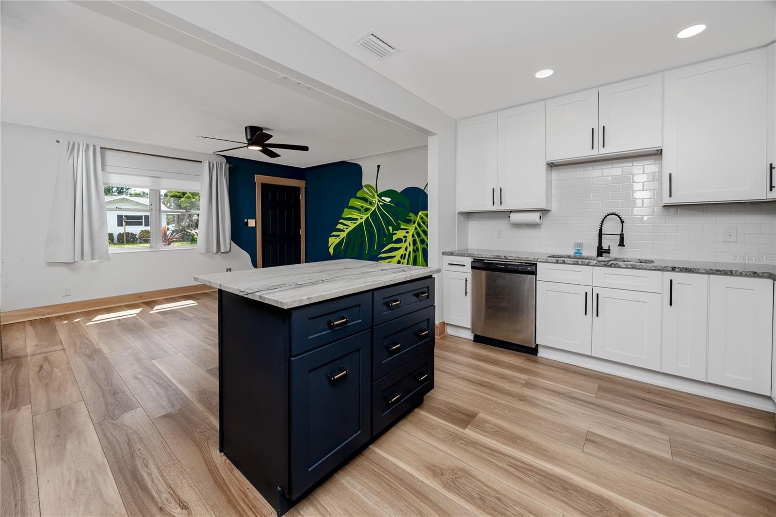 Inside, the 1,170 sq. ft. open floor plan is bright and inviting, with large windows, fresh paint, and chic tropical accent murals enhancing the home’s boho-meets-mid-century aesthetic. Low-maintenance luxury vinyl plank flooring, updated ceiling fans, and thoughtful details create a space that’s both stylish and functional.