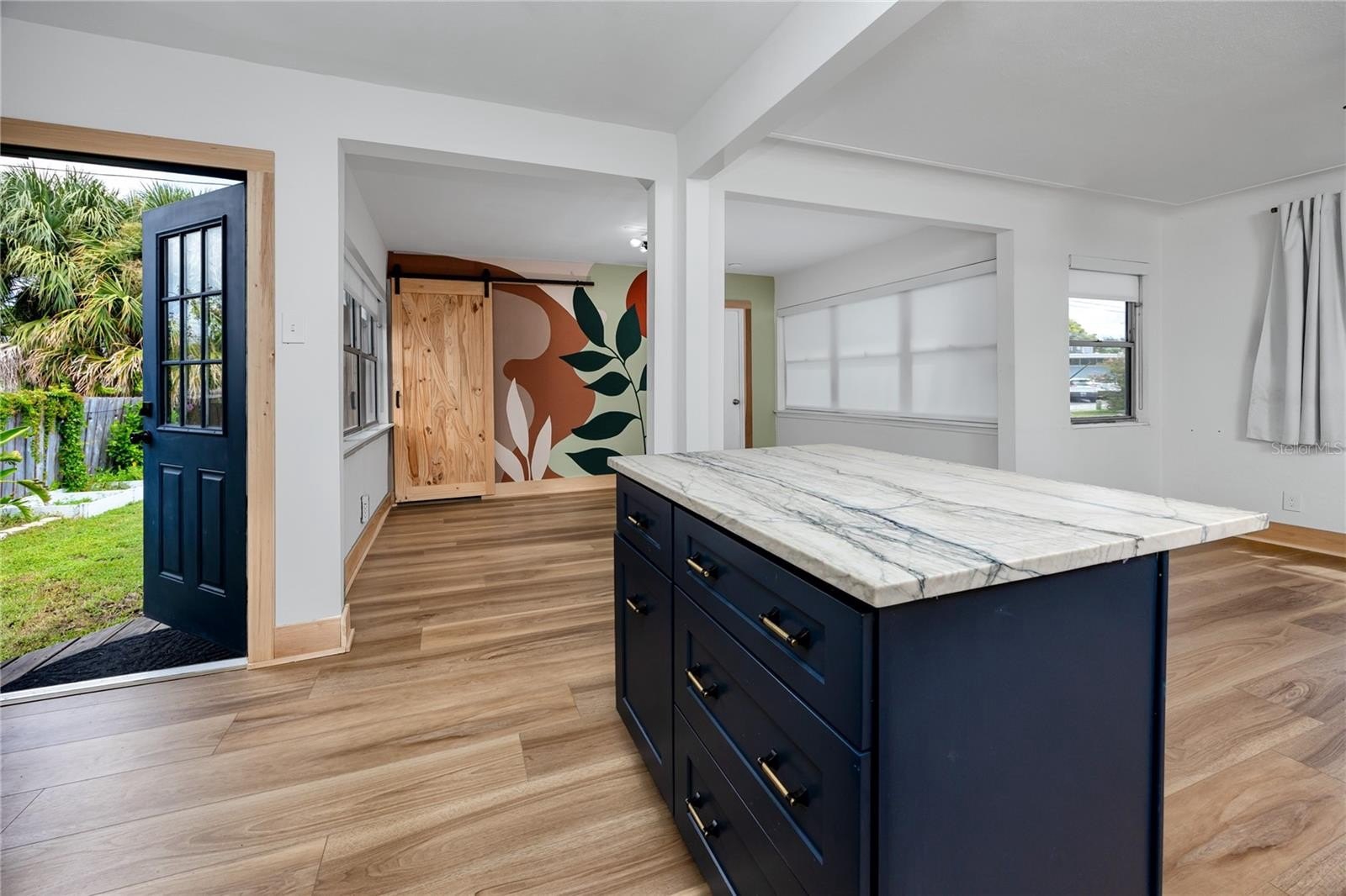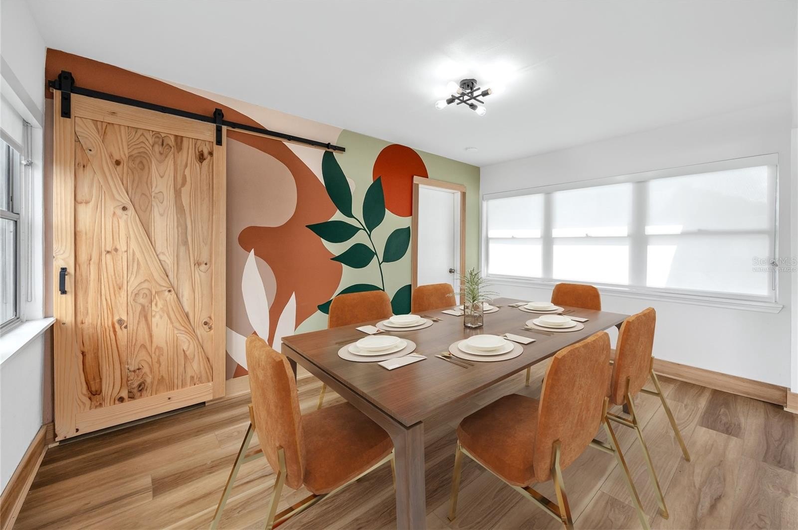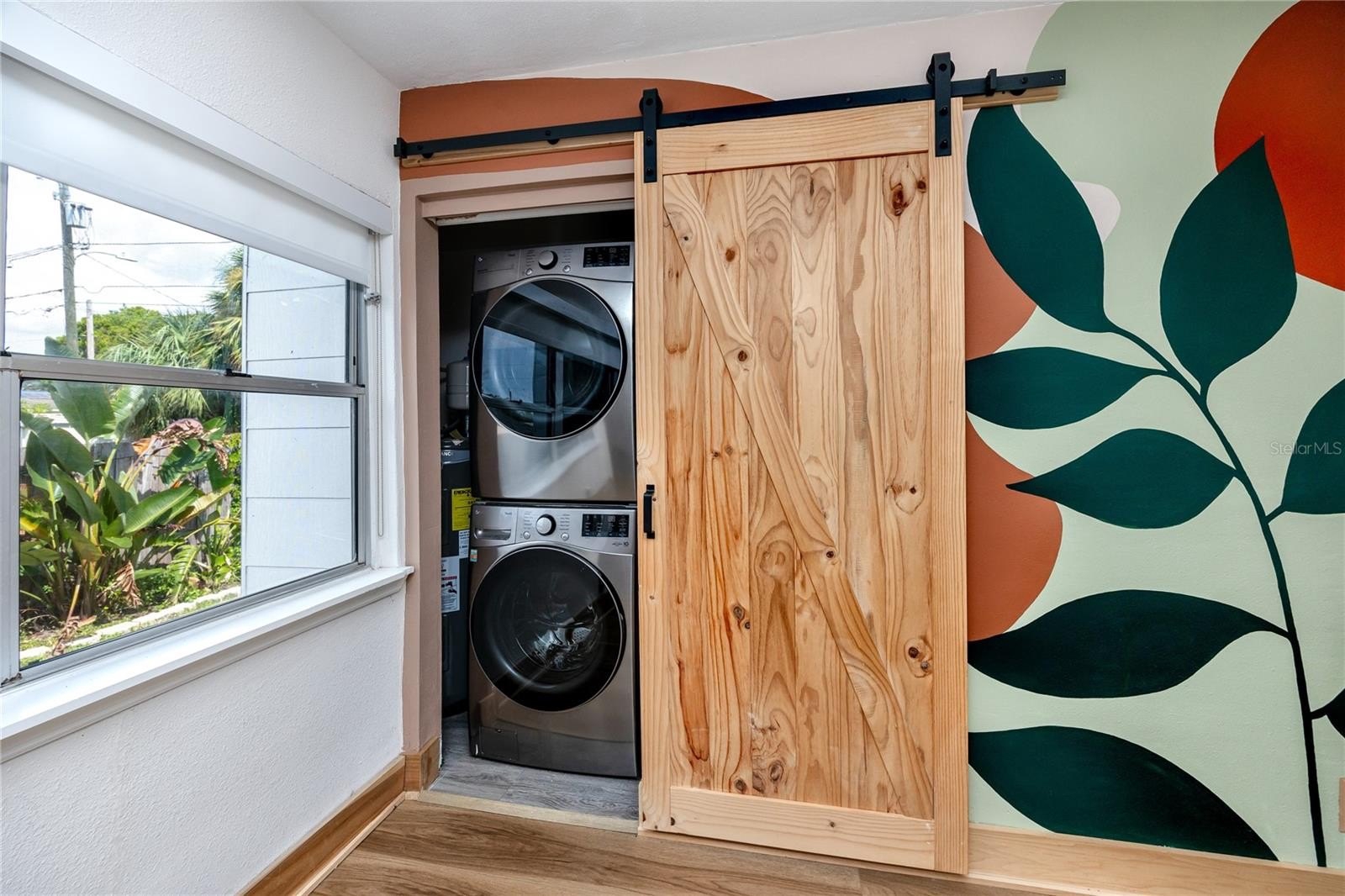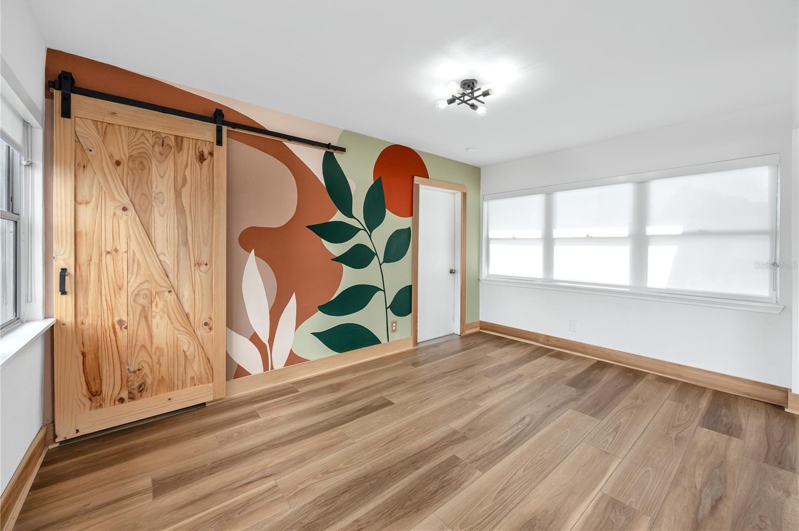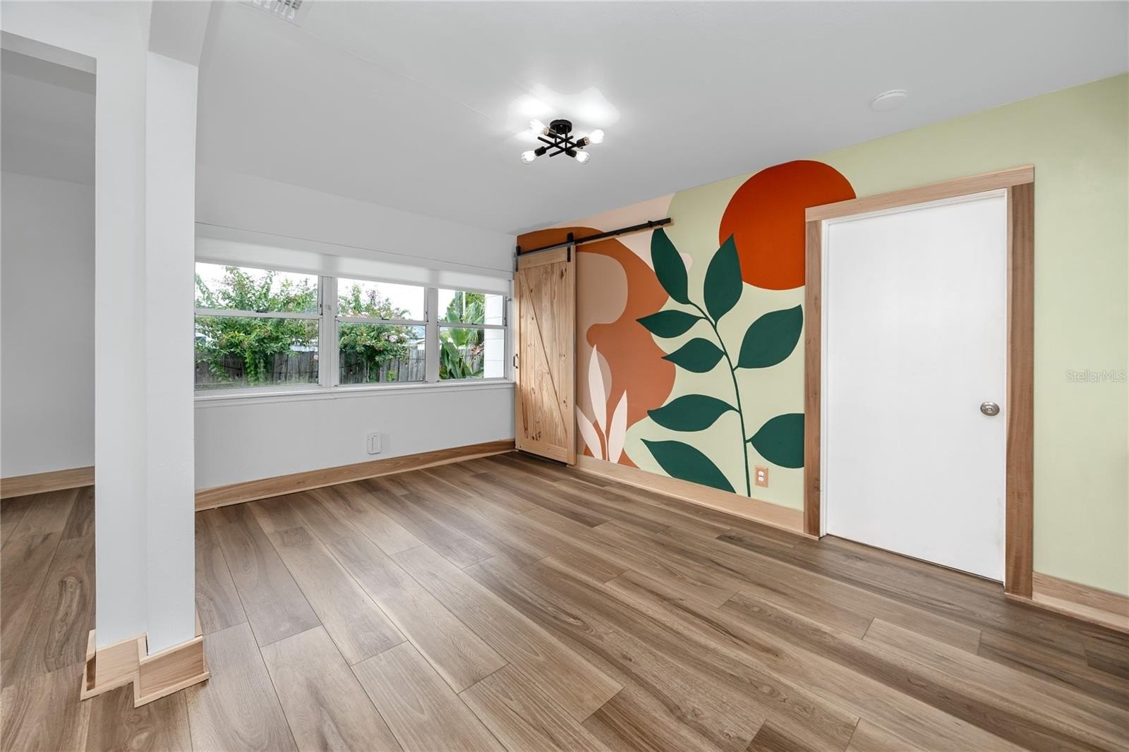 The primary suite includes a spacious closet with built ins, a sleek ensuite bath with a custom-tiled walk-in shower, and private access to the backyard. Two additional bedrooms share a fully updated bath with a tub/shower combo and modern fixtures. The third bedroom’s flex space can easily function as a home office, studio, or oversized walk-in closet with vanity. A charming barn-door laundry closet in the dining room with a full-size ThinQ washer and dryer completes the interior.
