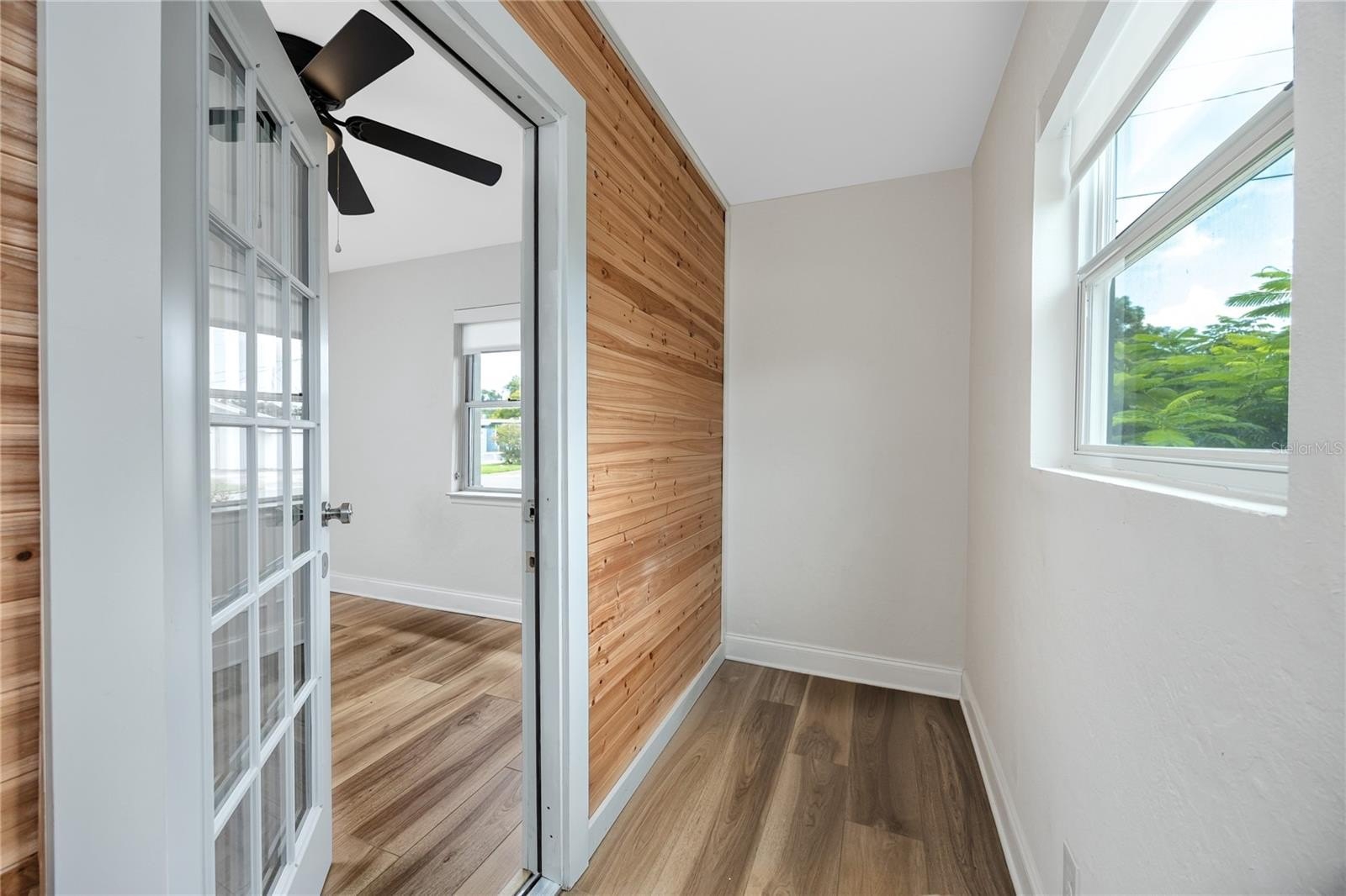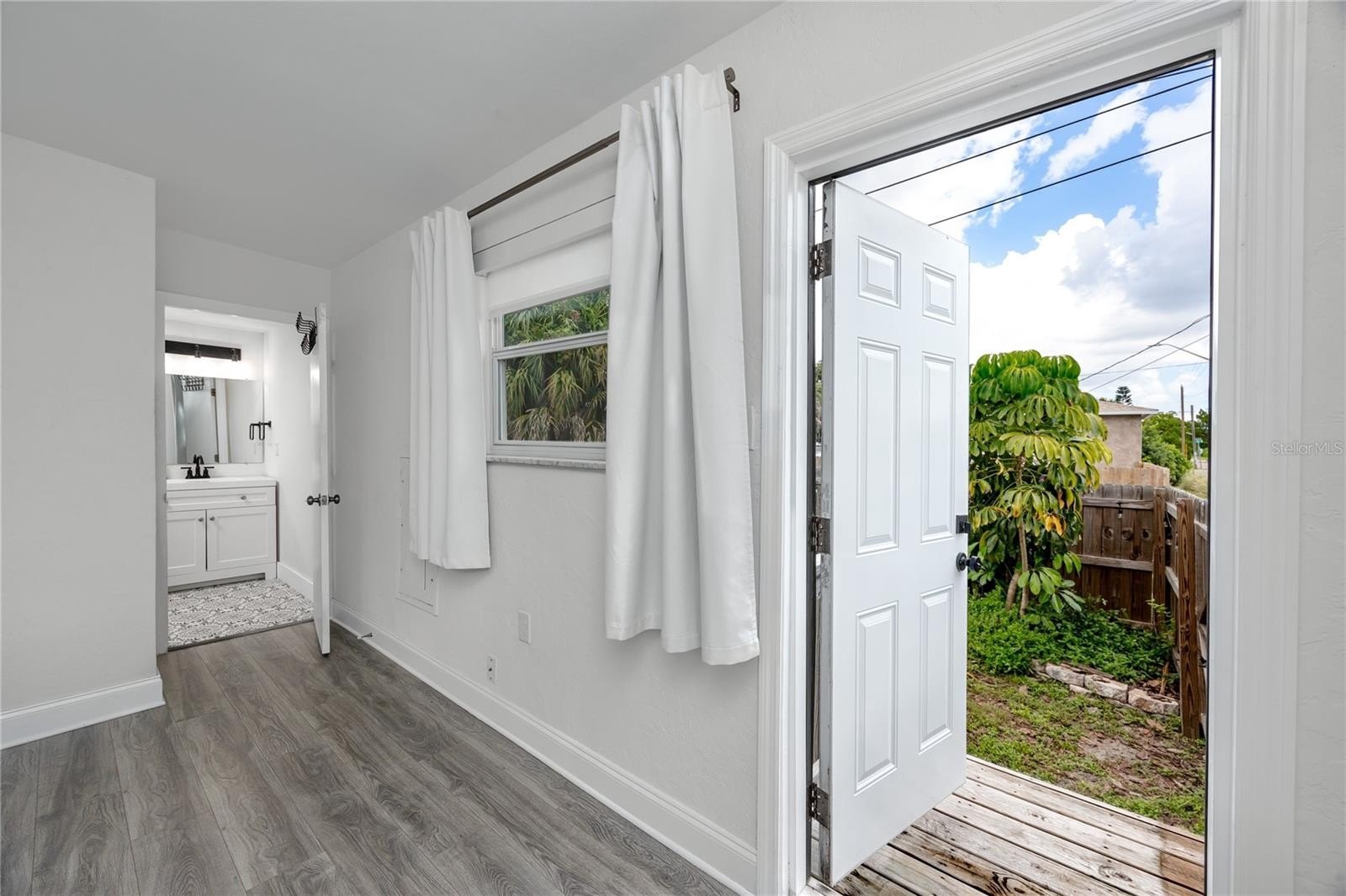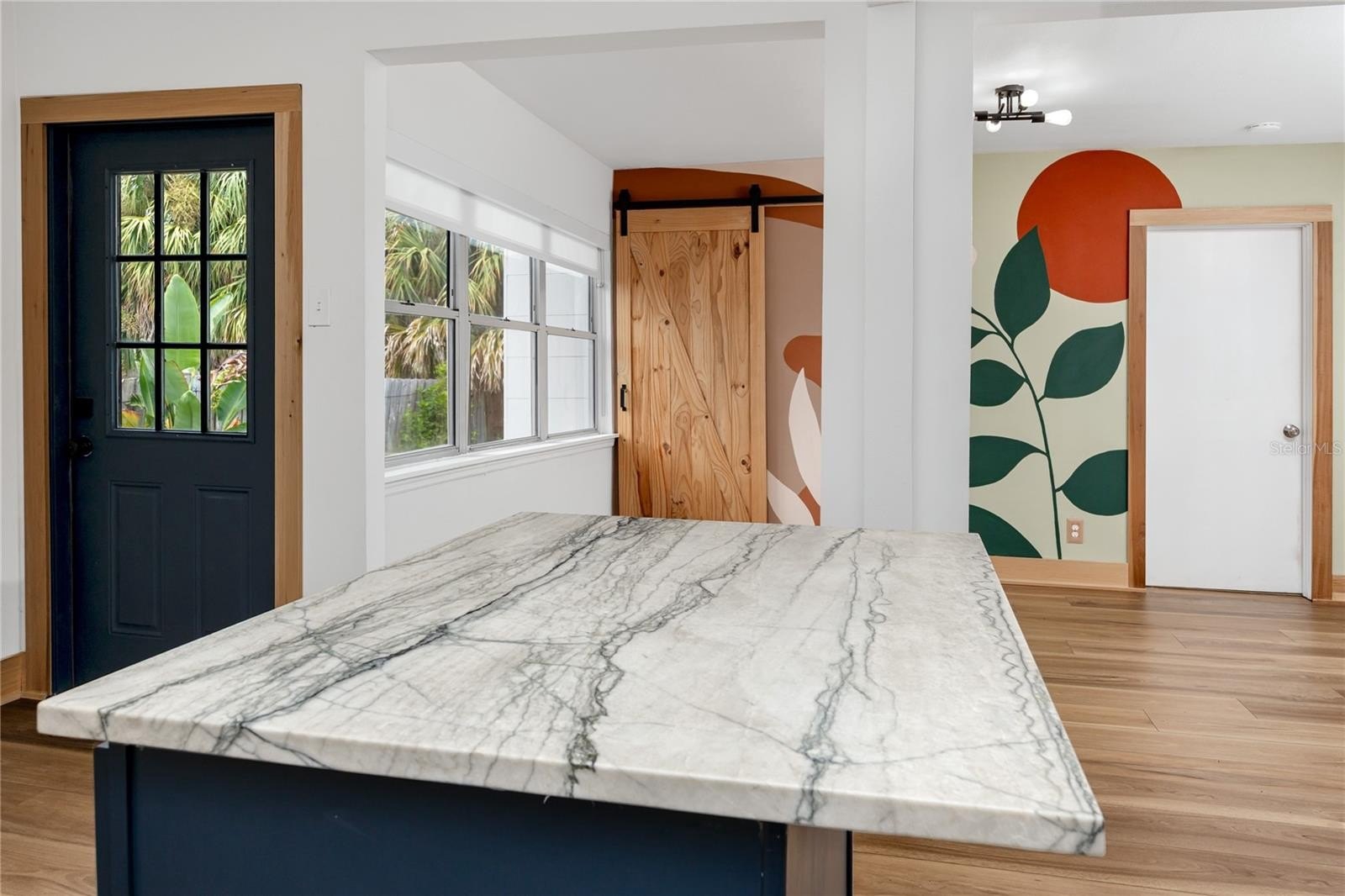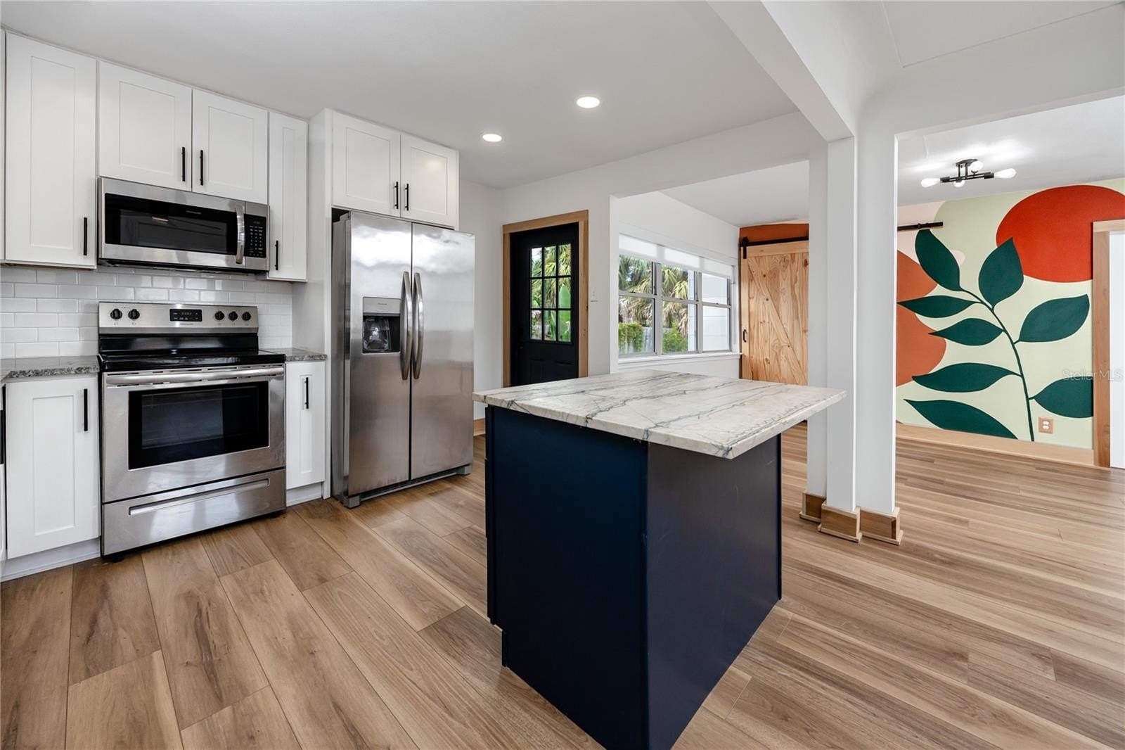 The primary suite includes a spacious closet with built ins, a sleek ensuite bath with a custom-tiled walk-in shower, and private access to the backyard. Two additional bedrooms share a fully updated bath with a tub/shower combo and modern fixtures. The third bedroom’s flex space can easily function as a home office, studio, or oversized walk-in closet with vanity. A charming barn-door laundry closet in the dining room with a full-size ThinQ washer and dryer completes the interior.