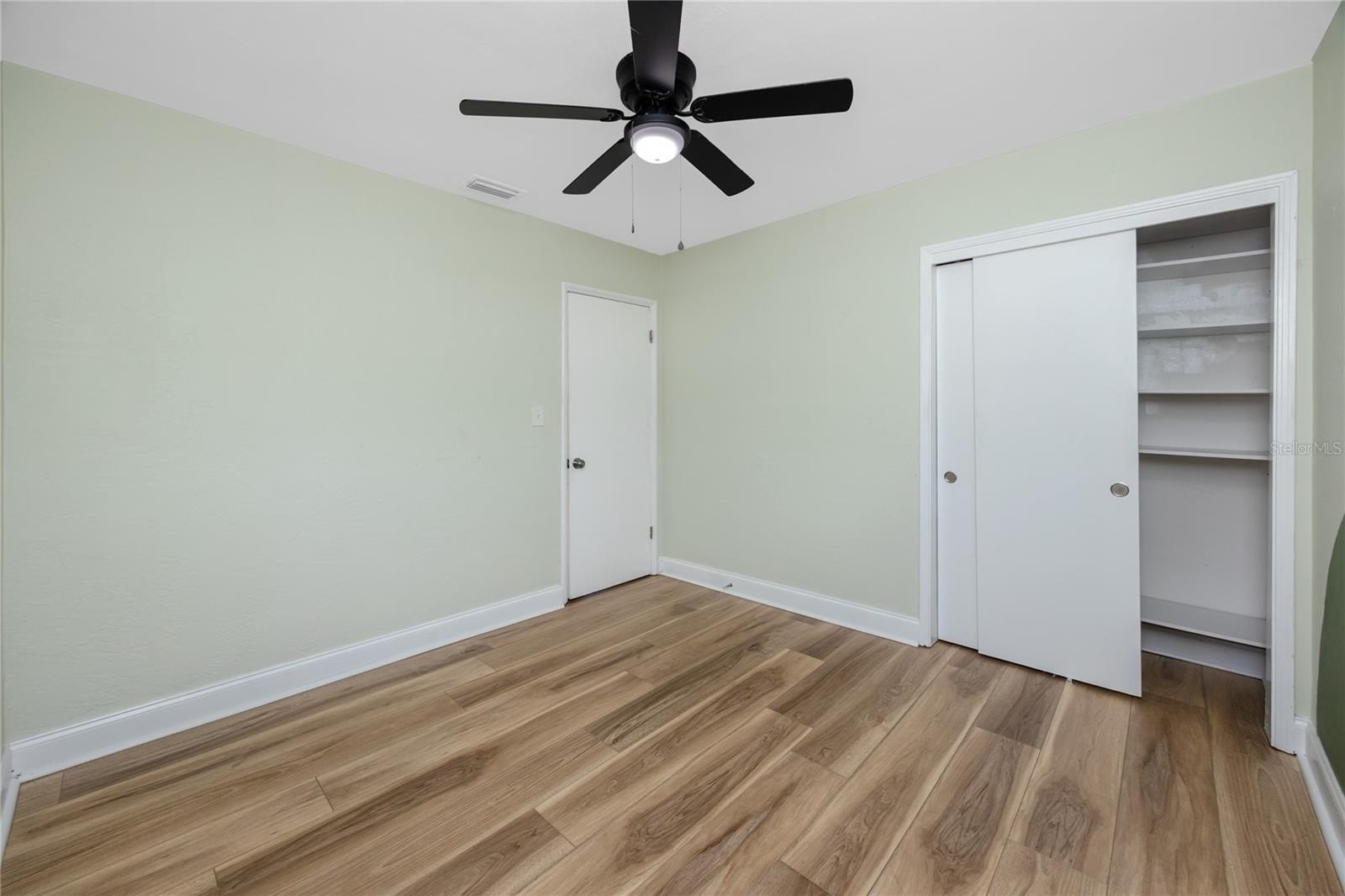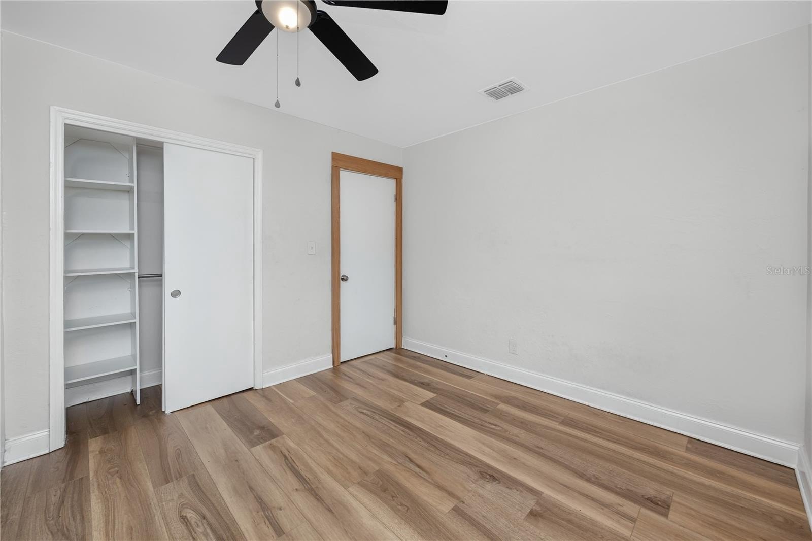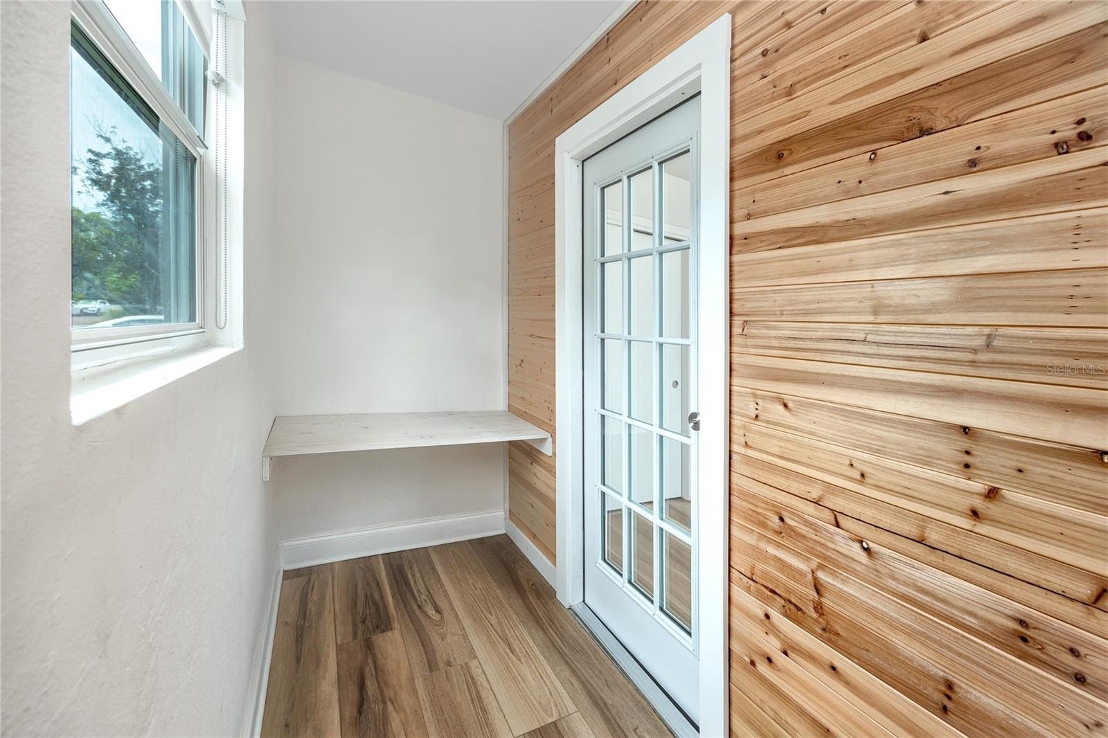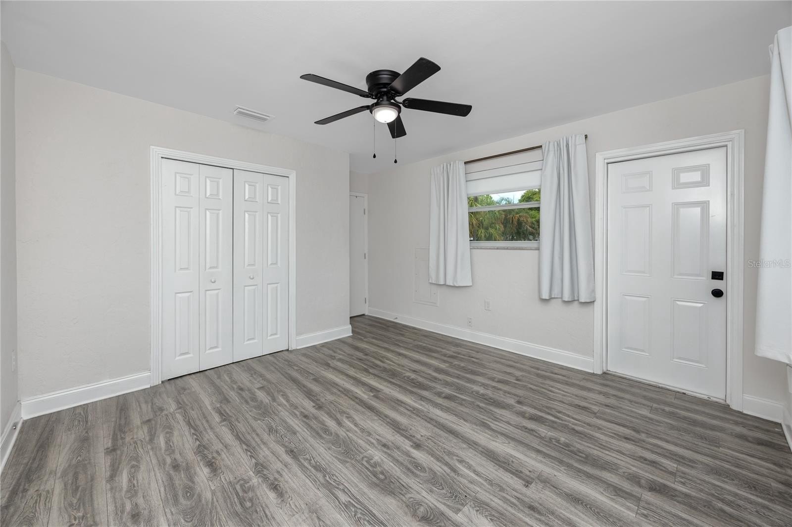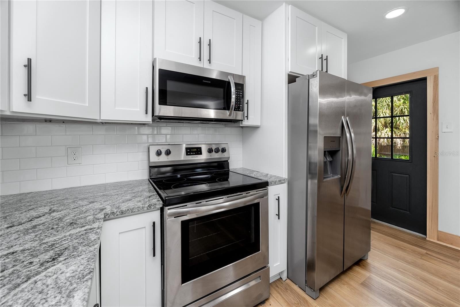 The primary suite includes a spacious closet with built ins, a sleek ensuite bath with a custom-tiled walk-in shower, and private access to the backyard. Two additional bedrooms share a fully updated bath with a tub/shower combo and modern fixtures. The third bedroom’s flex space can easily function as a home office, studio, or oversized walk-in closet with vanity. A charming barn-door laundry closet in the dining room with a full-size ThinQ washer and dryer completes the interior.