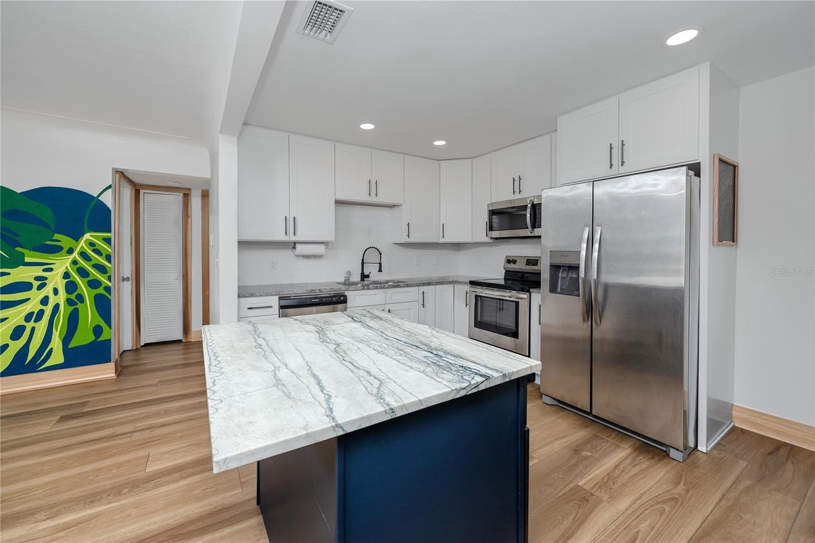 The modern kitchen serves as the centerpiece of the home, showcasing solid wood cabinets, quartz countertops, a central island with breakfast bar and storage, and newer Frigidaire stainless steel appliances. Whether for casual meals or entertaining, this space is designed to impress.